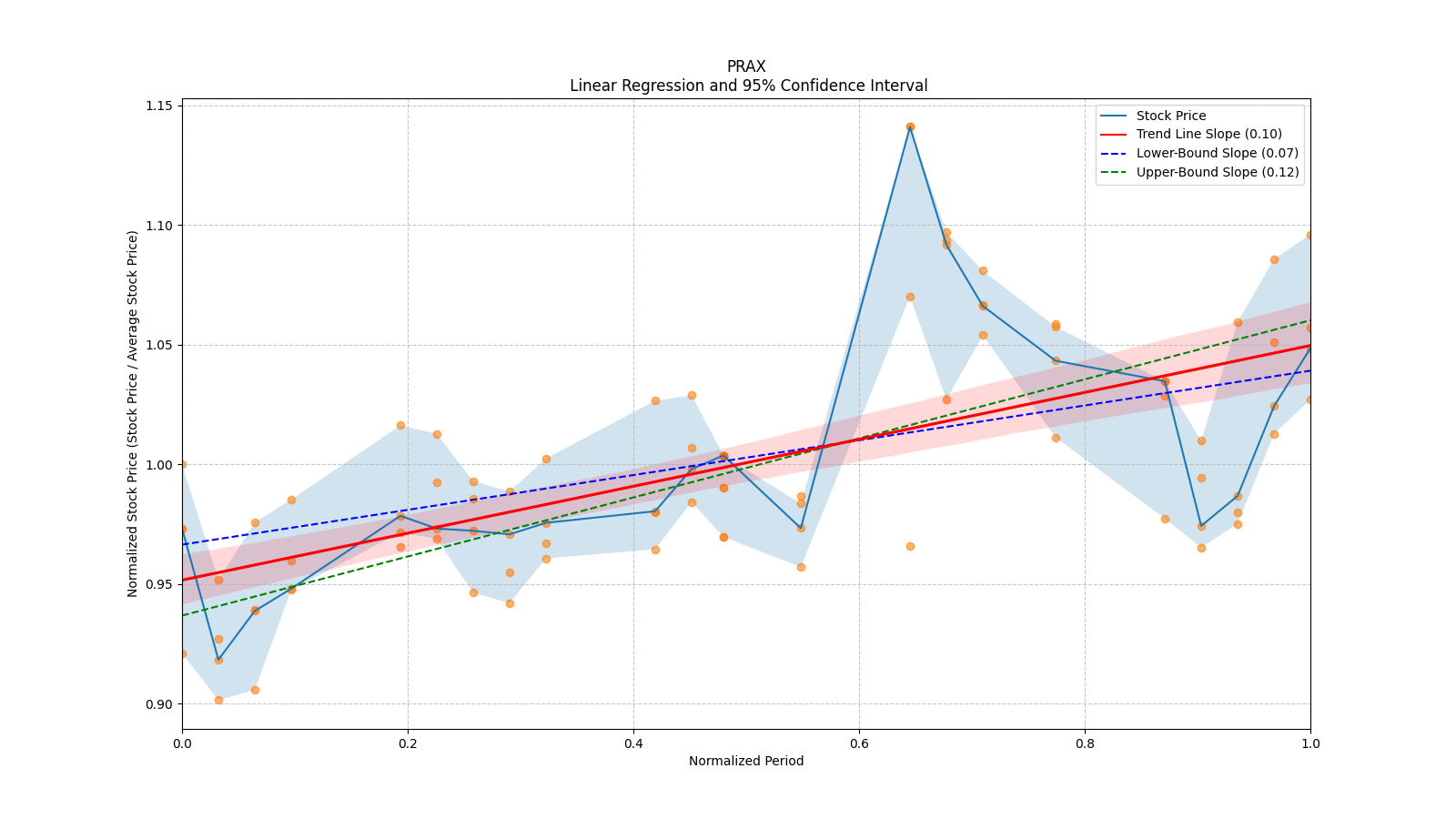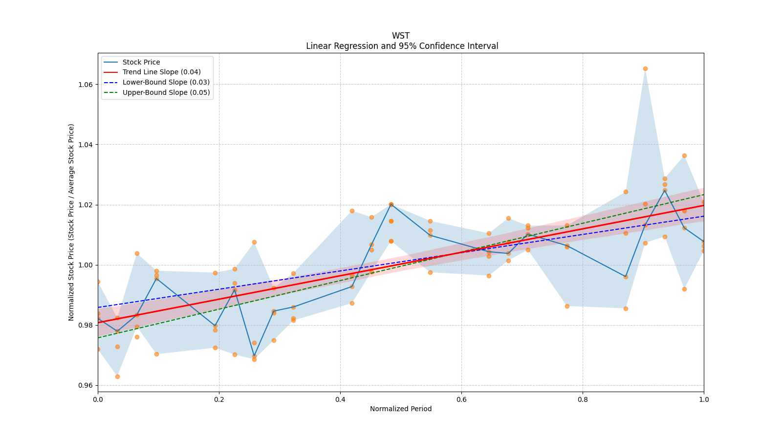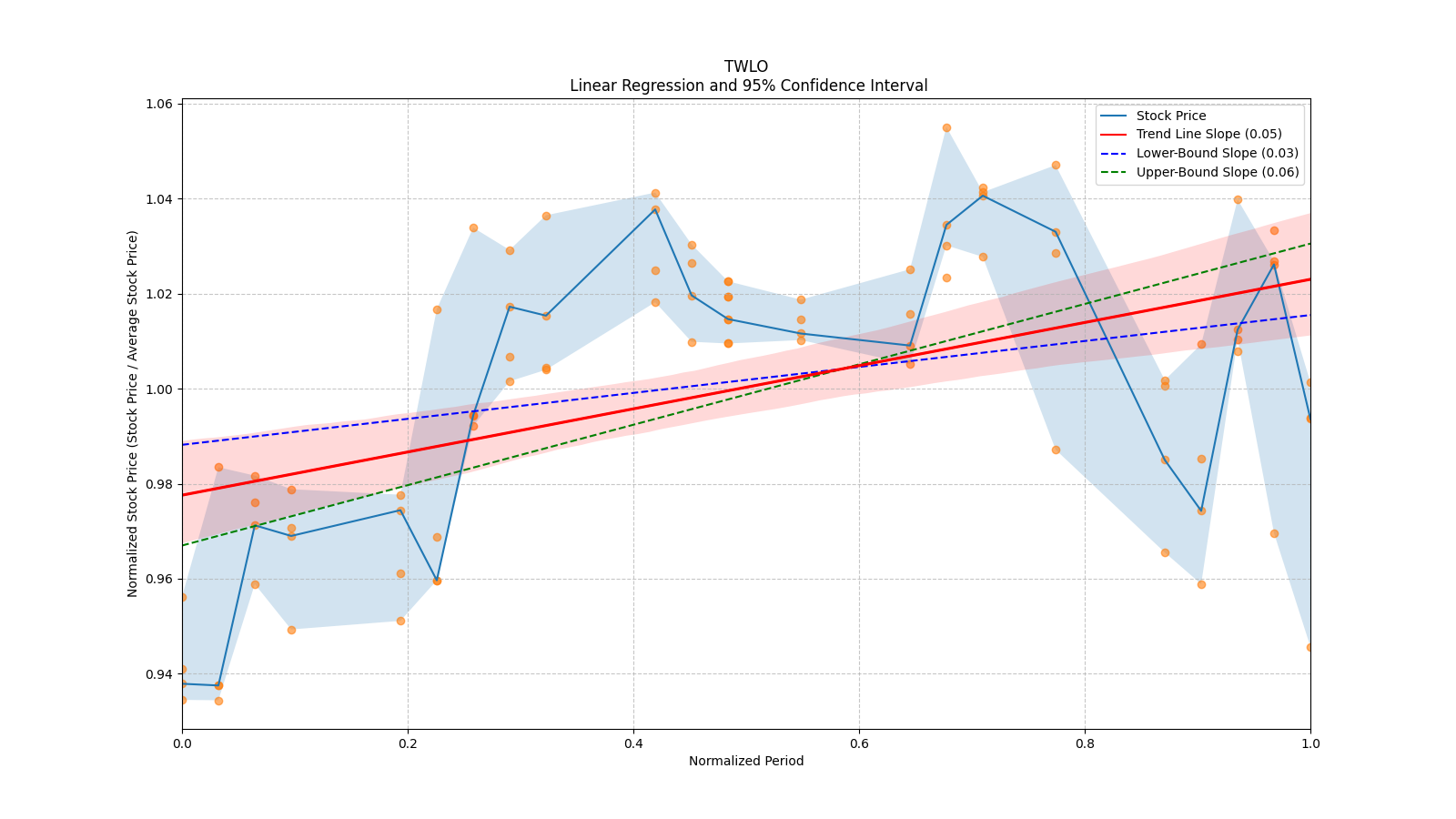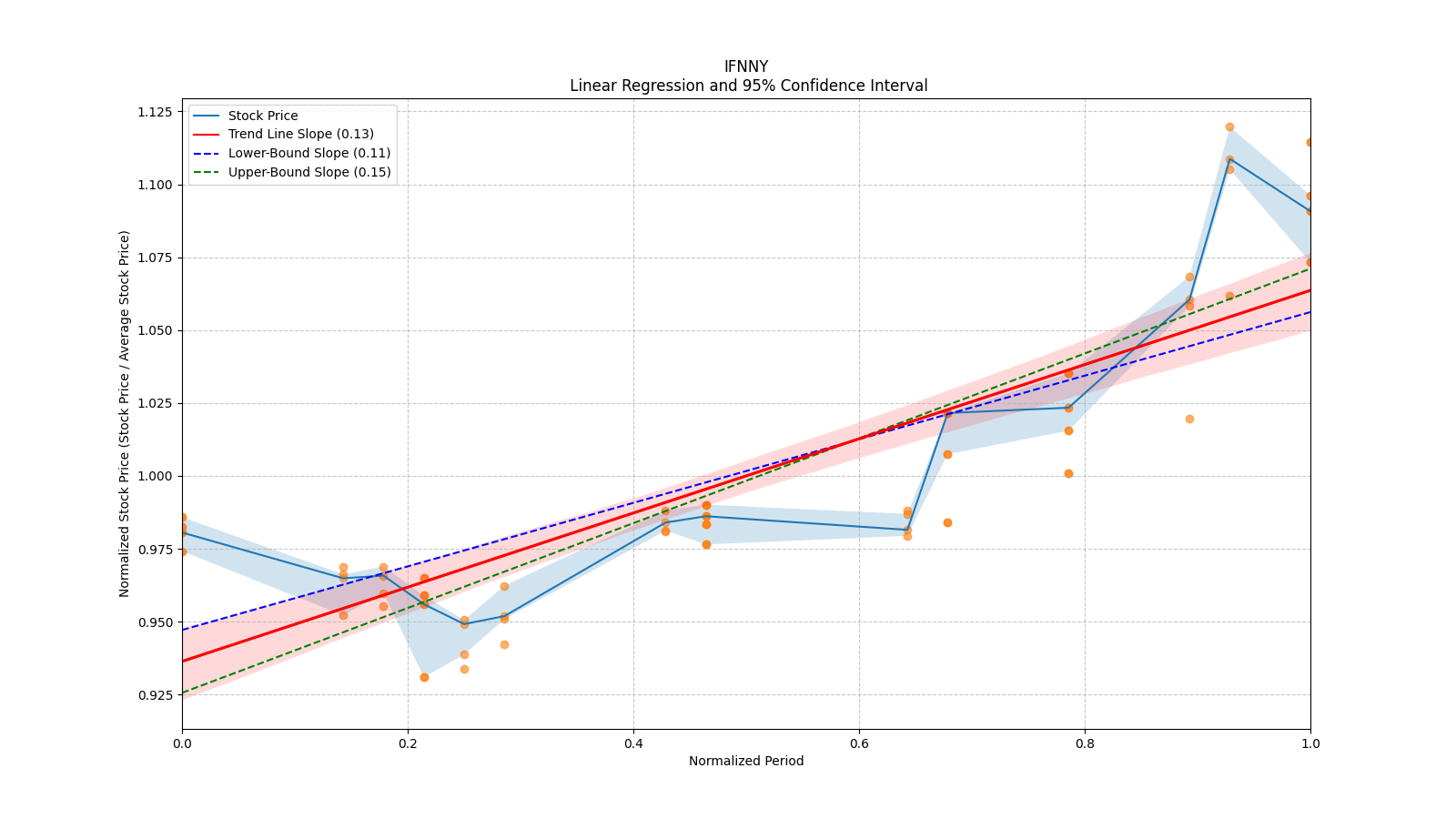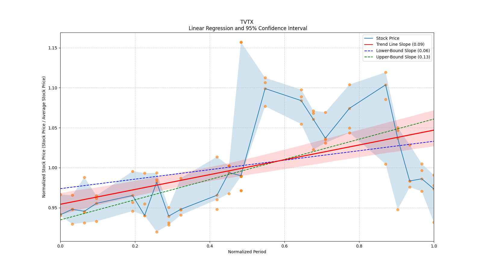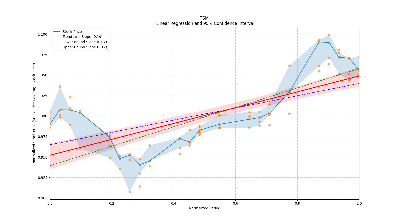 Stocks were filtered to have a high investor grade, analyzed using linear regression, and sorted by the lower-bound trendline slope. The lower-bound trendline slope has been normalized by the average stock price and calculated using a 95% confidence interval. This statistic provides a conservative estimate of stock price percentage growth, taking into account both the trends and volatility of the stock price over the past month. With these details, you can easily compare stocks by their historical performance.
