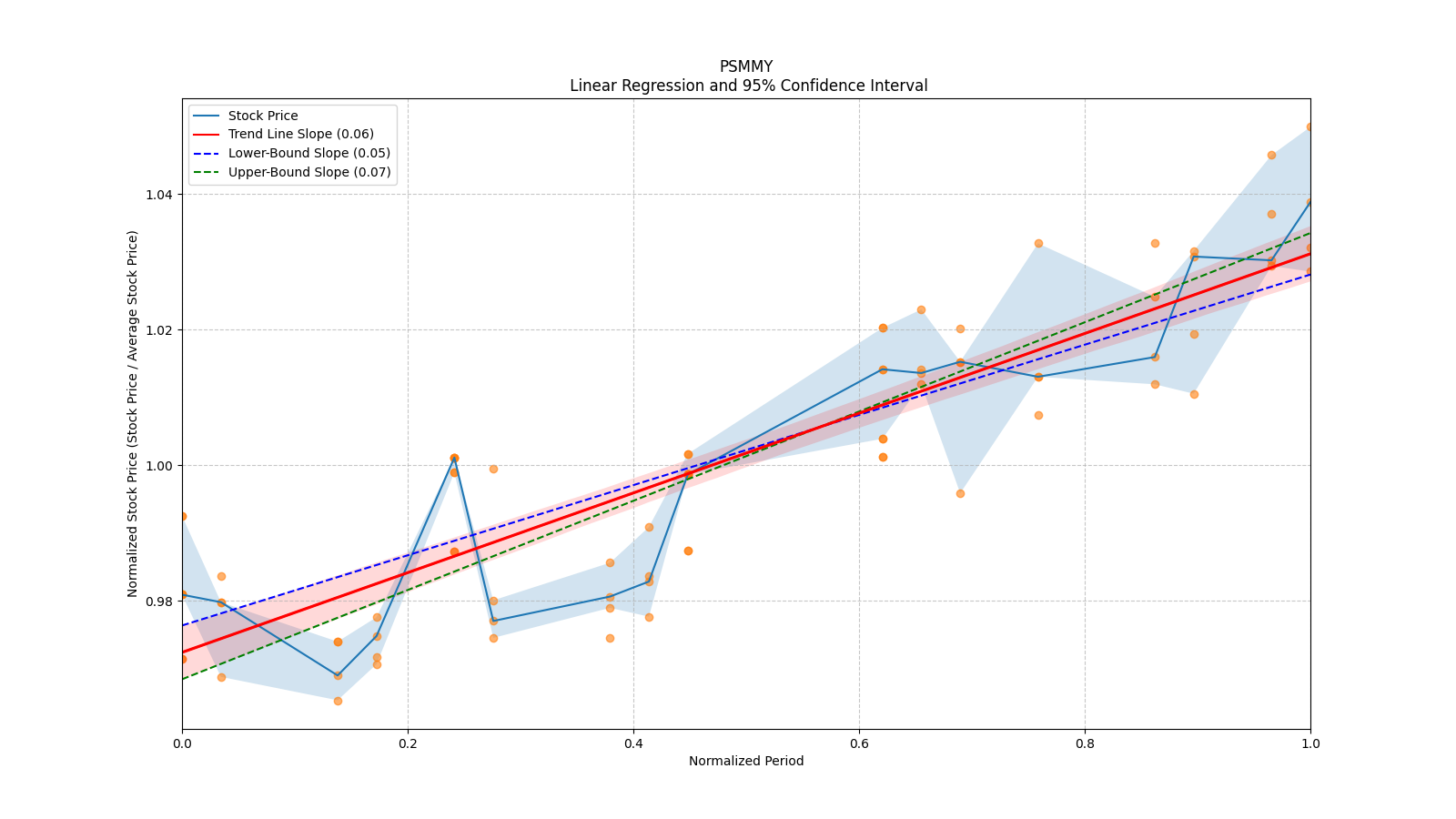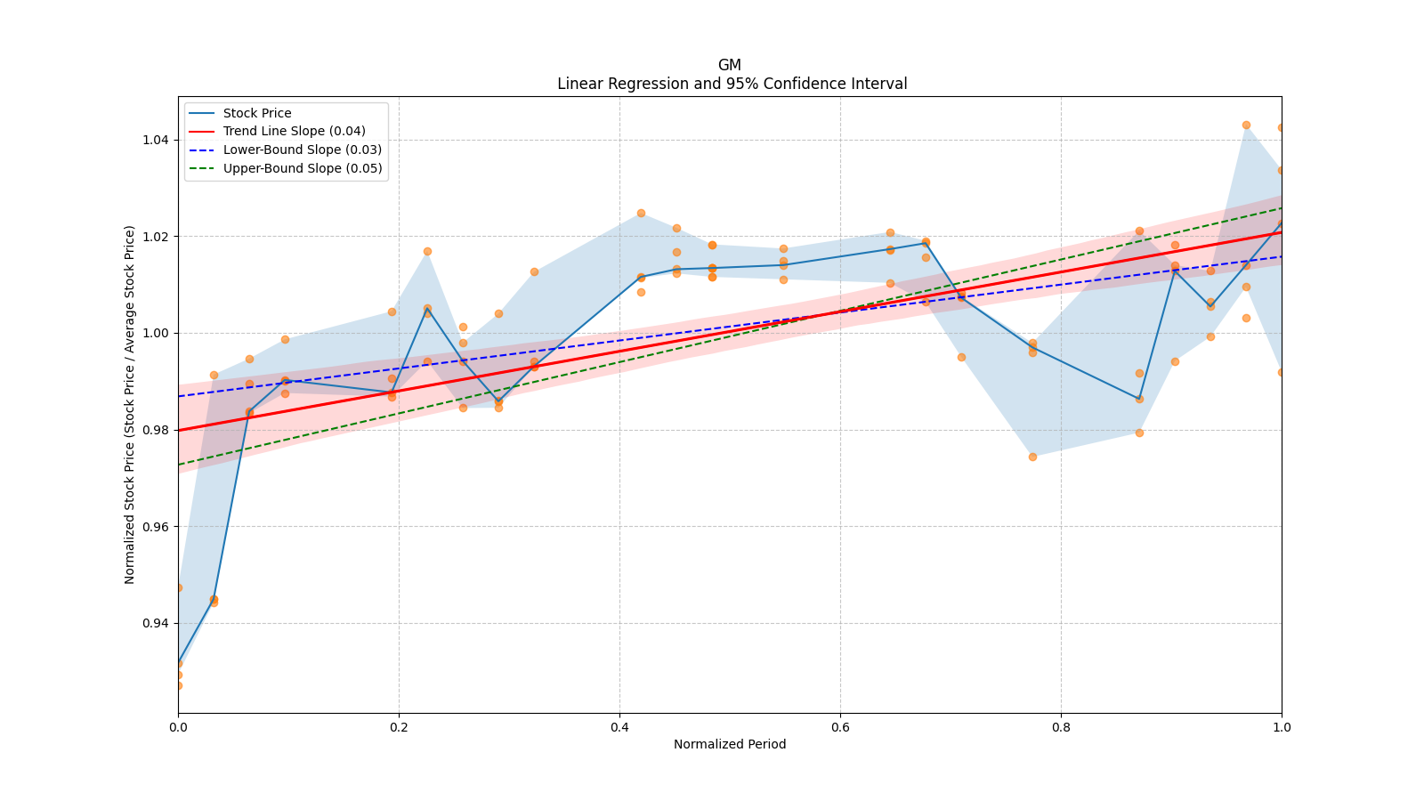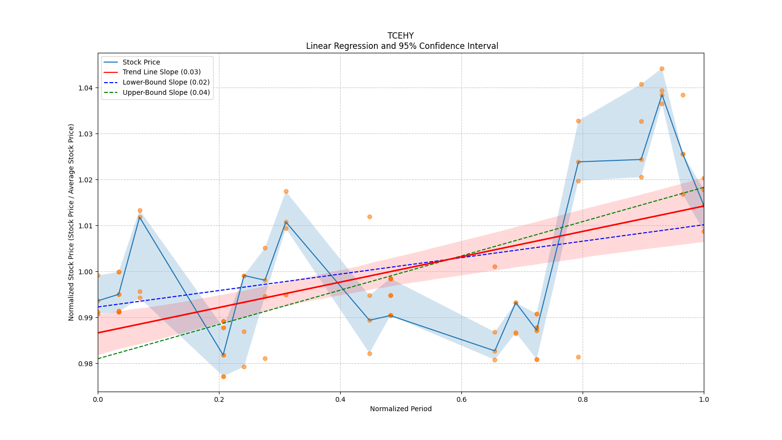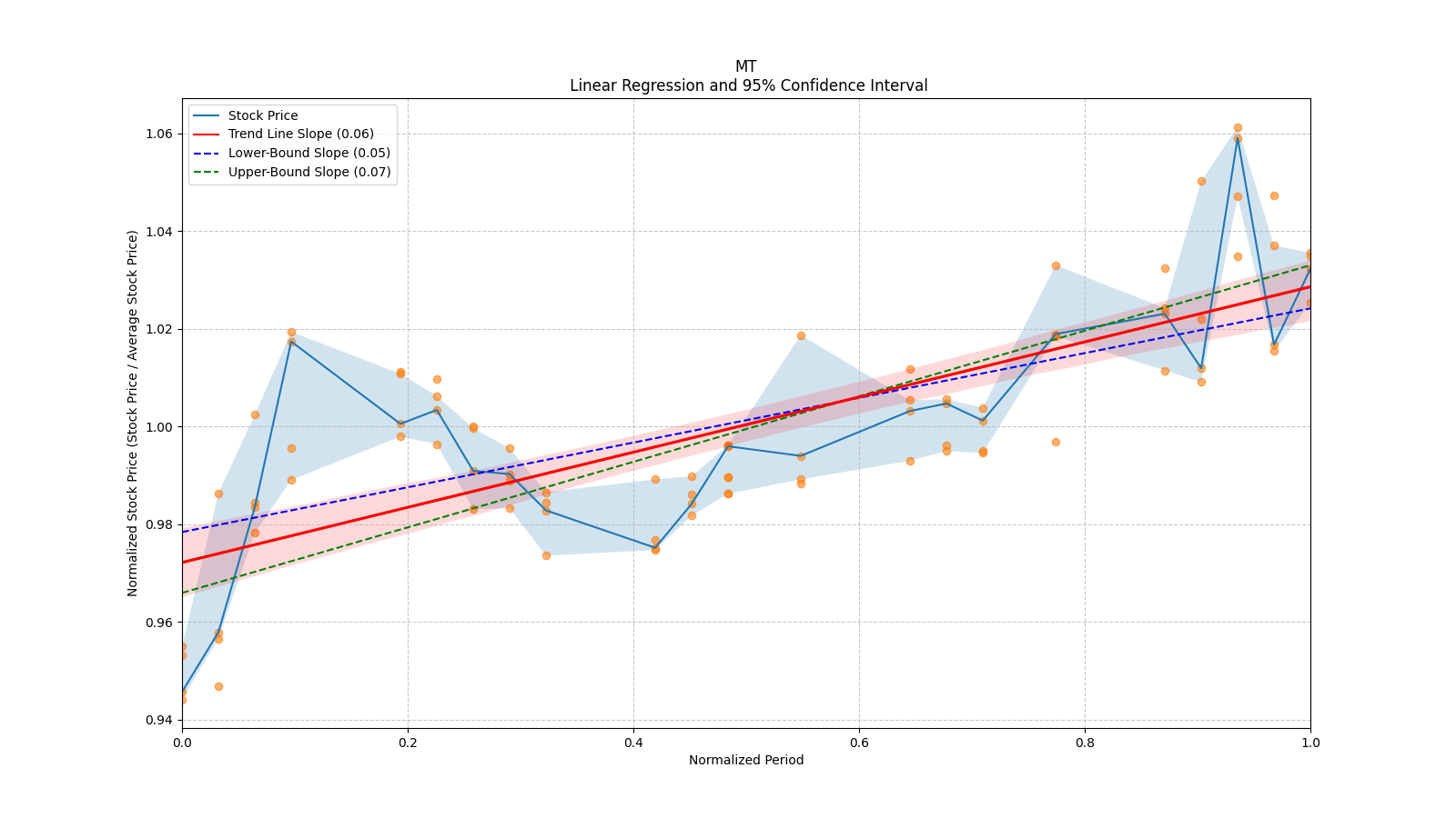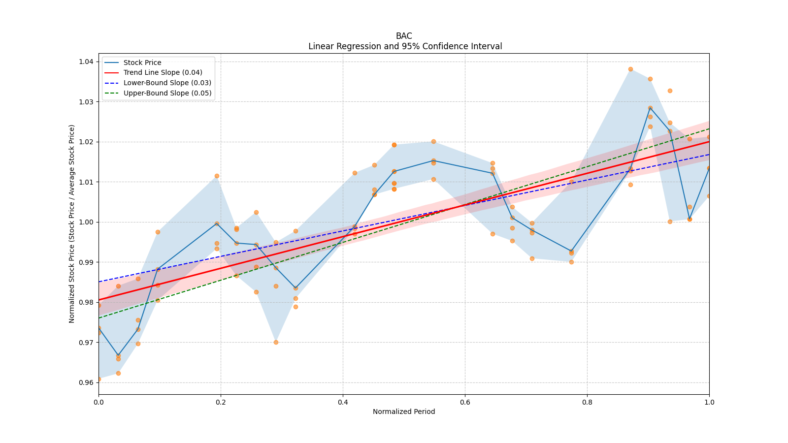 Stocks were filtered to have a high investor grade, analyzed using linear regression, and sorted by the lower-bound trendline slope. The lower-bound trendline slope has been normalized by the average stock price and calculated using a 95% confidence interval. This statistic provides a conservative estimate of stock price percentage growth, taking into account both the trends and volatility of the stock price over the past month. With these details, you can easily compare stocks by their historical performance.