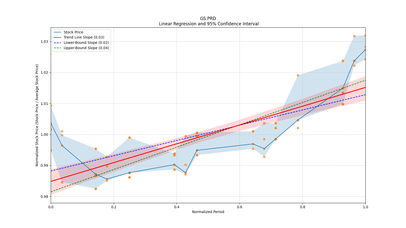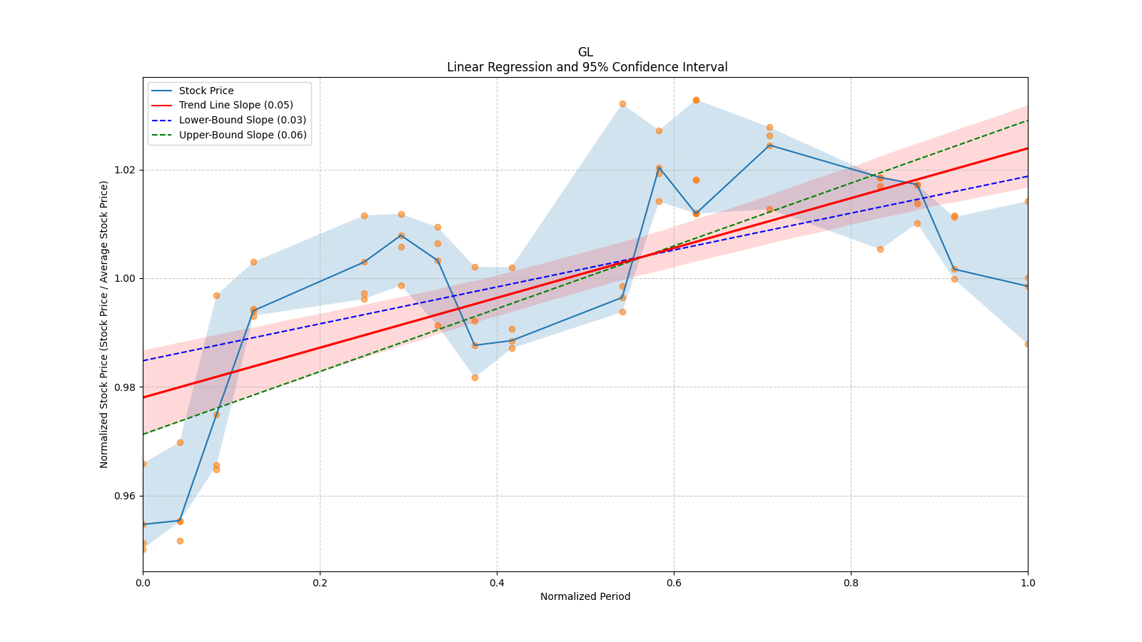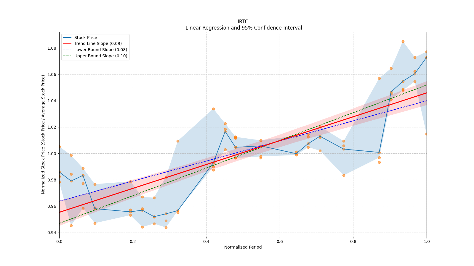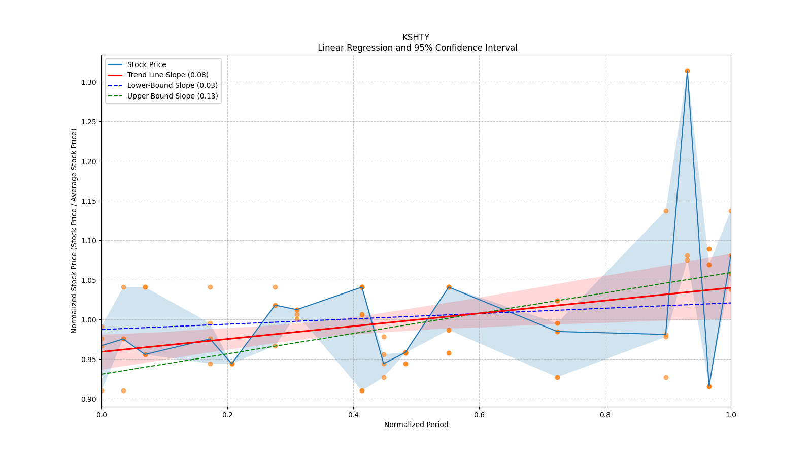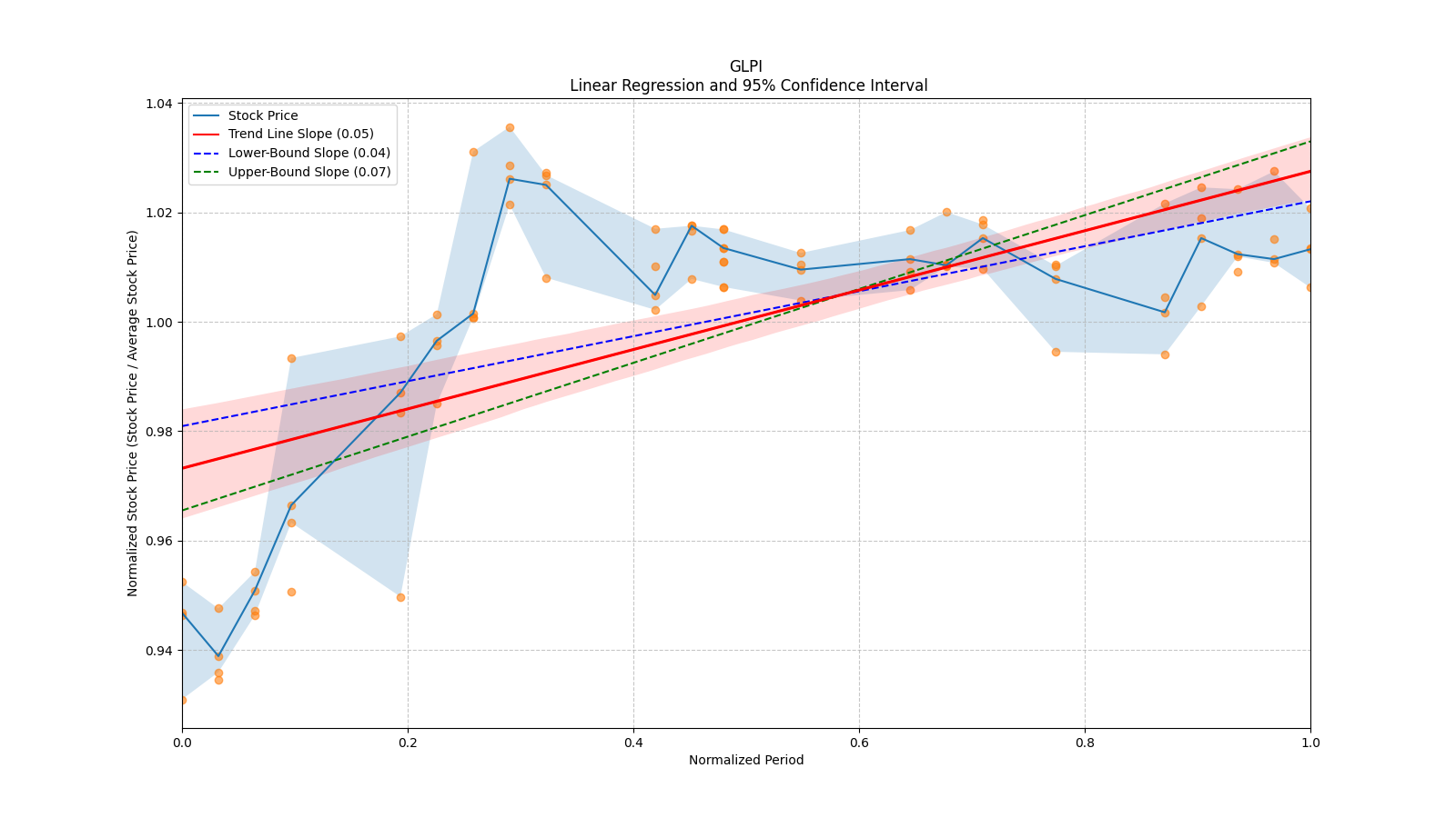 Stocks were filtered to have a high investor grade, analyzed using linear regression, and sorted by the lower-bound trendline slope. The lower-bound trendline slope has been normalized by the average stock price and calculated using a 95% confidence interval. This statistic provides a conservative estimate of stock price percentage growth, taking into account both the trends and volatility of the stock price over the past month. With these details, you can easily compare stocks by their historical performance.