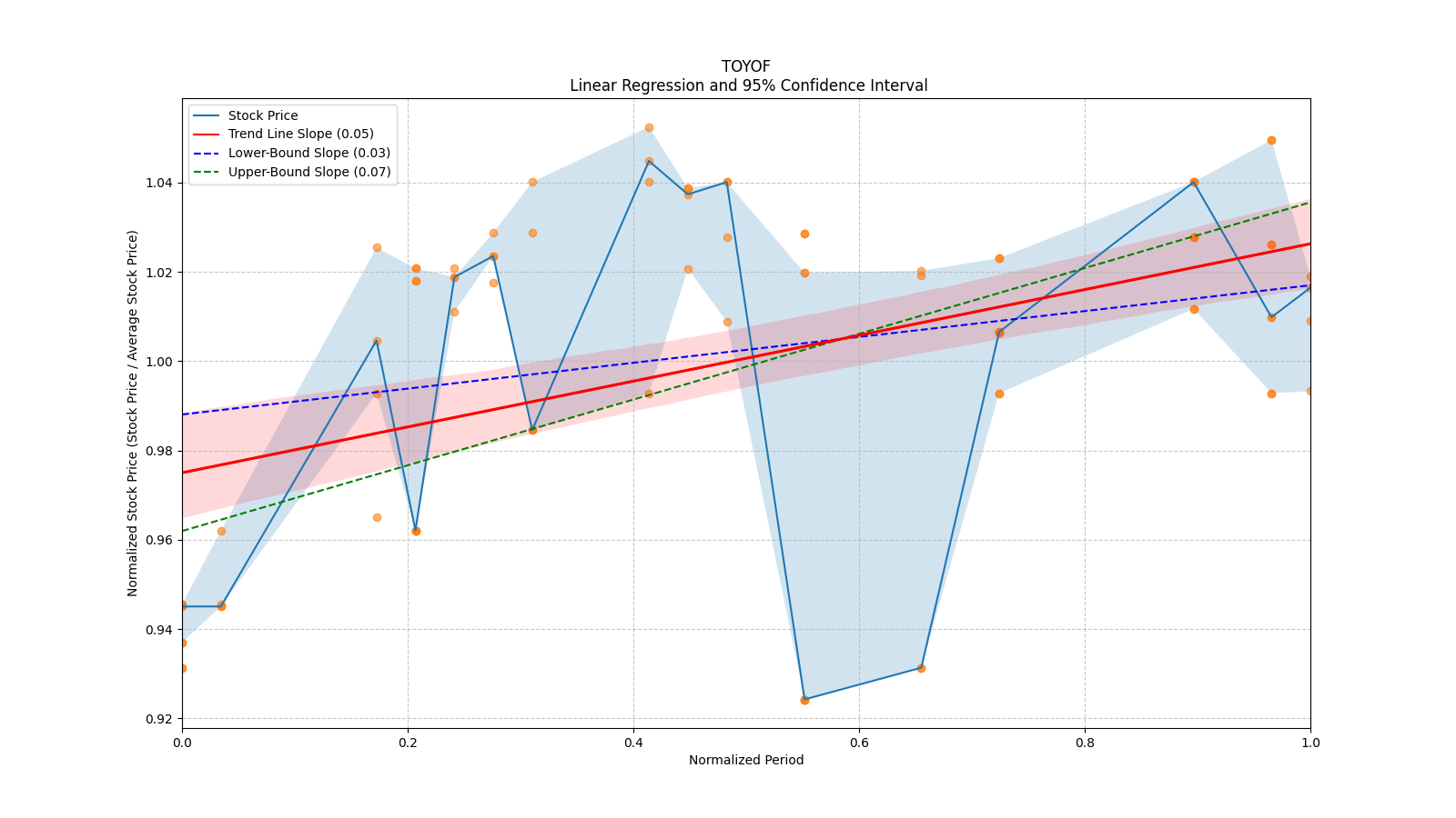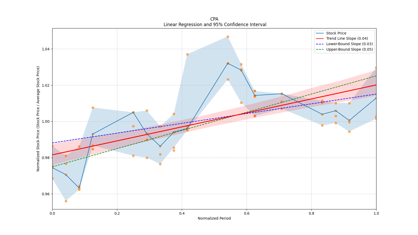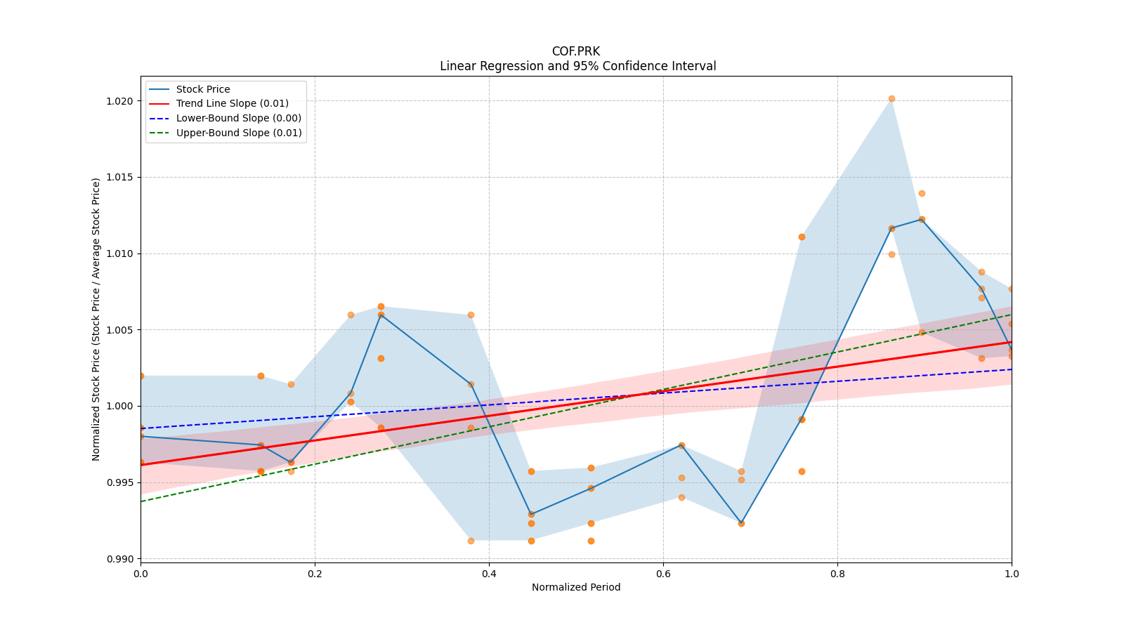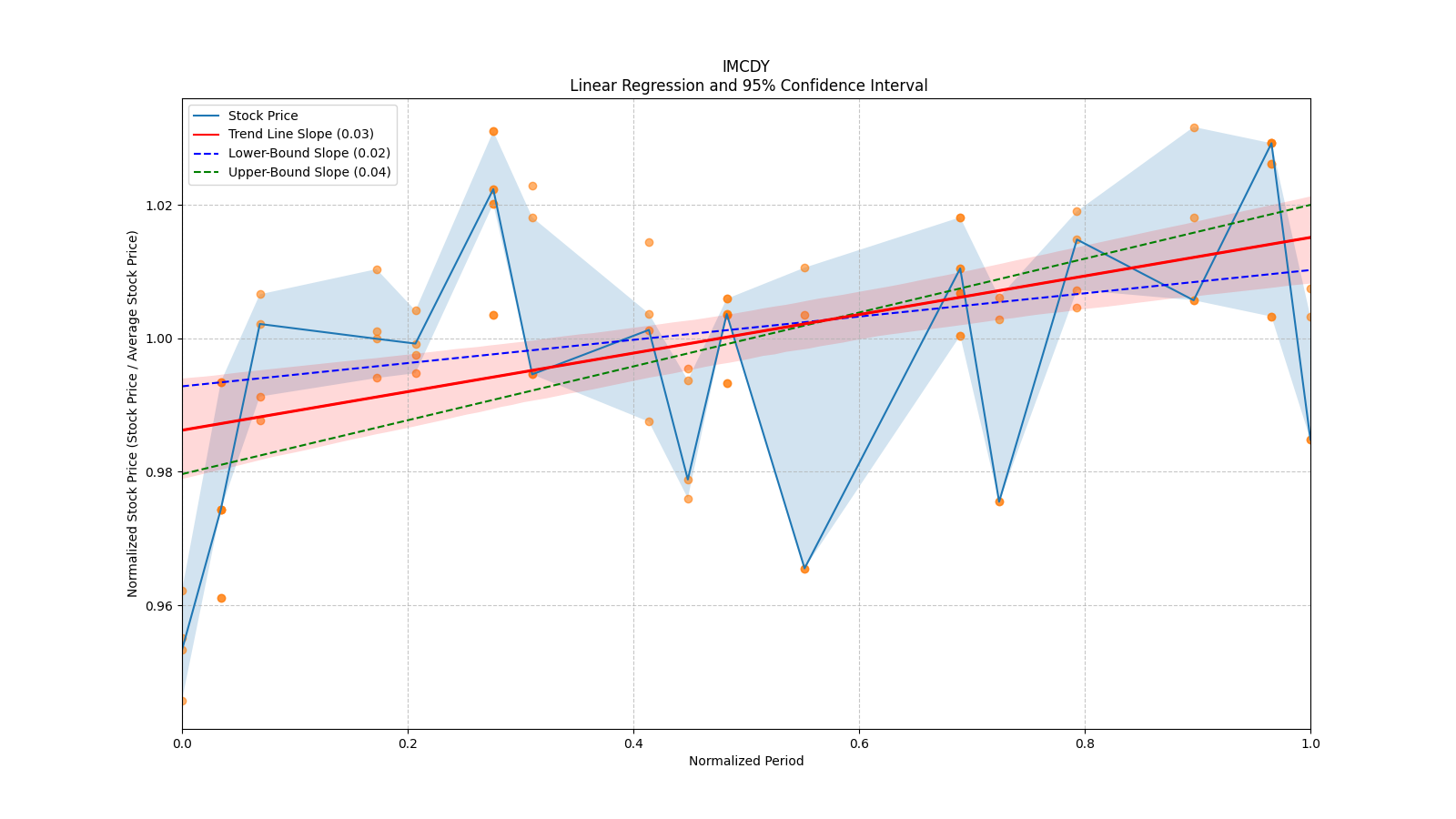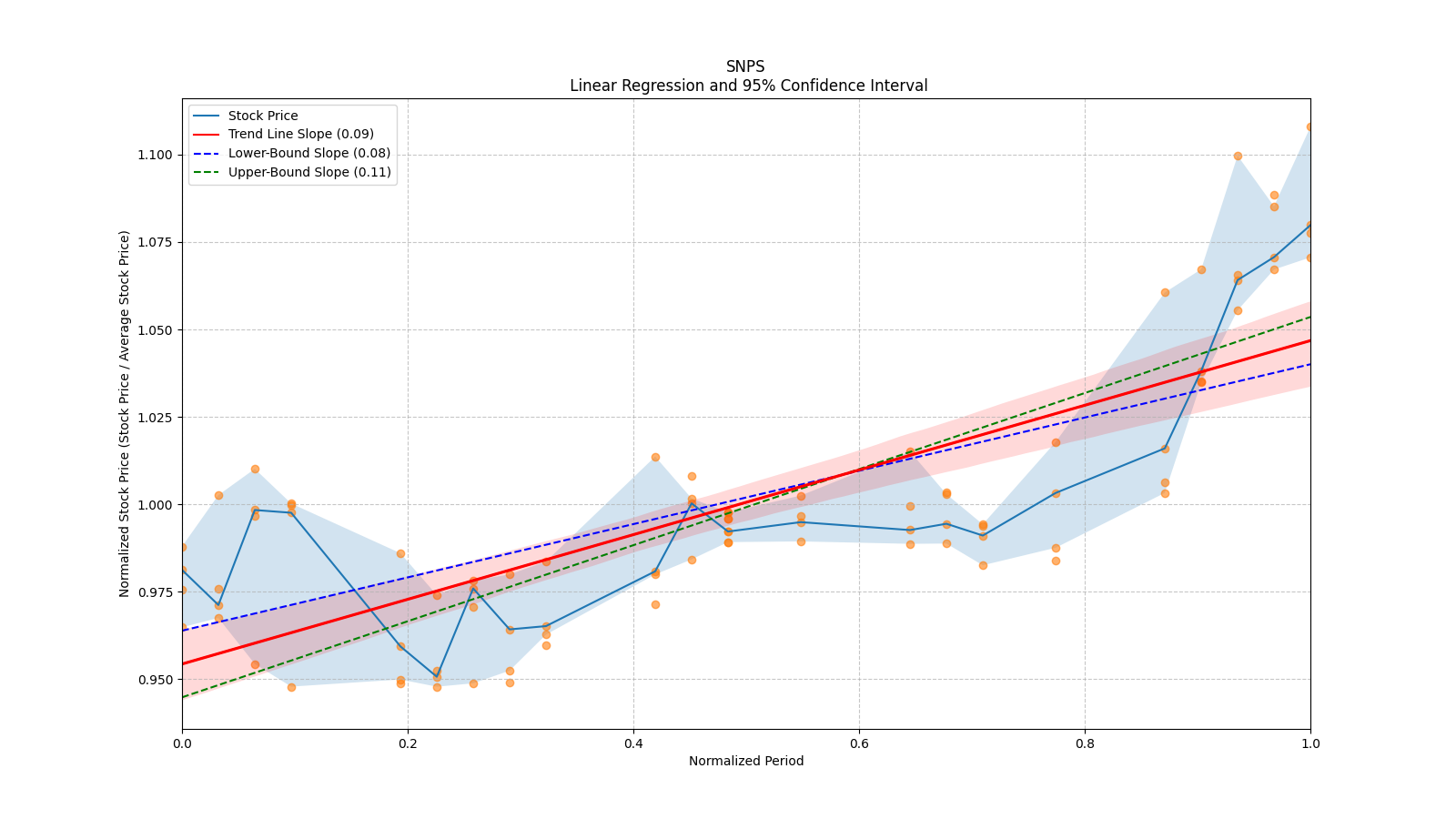 Stocks were filtered to have a high investor grade, analyzed using linear regression, and sorted by the lower-bound trendline slope. The lower-bound trendline slope has been normalized by the average stock price and calculated using a 95% confidence interval. This statistic provides a conservative estimate of stock price percentage growth, taking into account both the trends and volatility of the stock price over the past month. With these details, you can easily compare stocks by their historical performance.