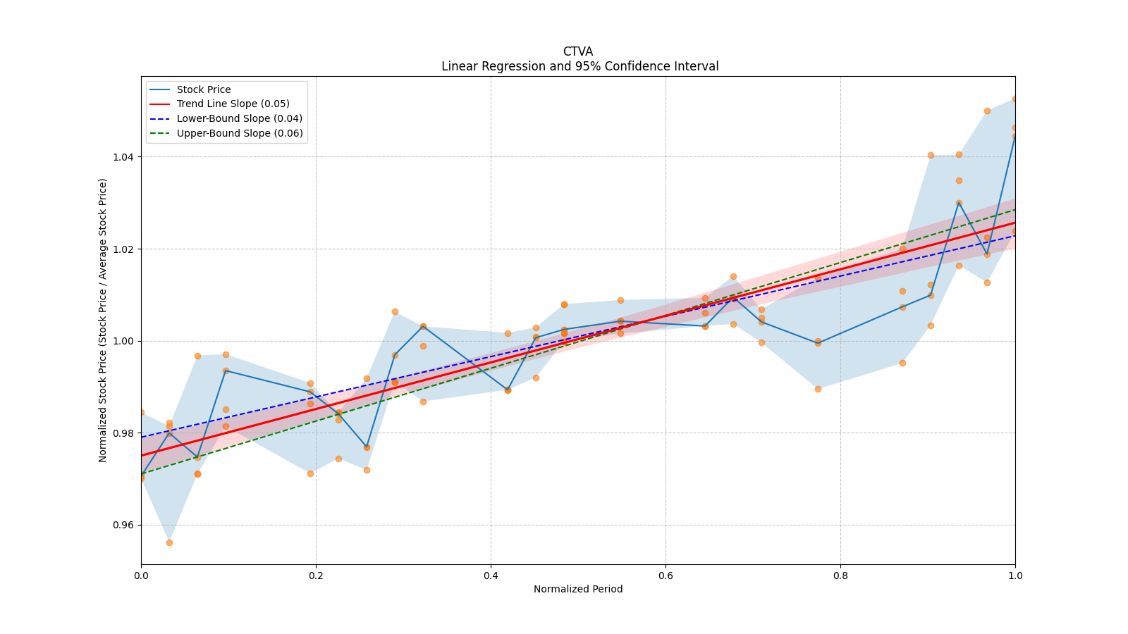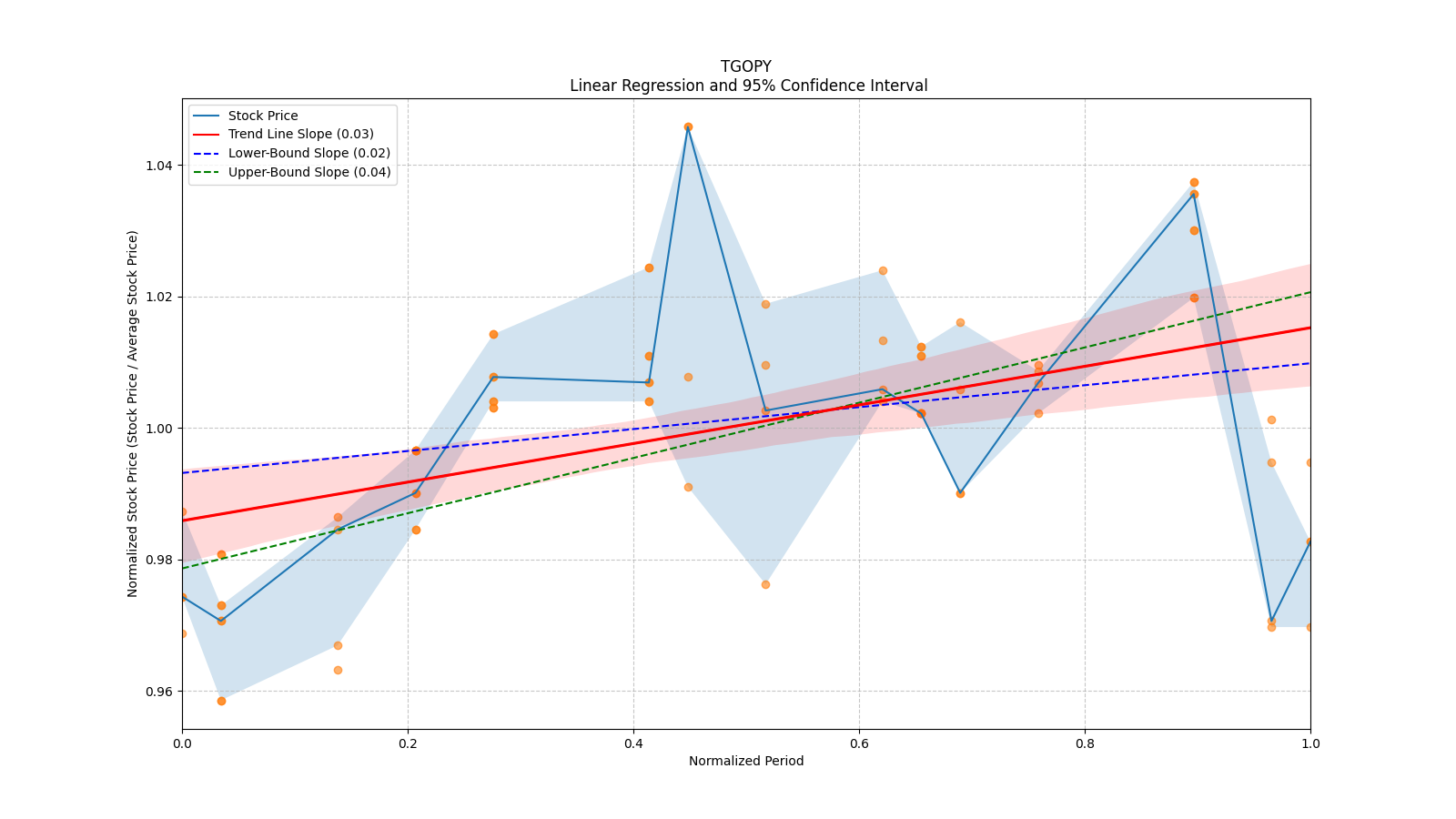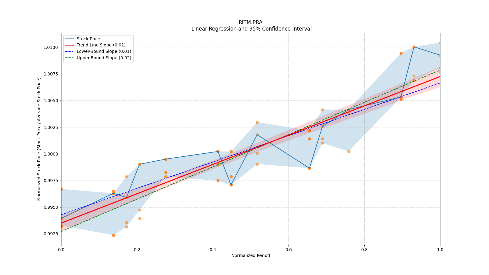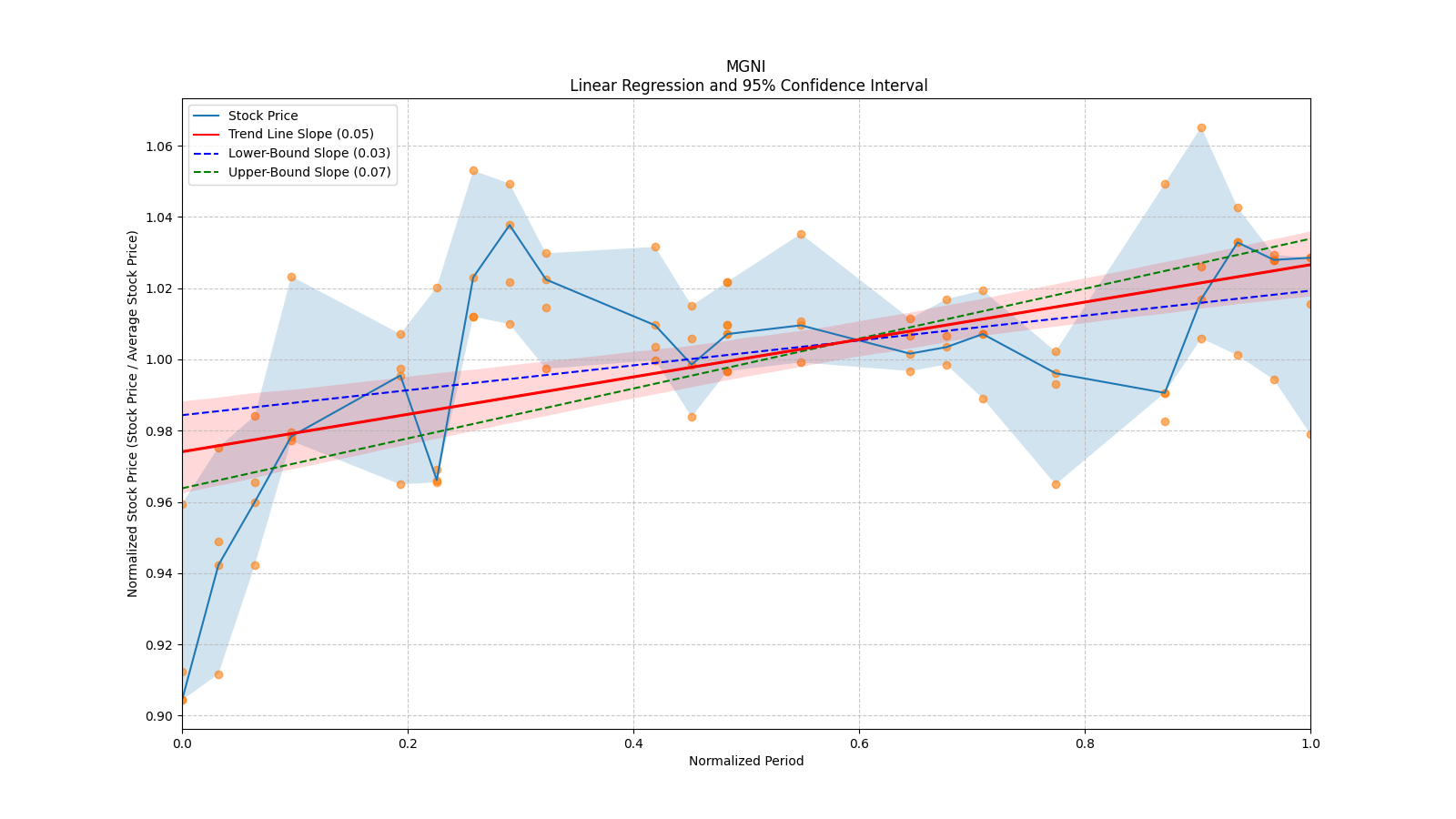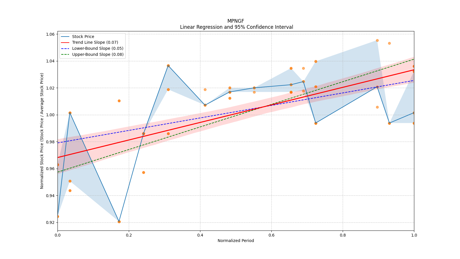 Stocks were filtered to have a high investor grade, analyzed using linear regression, and sorted by the lower-bound trendline slope. The lower-bound trendline slope has been normalized by the average stock price and calculated using a 95% confidence interval. This statistic provides a conservative estimate of stock price percentage growth, taking into account both the trends and volatility of the stock price over the past month. With these details, you can easily compare stocks by their historical performance.