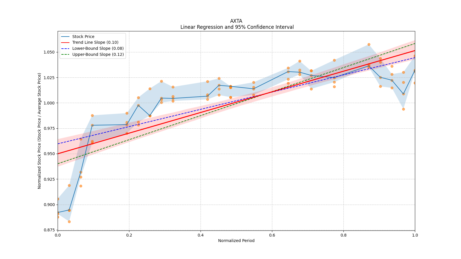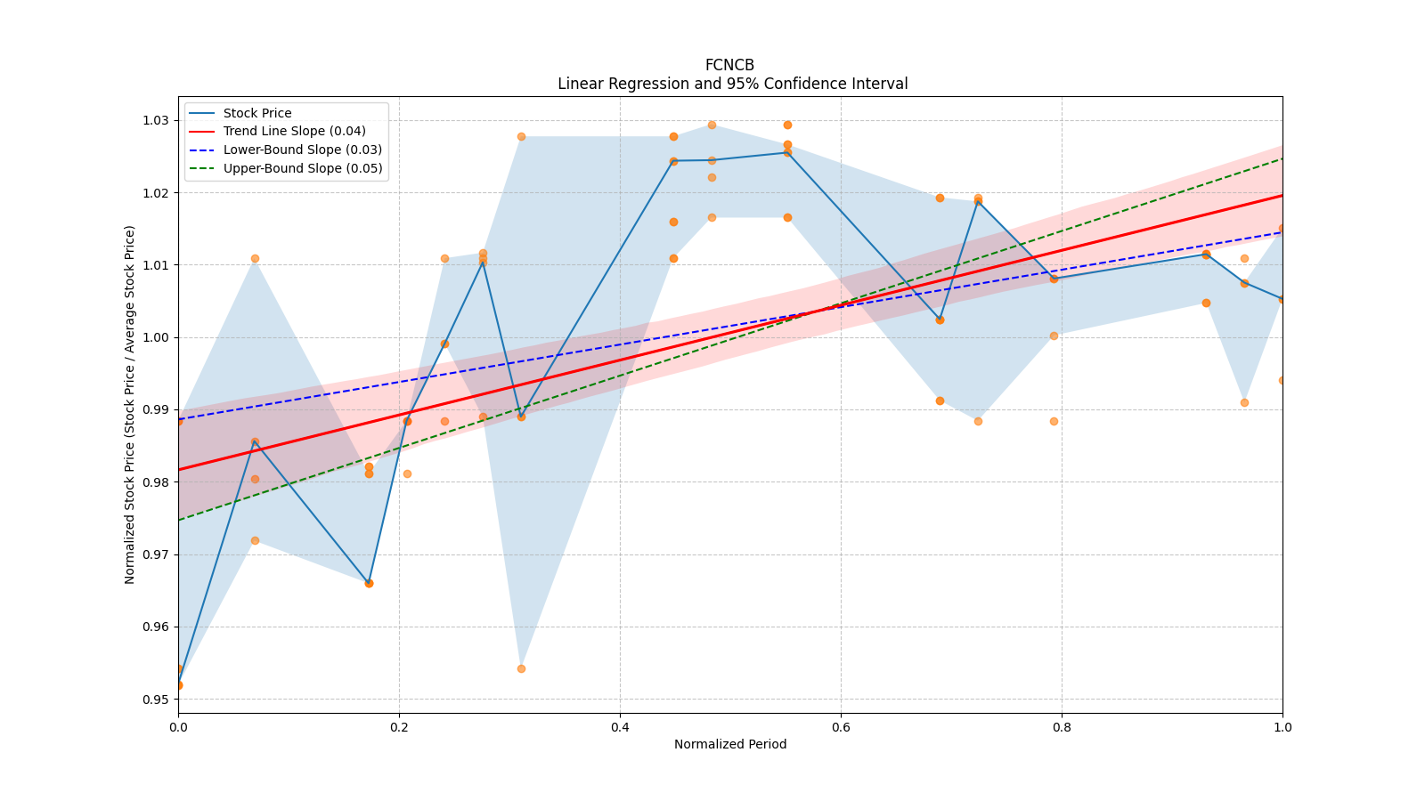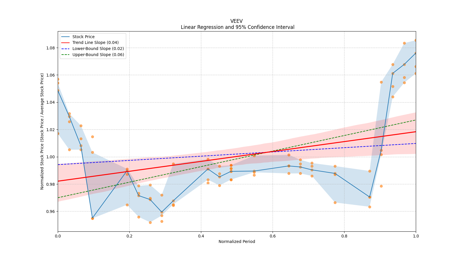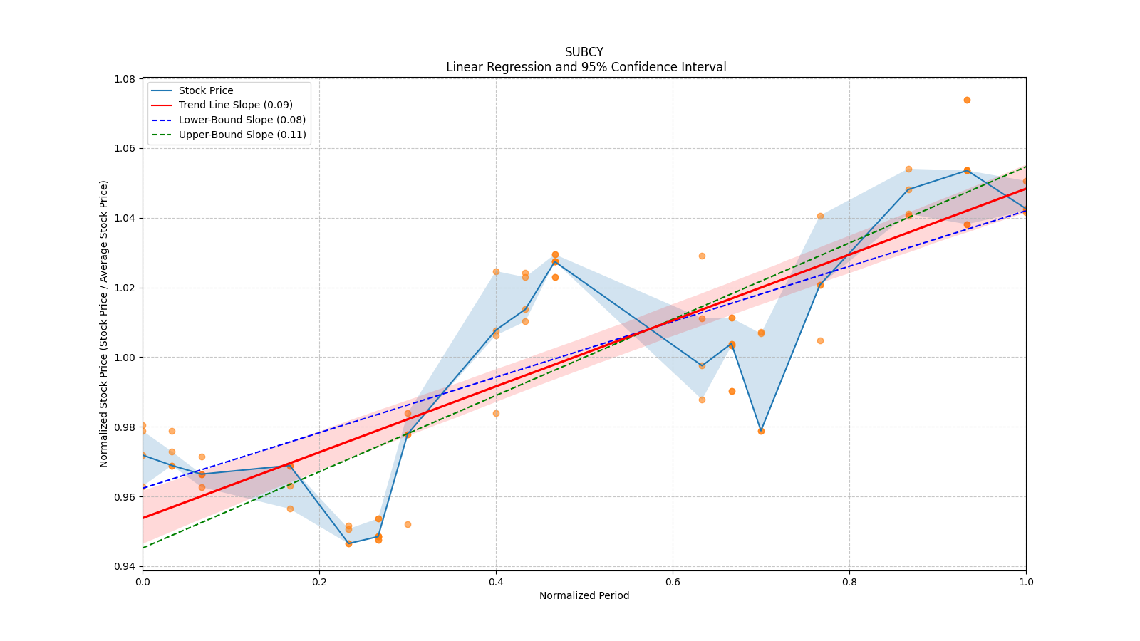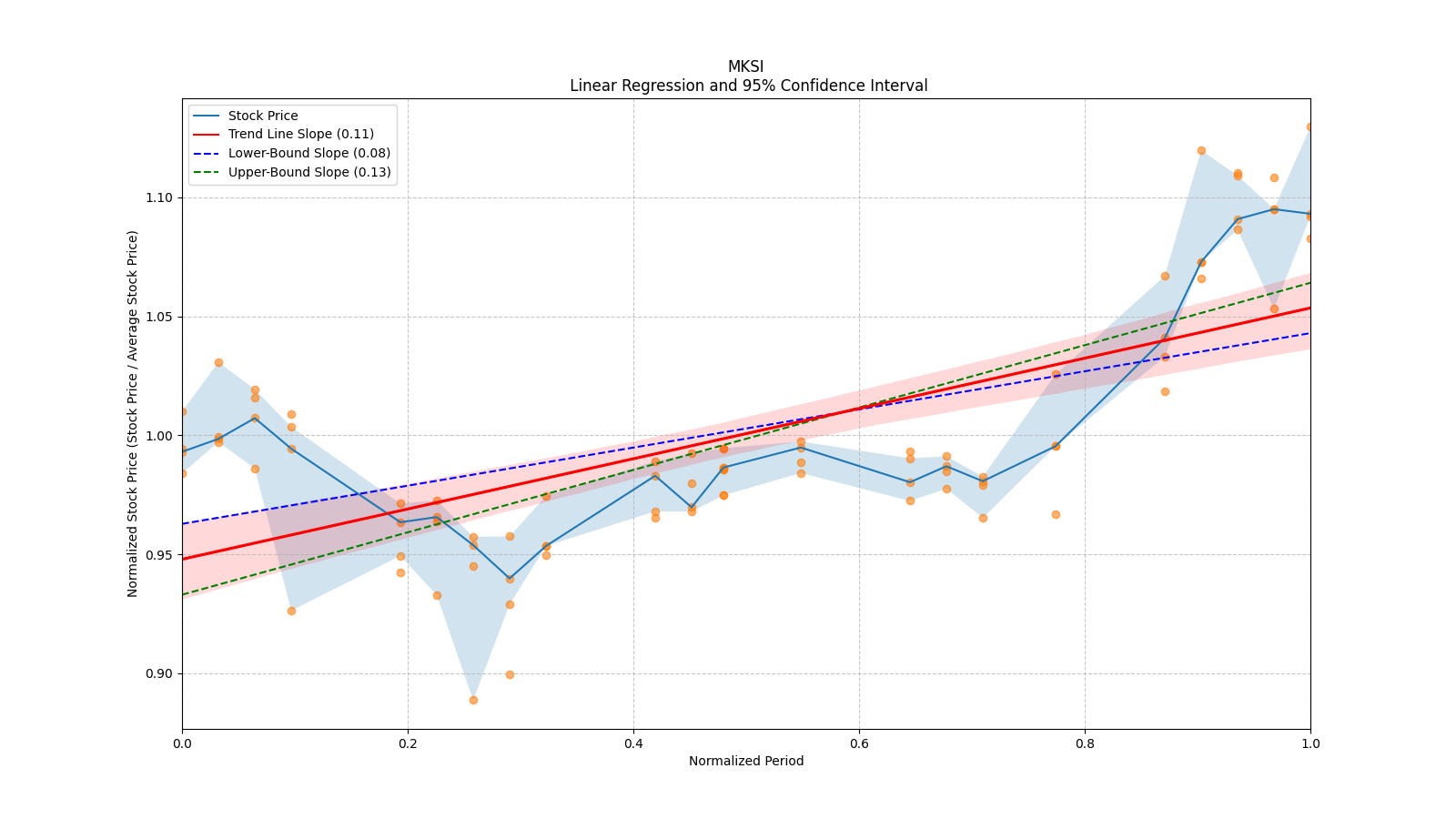Stocks were filtered to have a high investor grade, analyzed using linear regression, and sorted by the lower-bound trendline slope. The lower-bound trendline slope has been normalized by the average stock price and calculated using a 95% confidence interval. This statistic provides a conservative estimate of stock price percentage growth, taking into account both the trends and volatility of the stock price over the past month. With these details, you can easily compare stocks by their historical performance.