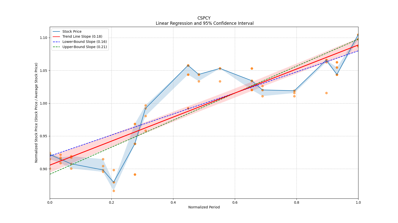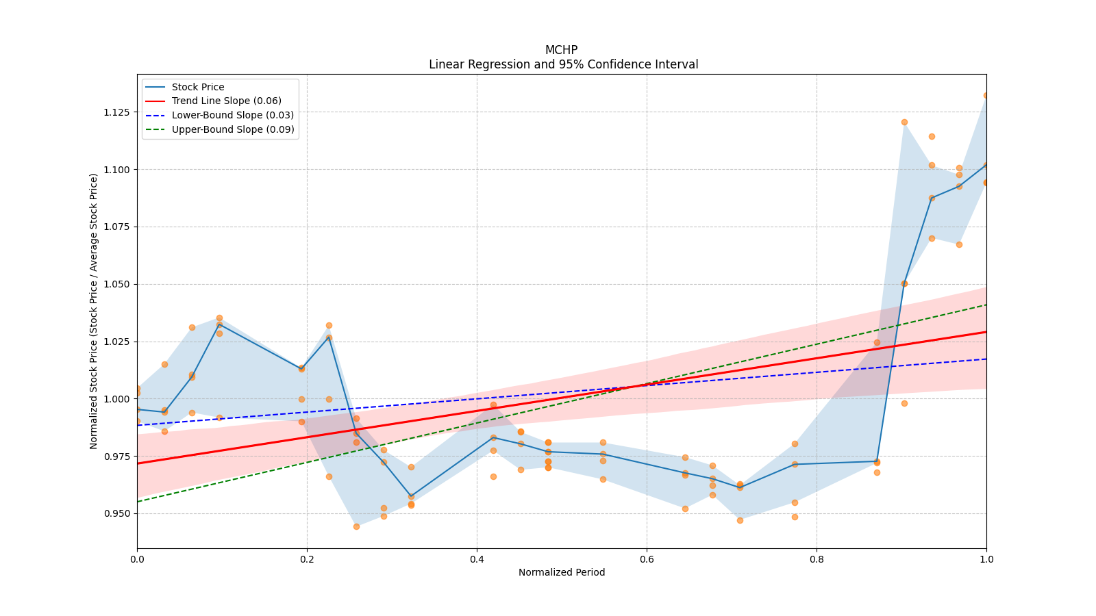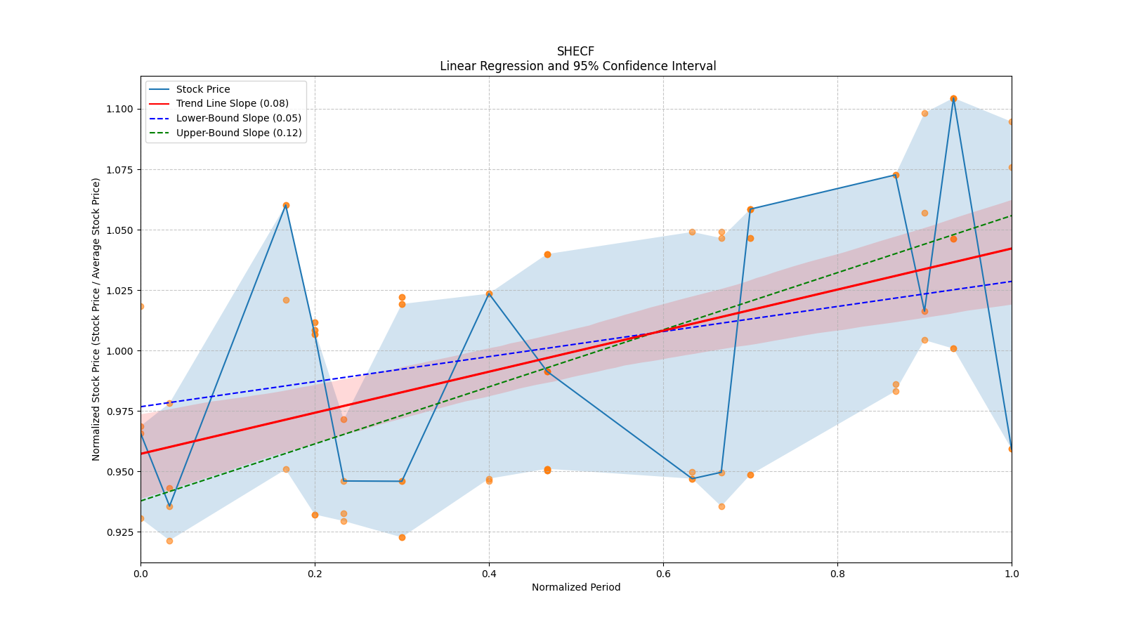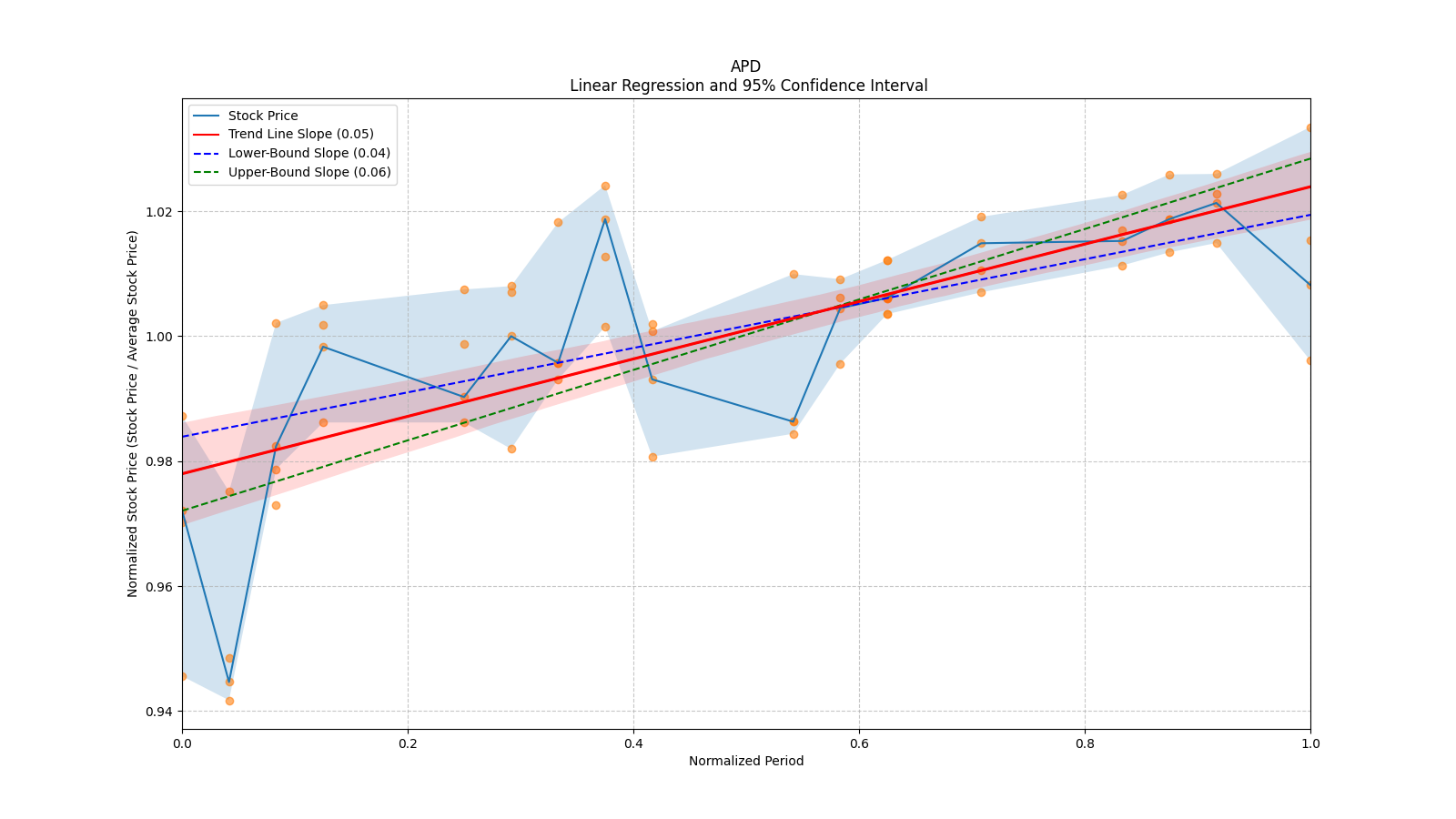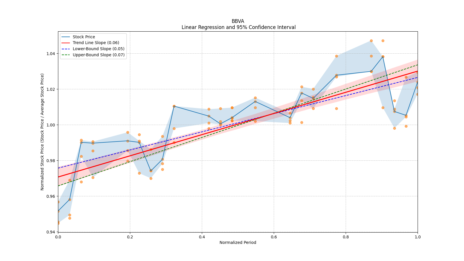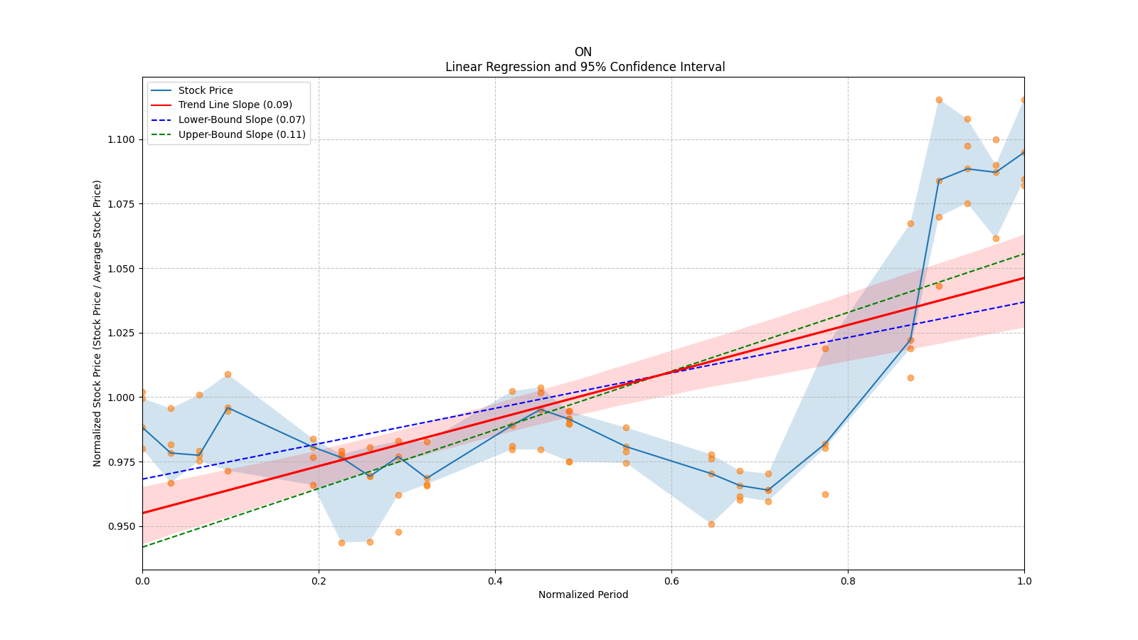 Stocks were filtered to have a high investor grade, analyzed using linear regression, and sorted by the lower-bound trendline slope. The lower-bound trendline slope has been normalized by the average stock price and calculated using a 95% confidence interval. This statistic provides a conservative estimate of stock price percentage growth, taking into account both the trends and volatility of the stock price over the past month. With these details, you can easily compare stocks by their historical performance.