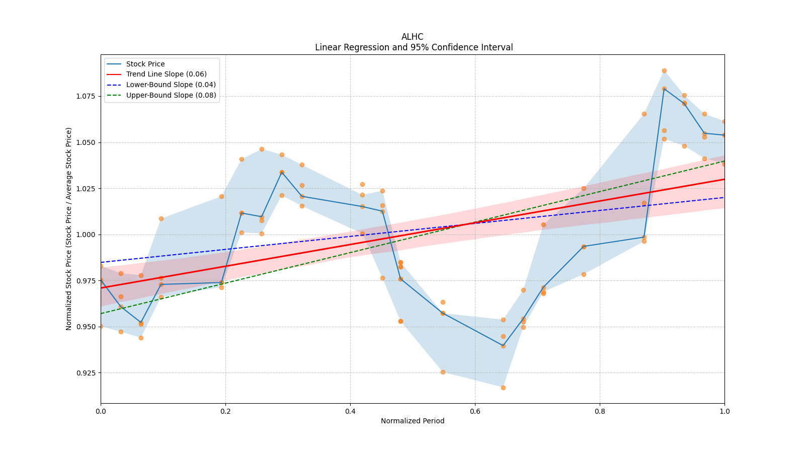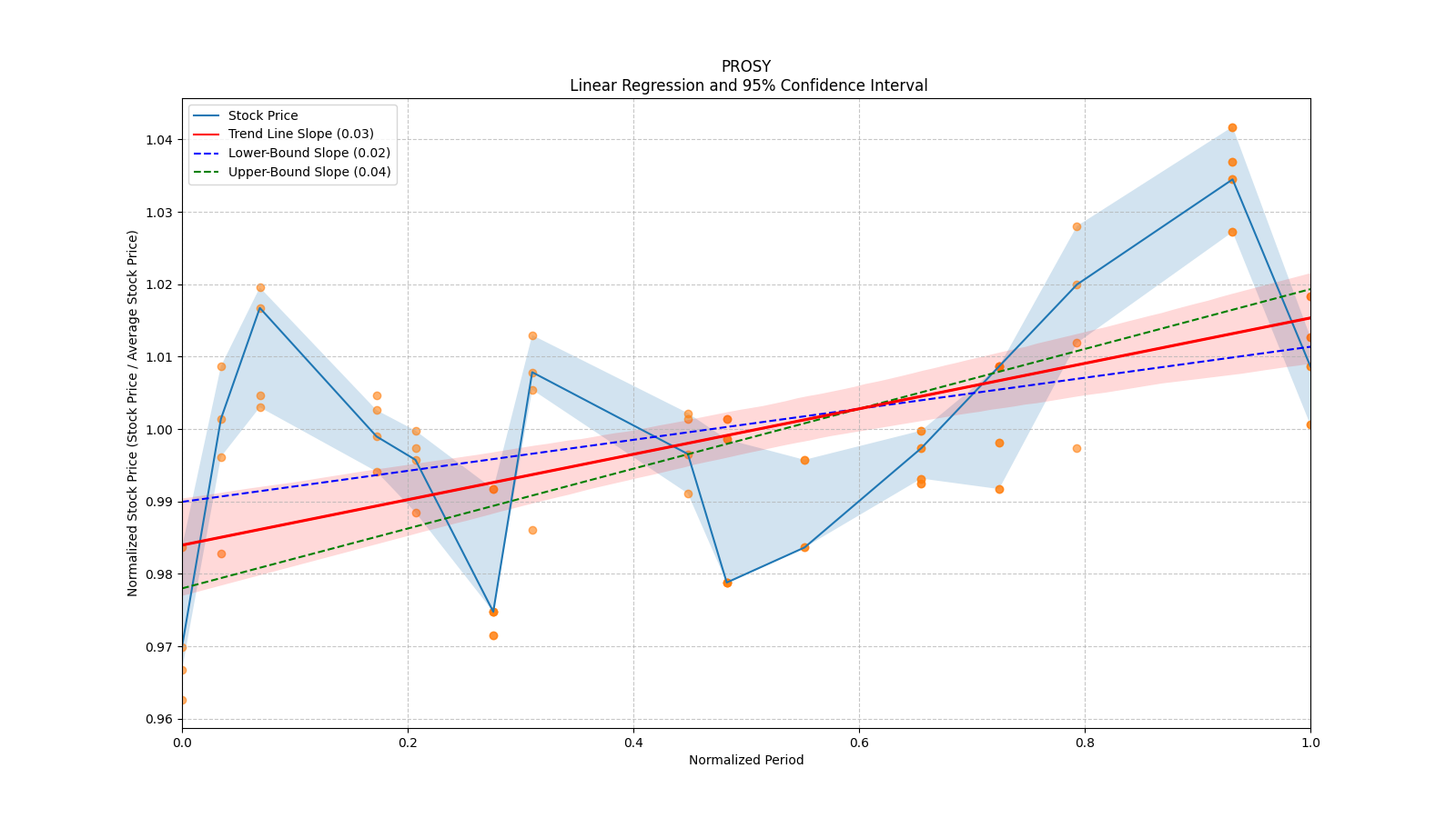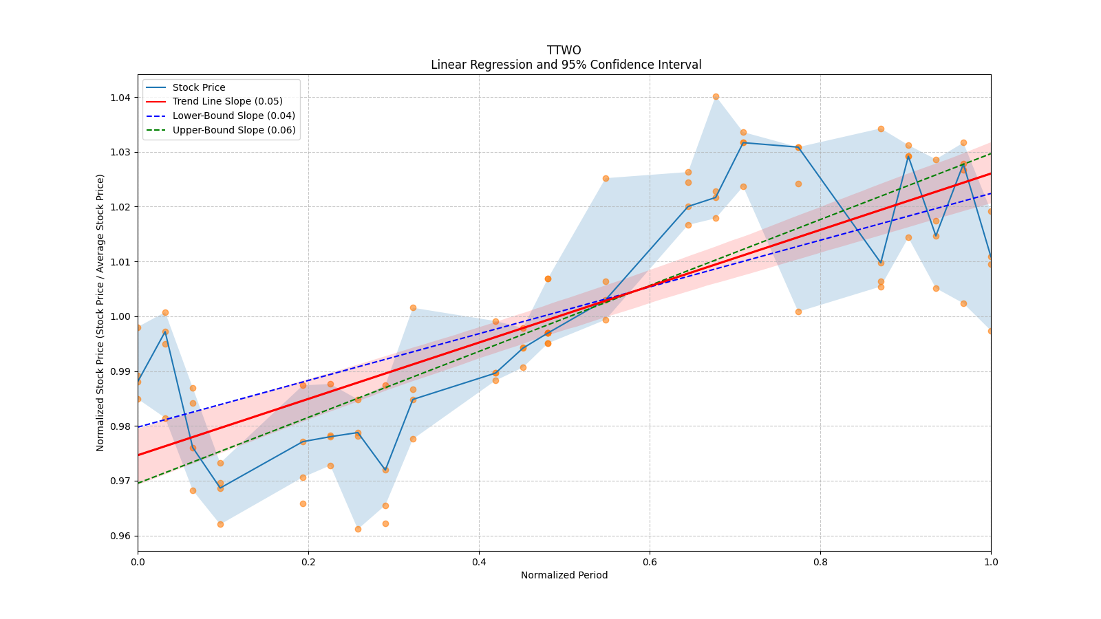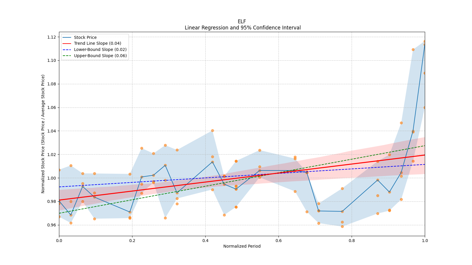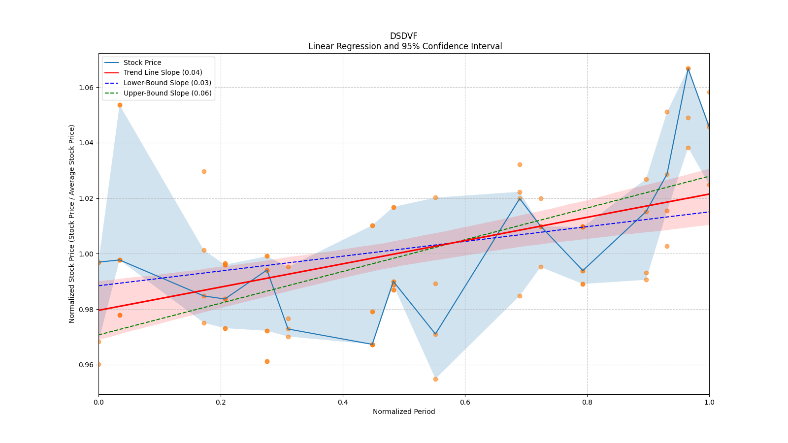 Stocks were filtered to have a high investor grade, analyzed using linear regression, and sorted by the lower-bound trendline slope. The lower-bound trendline slope has been normalized by the average stock price and calculated using a 95% confidence interval. This statistic provides a conservative estimate of stock price percentage growth, taking into account both the trends and volatility of the stock price over the past month. With these details, you can easily compare stocks by their historical performance.
