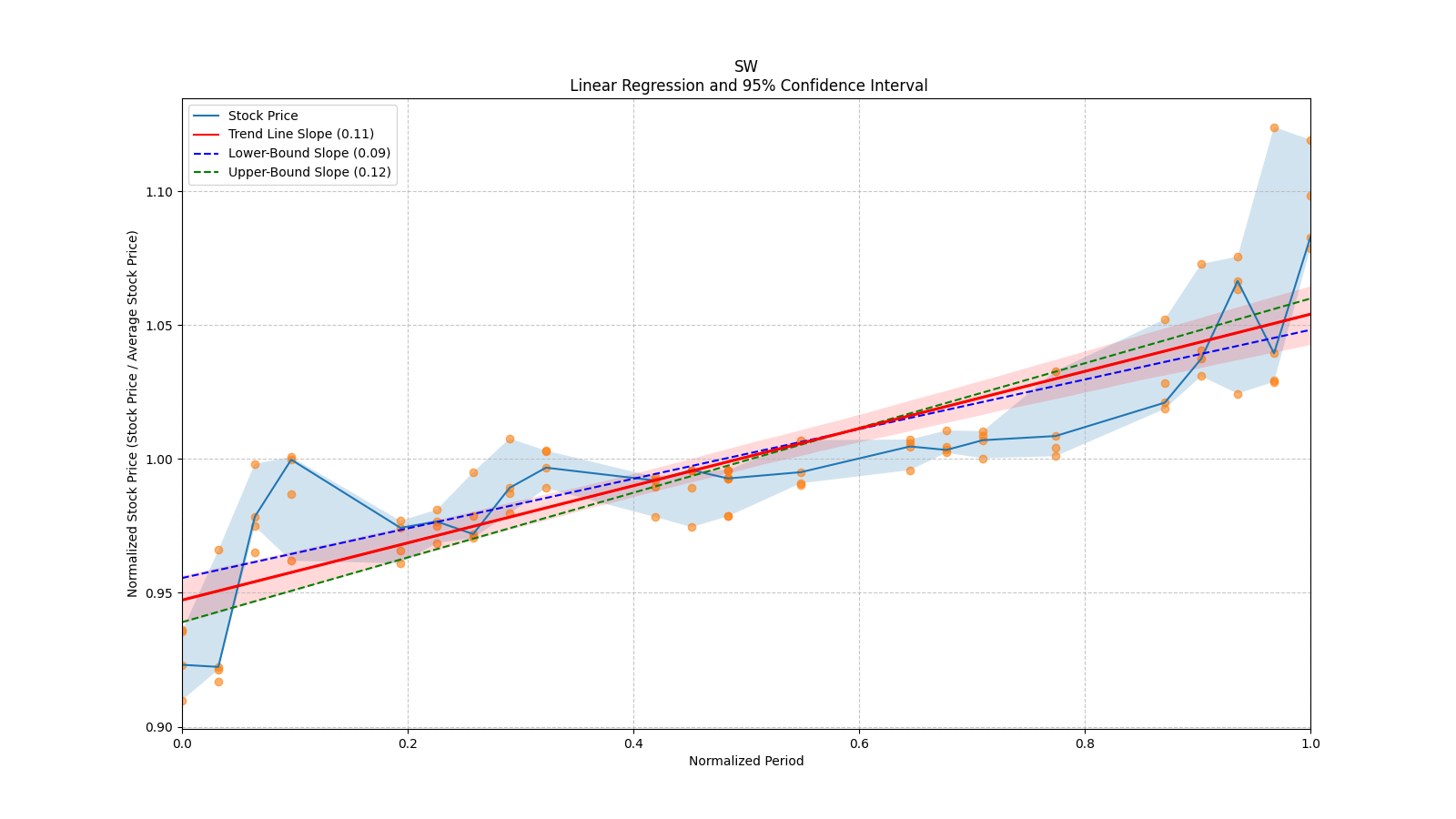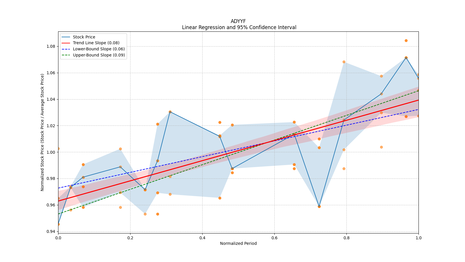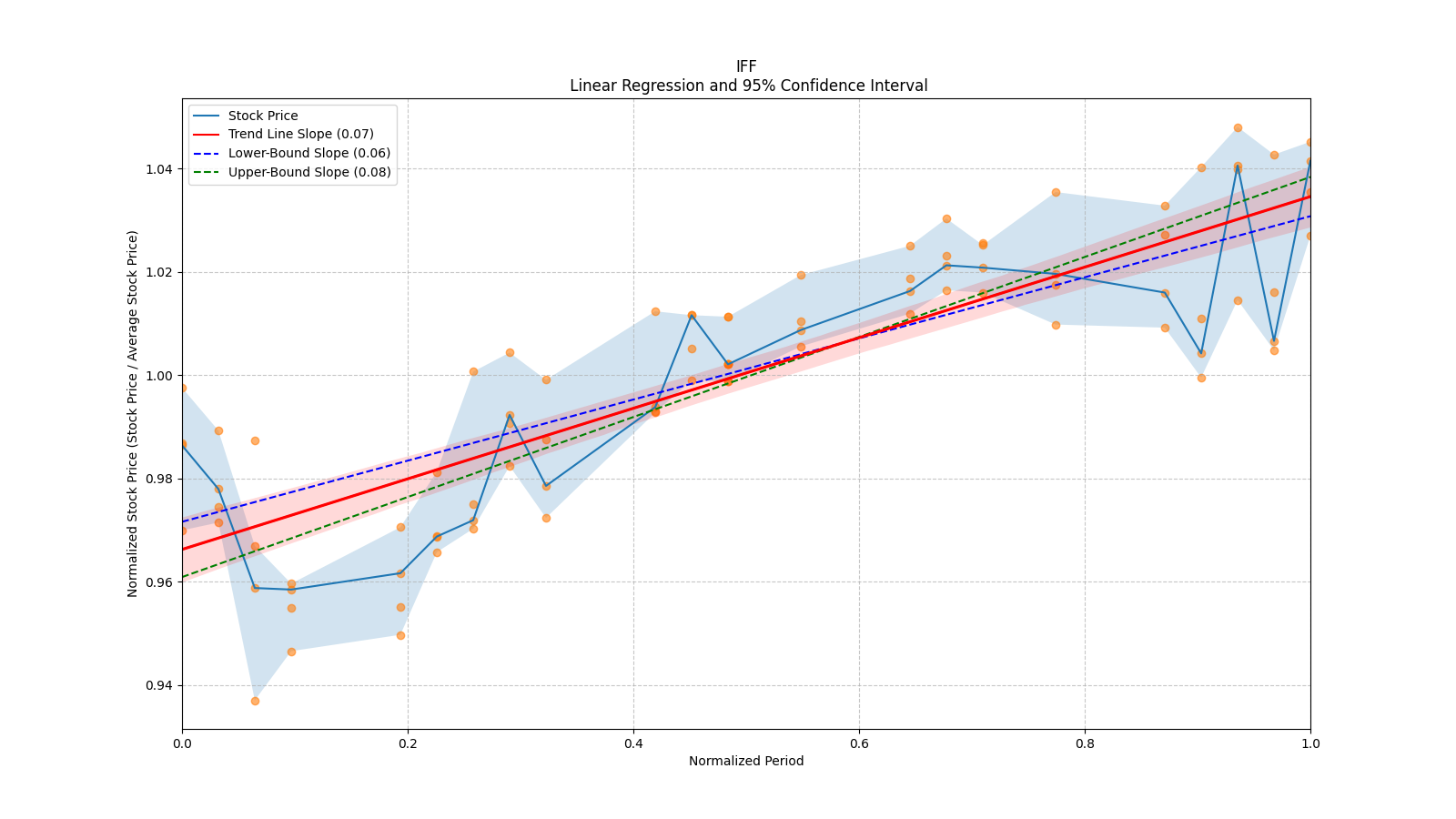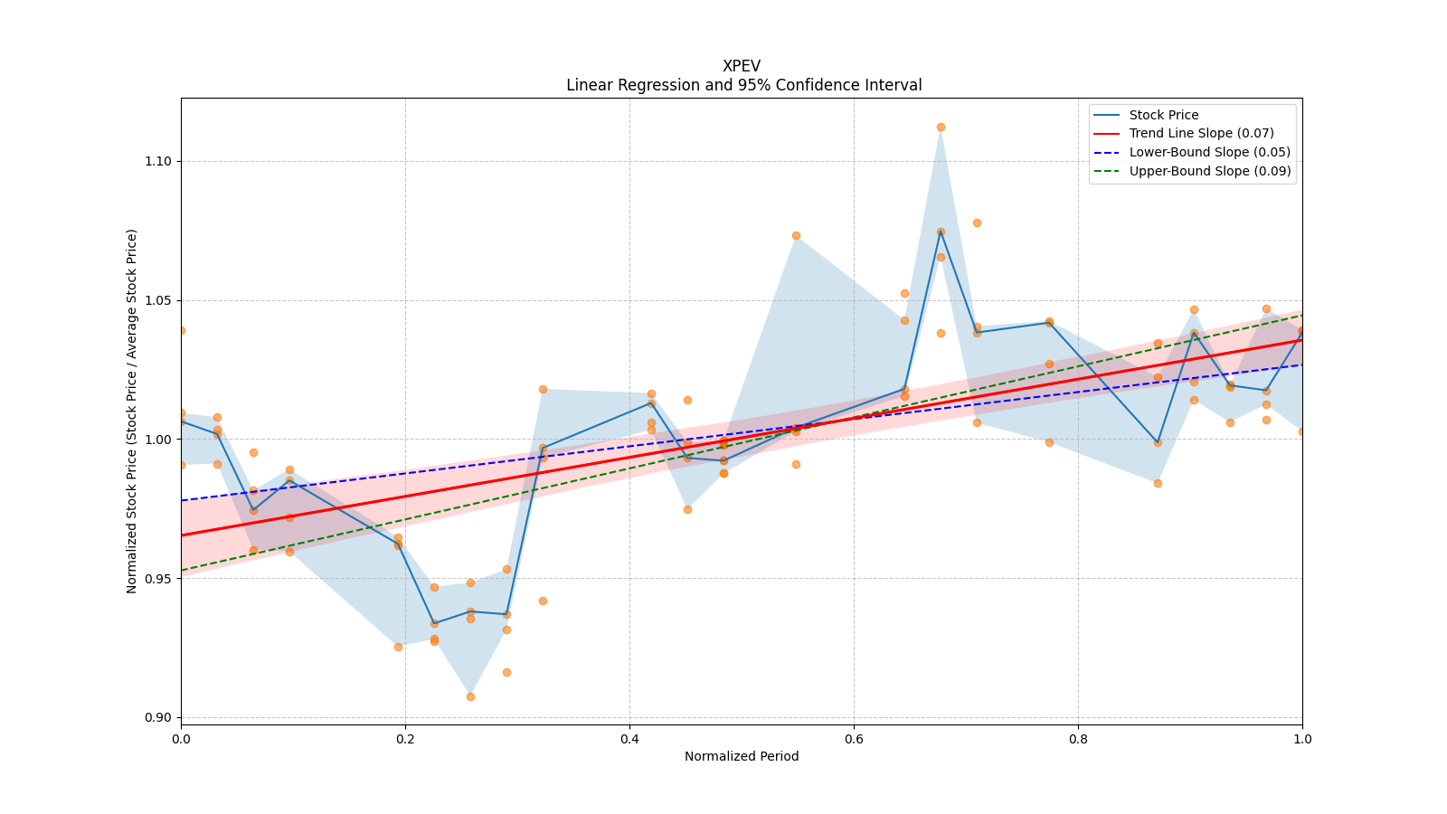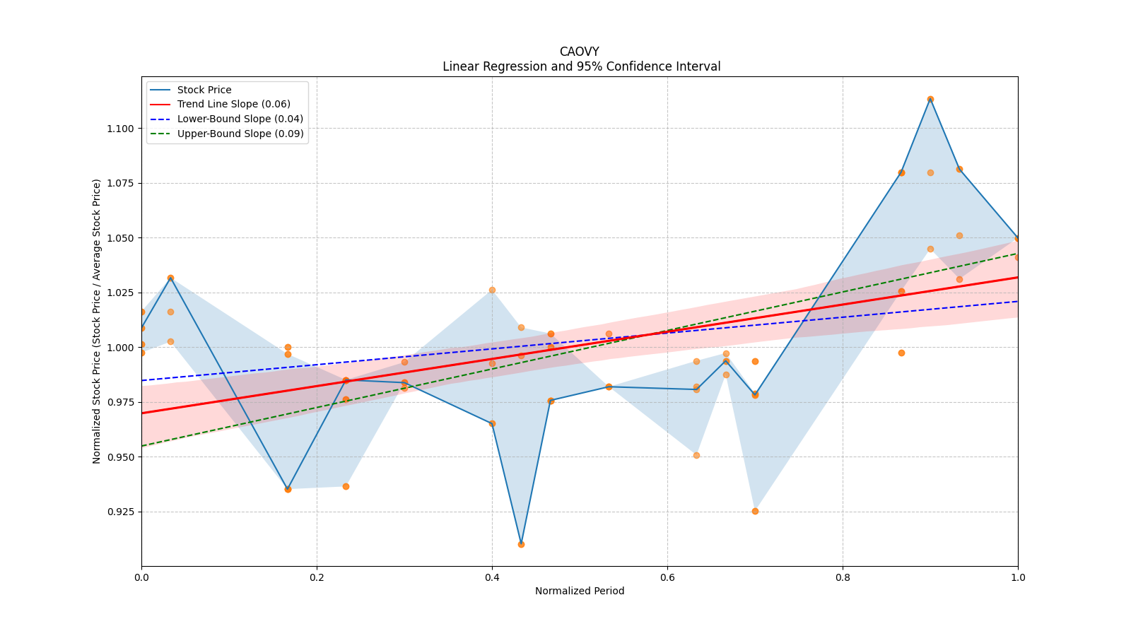 Stocks were filtered to have a high investor grade, analyzed using linear regression, and sorted by the lower-bound trendline slope. The lower-bound trendline slope has been normalized by the average stock price and calculated using a 95% confidence interval. This statistic provides a conservative estimate of stock price percentage growth, taking into account both the trends and volatility of the stock price over the past month. With these details, you can easily compare stocks by their historical performance.