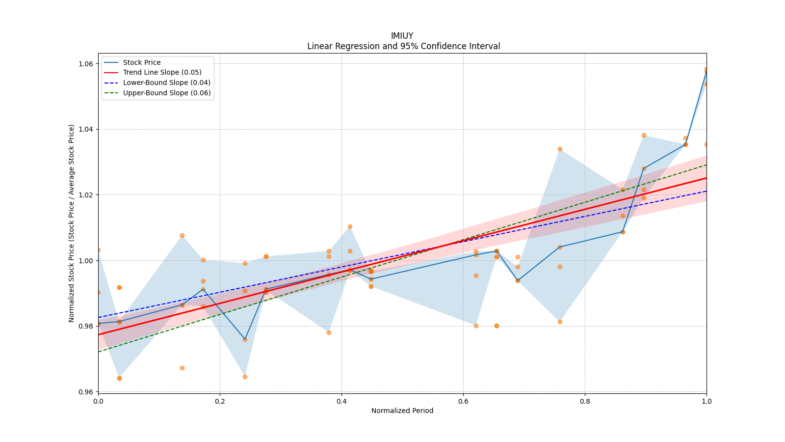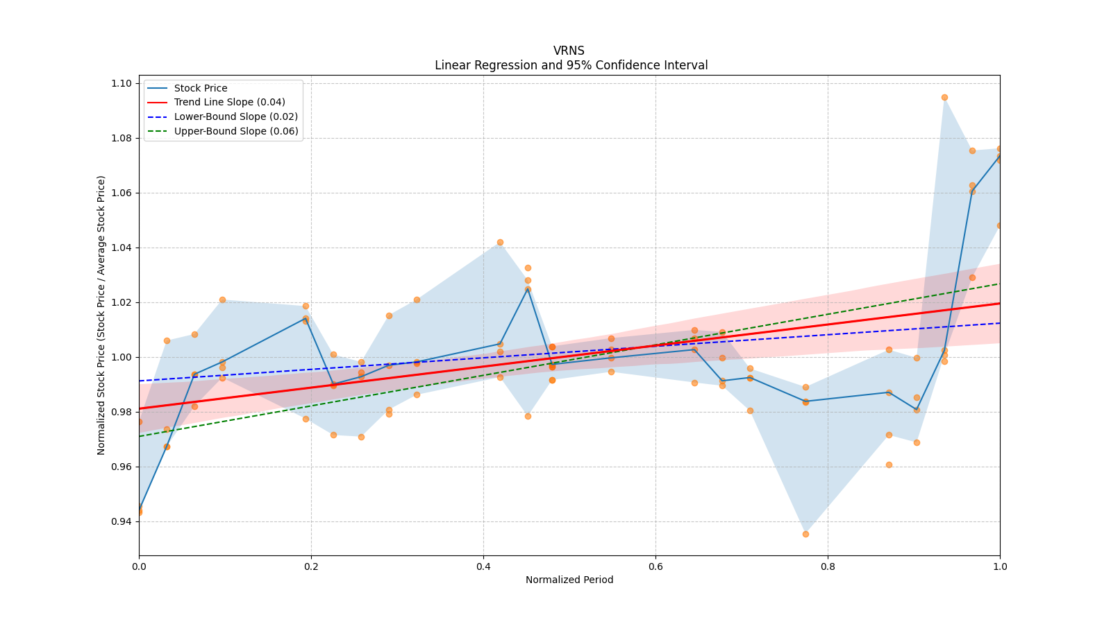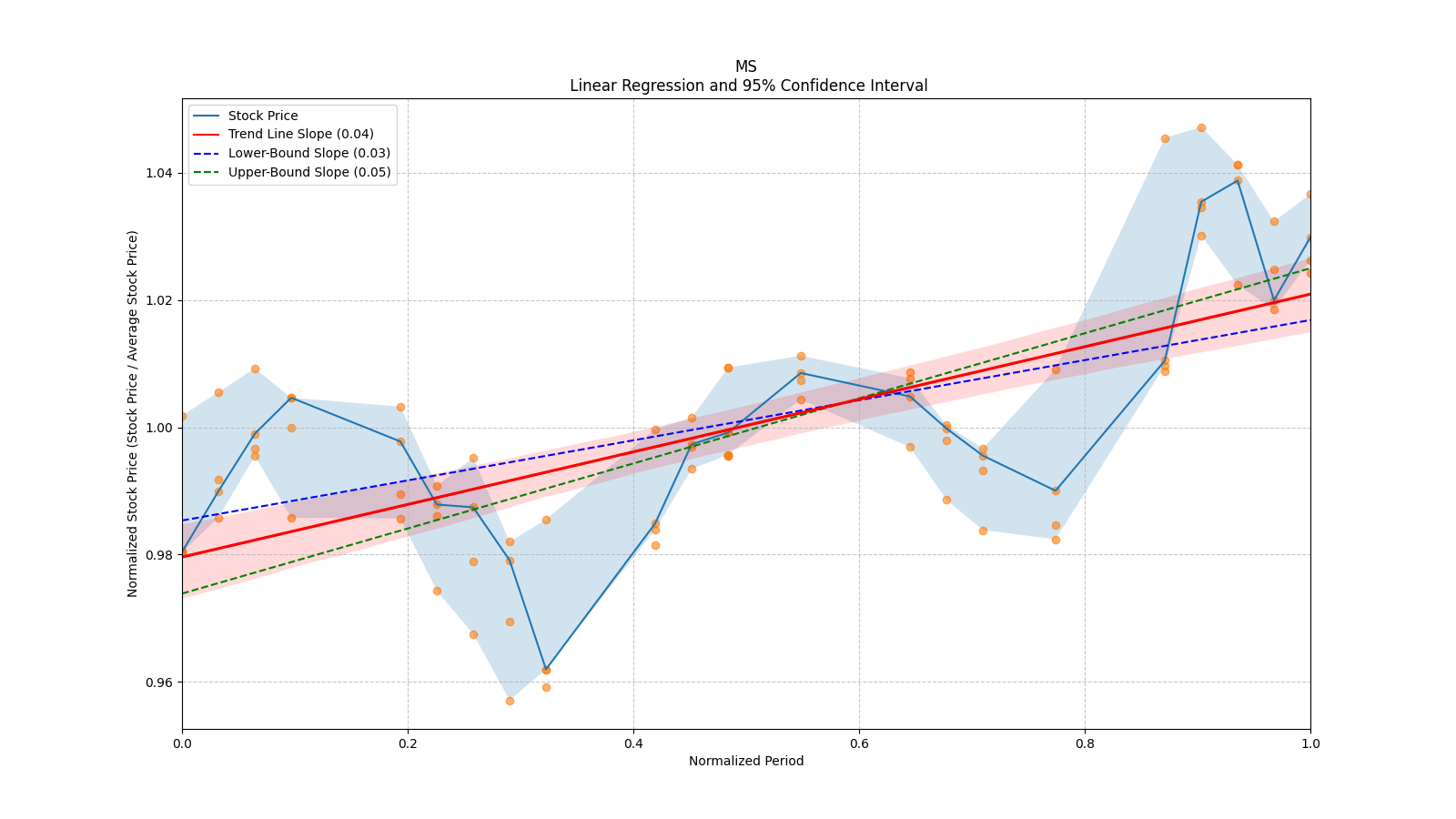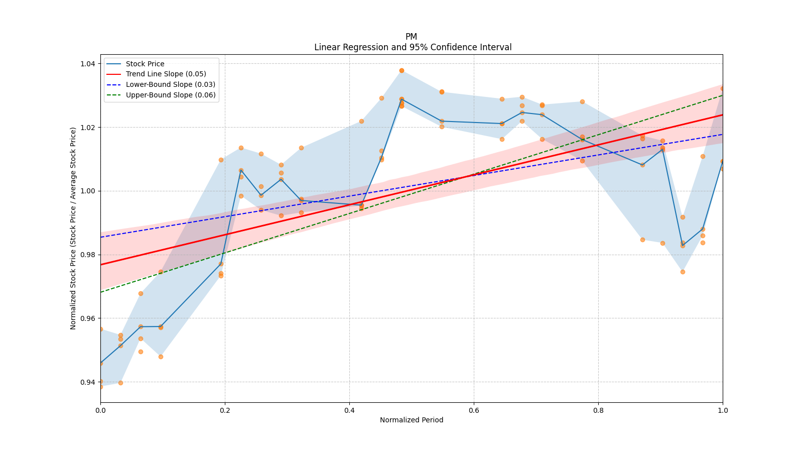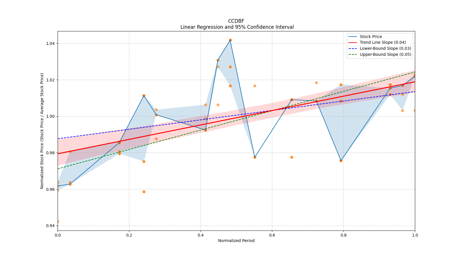Stocks were filtered to have a high investor grade, analyzed using linear regression, and sorted by the lower-bound trendline slope. The lower-bound trendline slope has been normalized by the average stock price and calculated using a 95% confidence interval. This statistic provides a conservative estimate of stock price percentage growth, taking into account both the trends and volatility of the stock price over the past month. With these details, you can easily compare stocks by their historical performance.