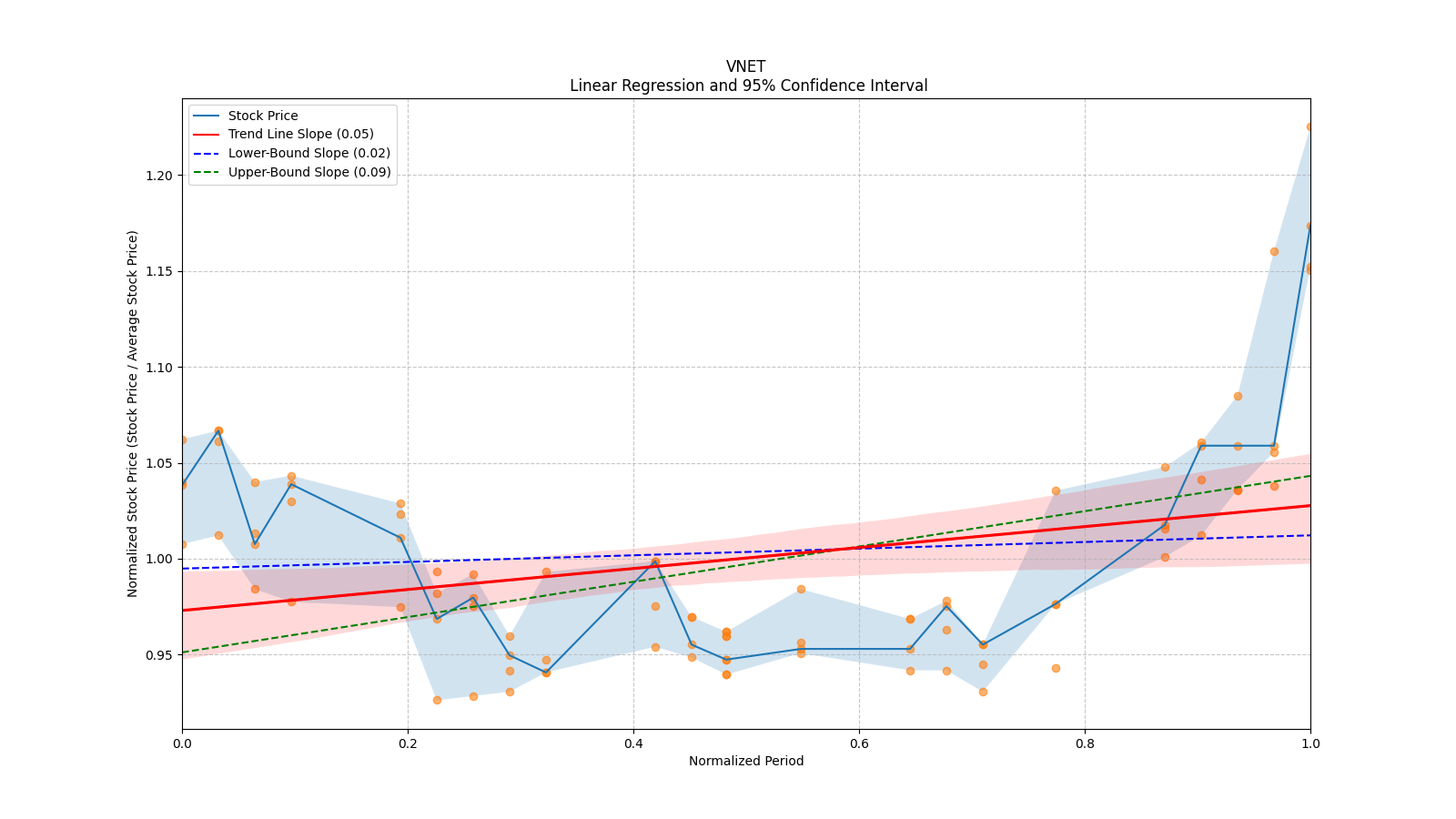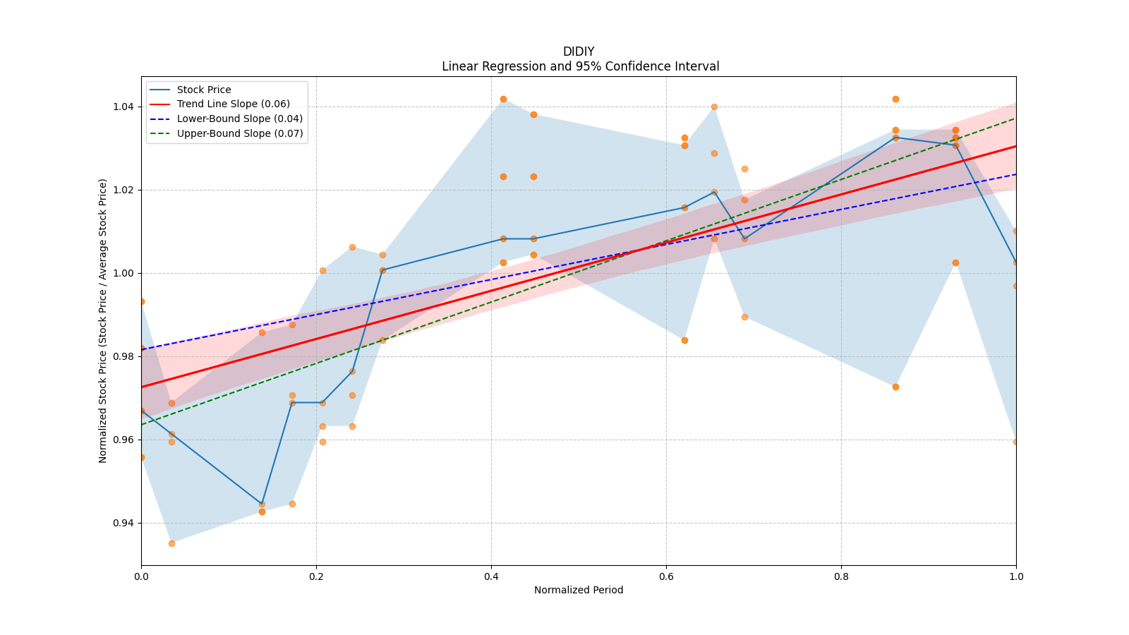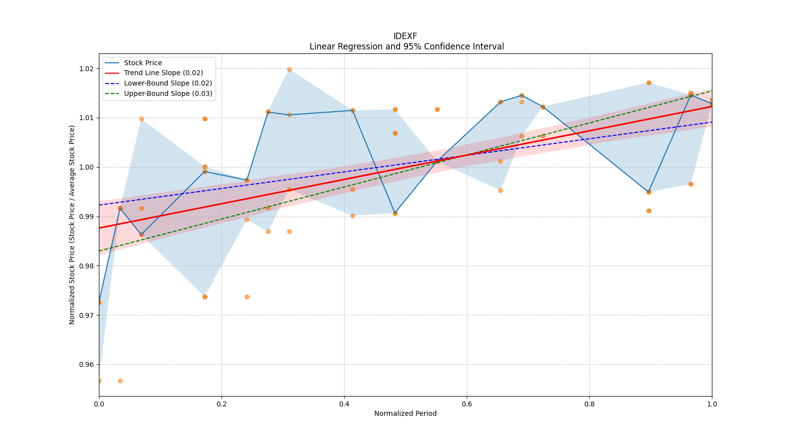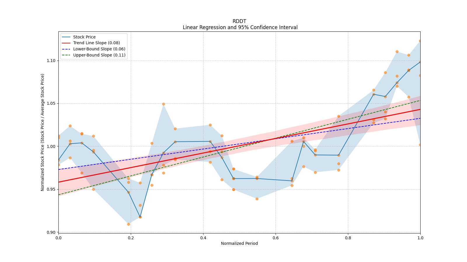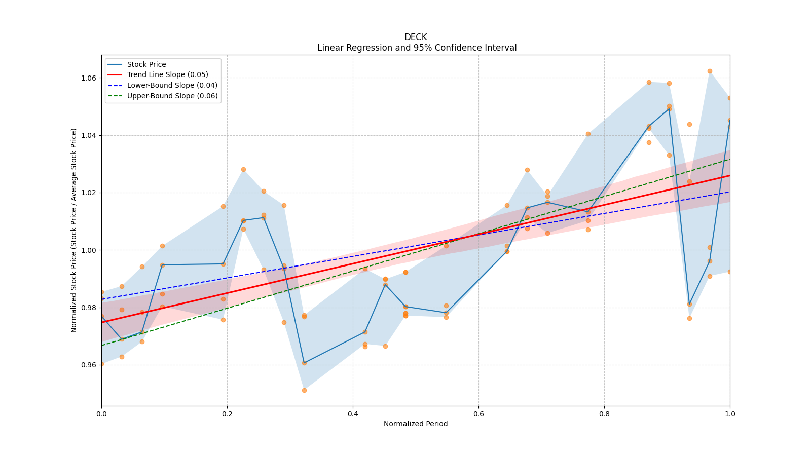 Stocks were filtered to have a high investor grade, analyzed using linear regression, and sorted by the lower-bound trendline slope. The lower-bound trendline slope has been normalized by the average stock price and calculated using a 95% confidence interval. This statistic provides a conservative estimate of stock price percentage growth, taking into account both the trends and volatility of the stock price over the past month. With these details, you can easily compare stocks by their historical performance.