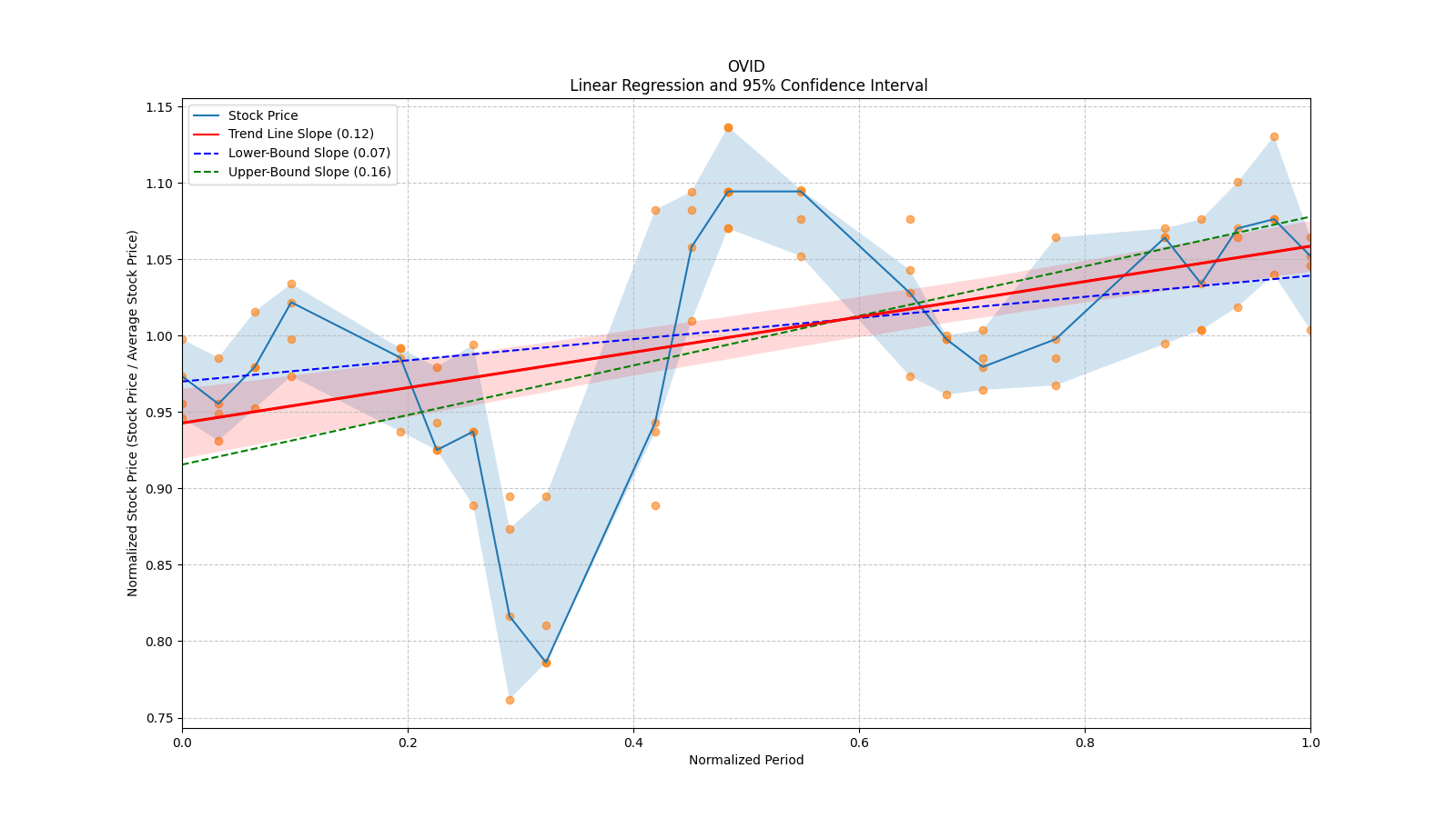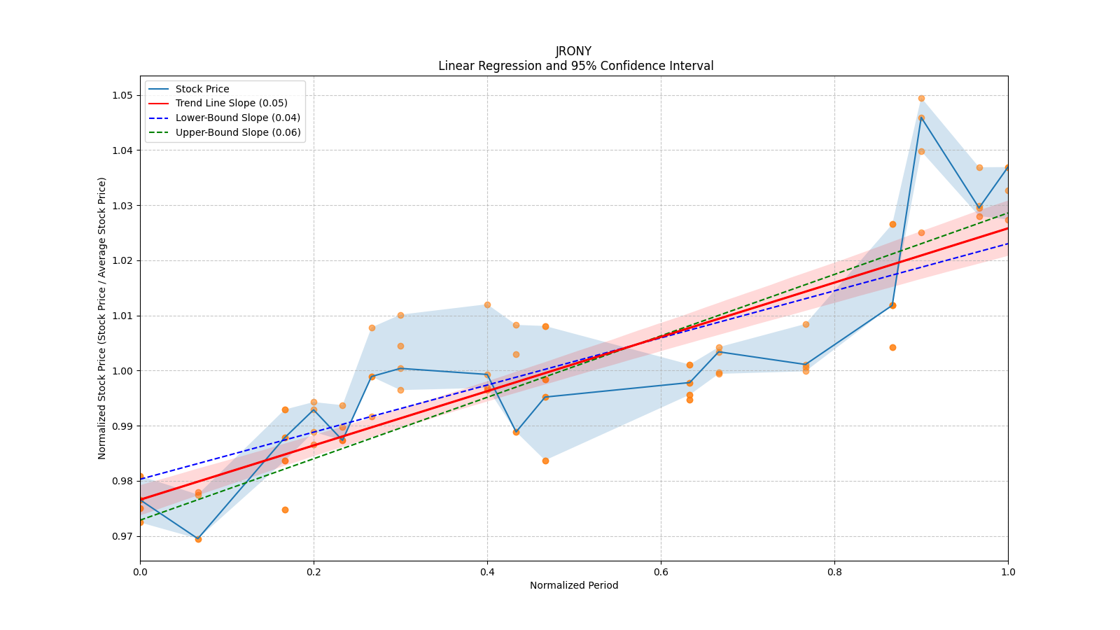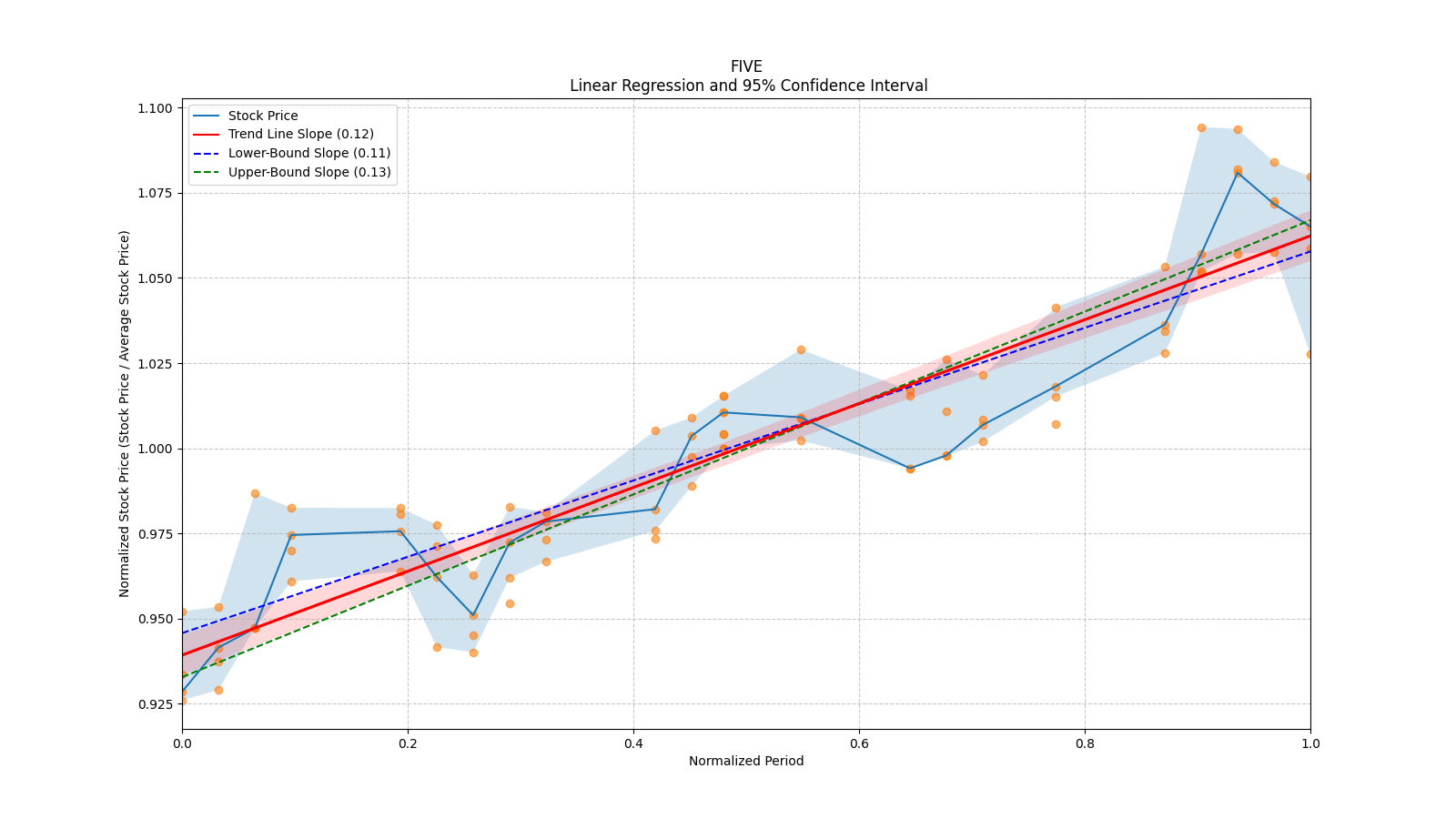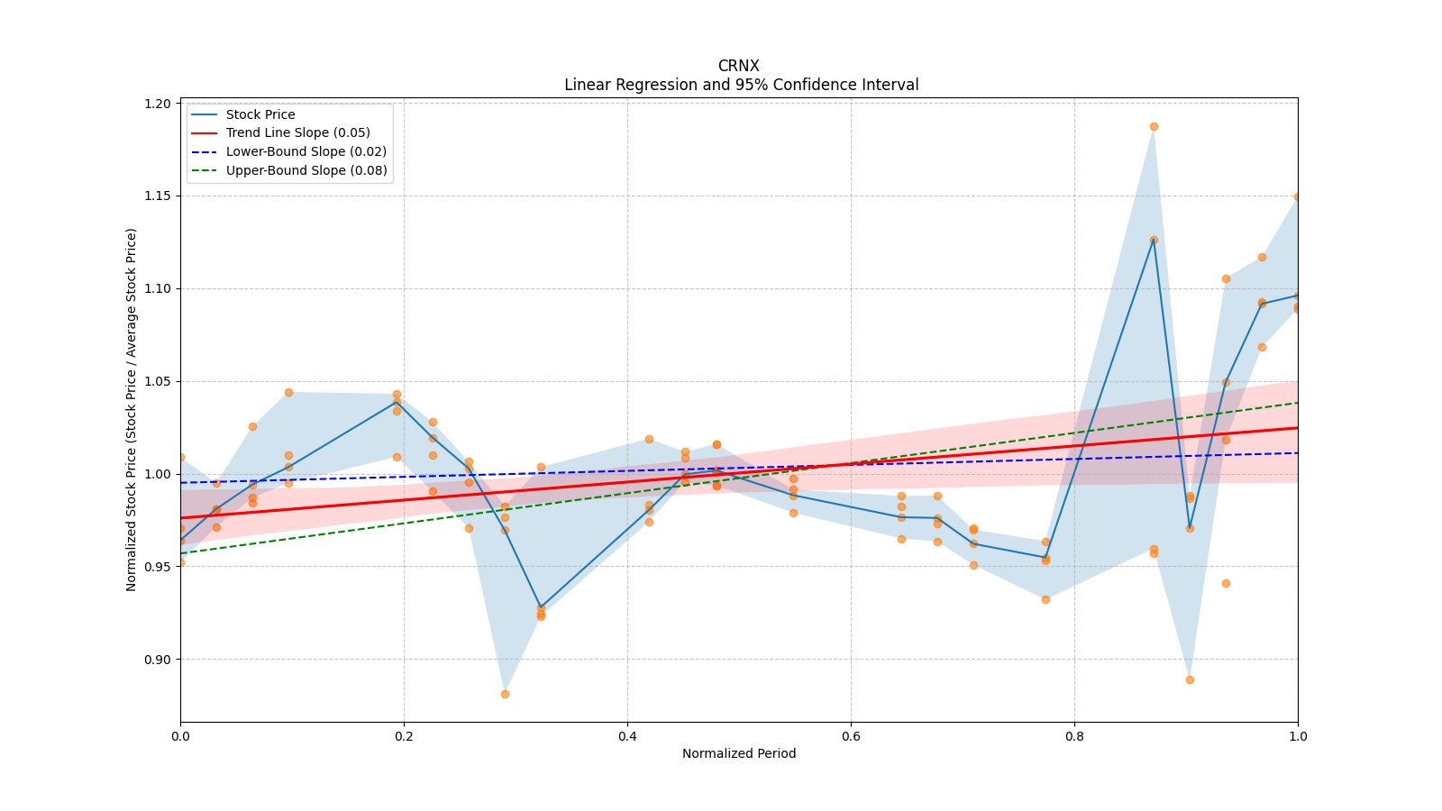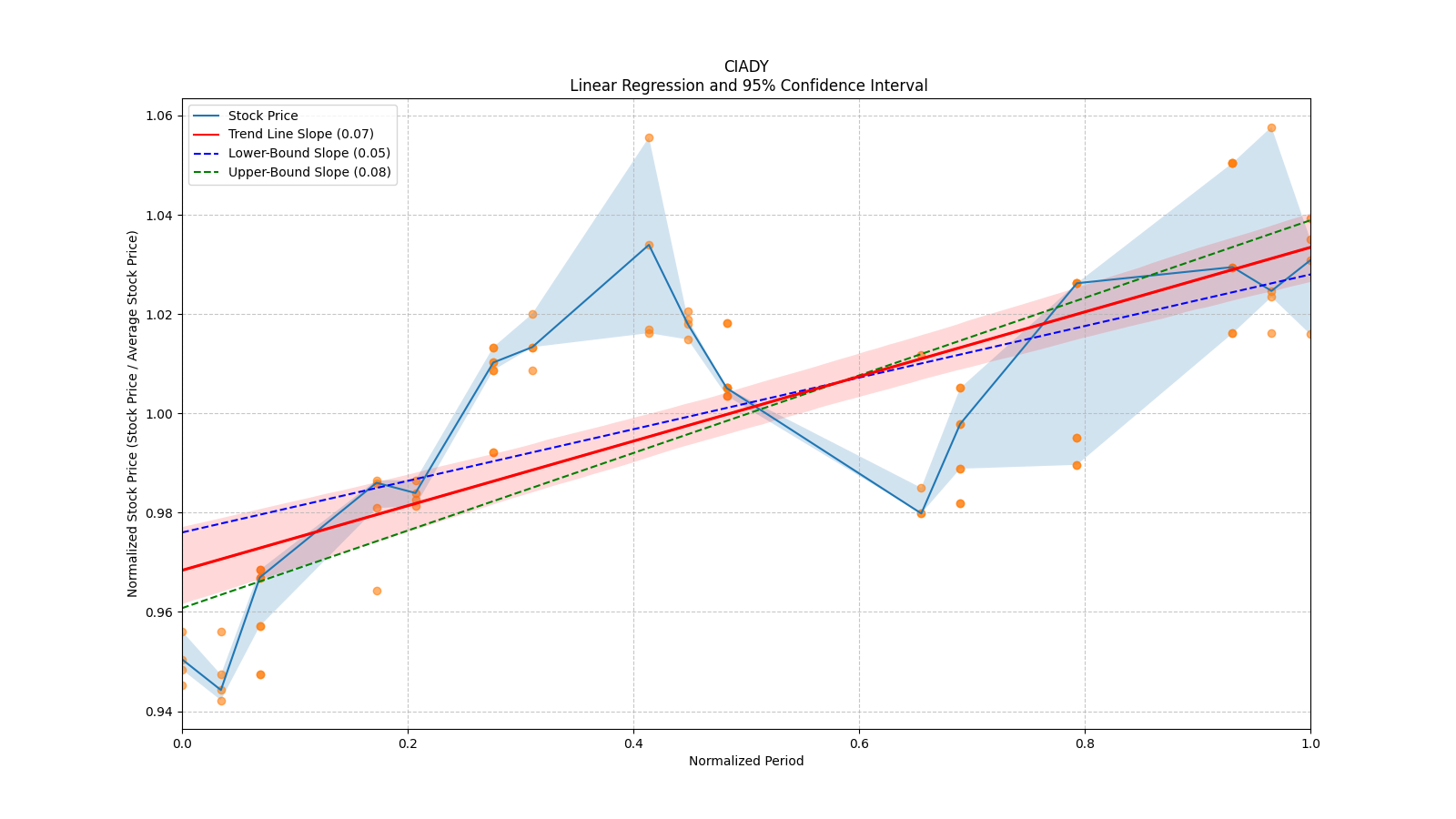 Stocks were filtered to have a high investor grade, analyzed using linear regression, and sorted by the lower-bound trendline slope. The lower-bound trendline slope has been normalized by the average stock price and calculated using a 95% confidence interval. This statistic provides a conservative estimate of stock price percentage growth, taking into account both the trends and volatility of the stock price over the past month. With these details, you can easily compare stocks by their historical performance.