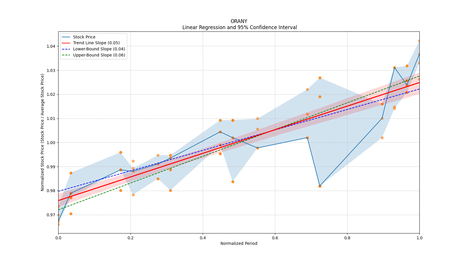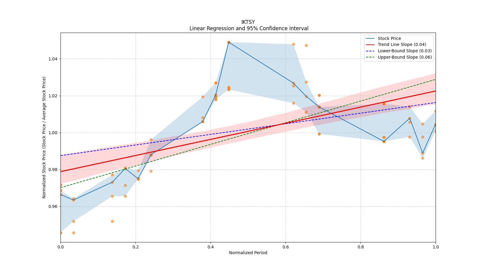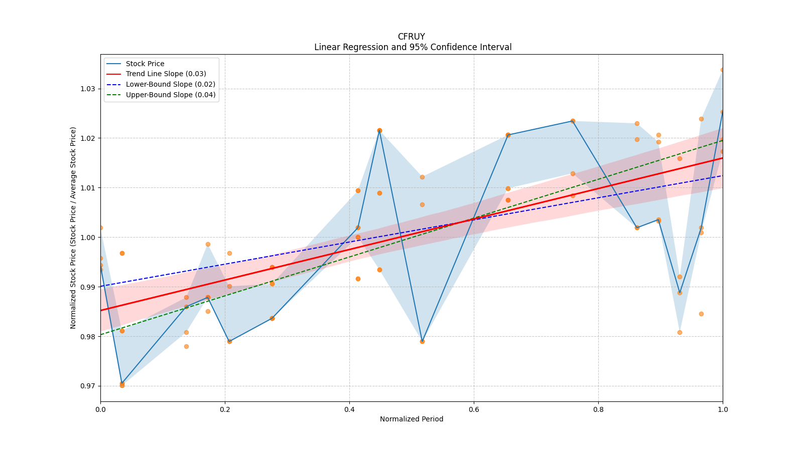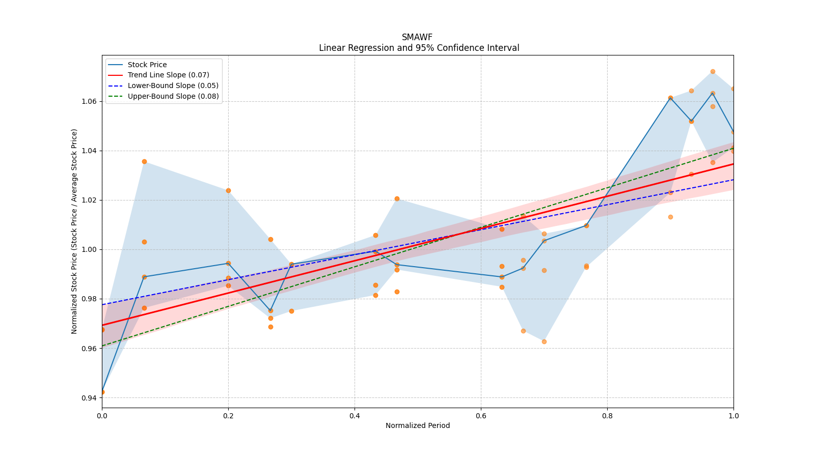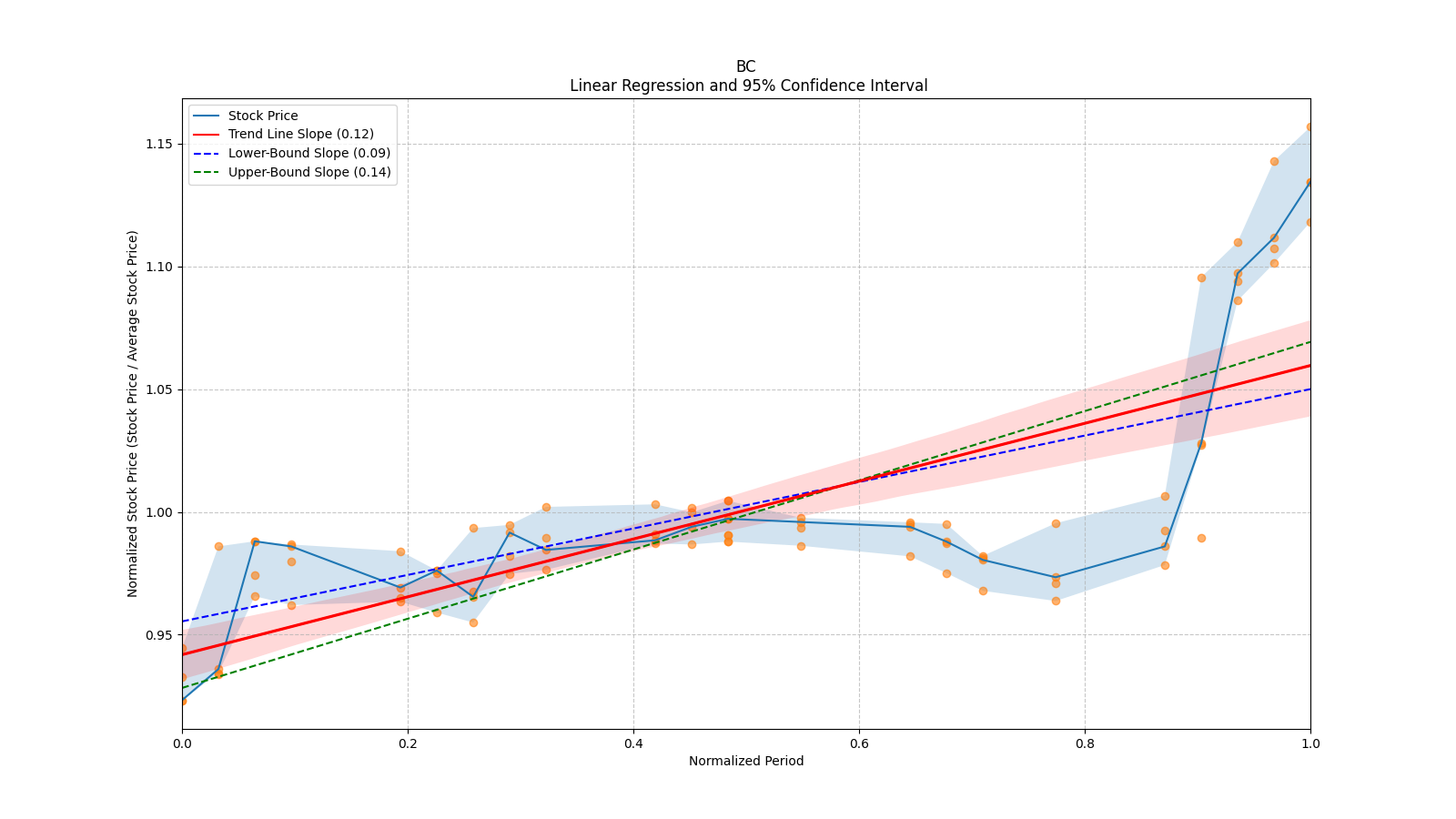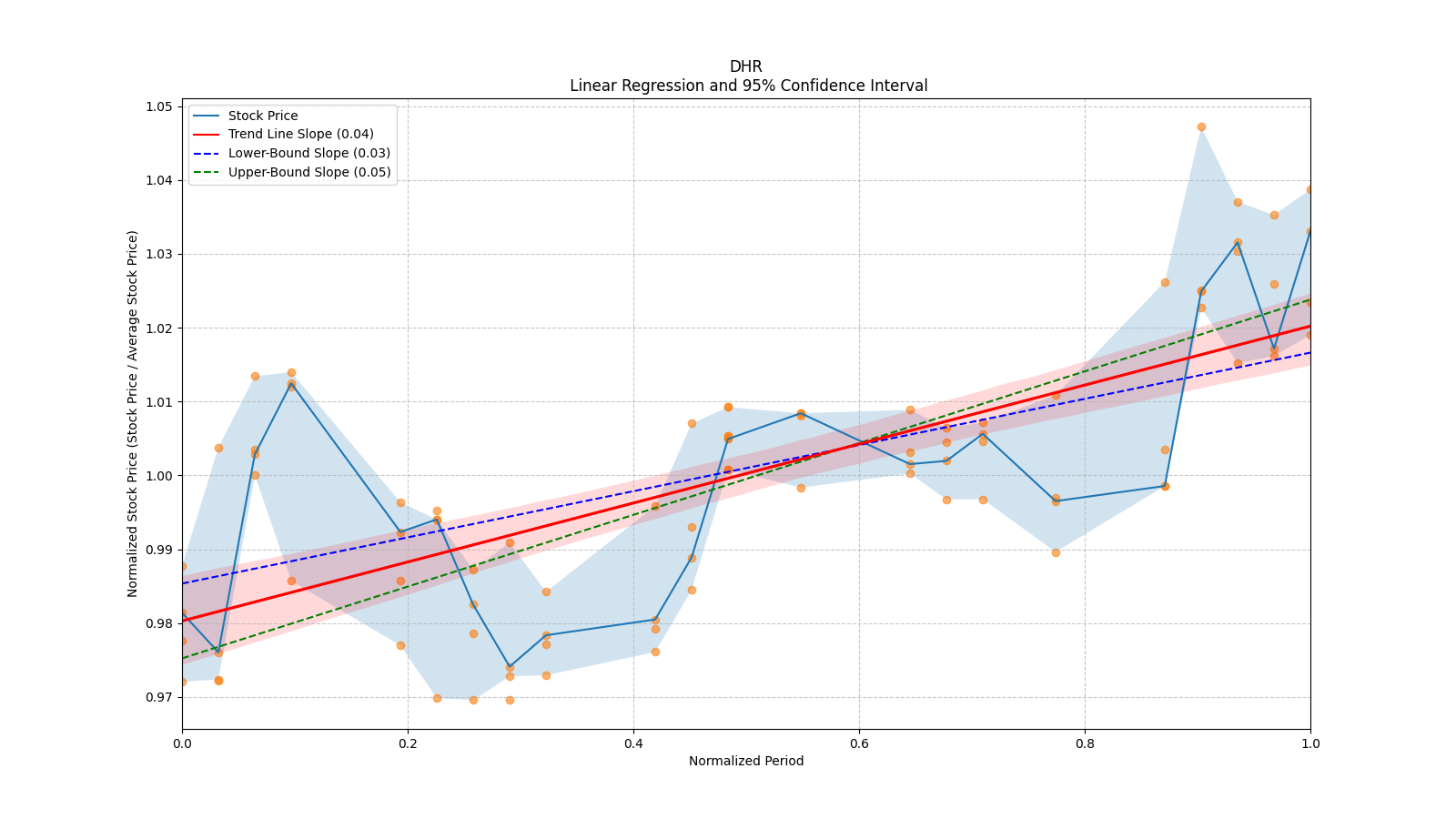 Stocks were filtered to have a high investor grade, analyzed using linear regression, and sorted by the lower-bound trendline slope. The lower-bound trendline slope has been normalized by the average stock price and calculated using a 95% confidence interval. This statistic provides a conservative estimate of stock price percentage growth, taking into account both the trends and volatility of the stock price over the past month. With these details, you can easily compare stocks by their historical performance.