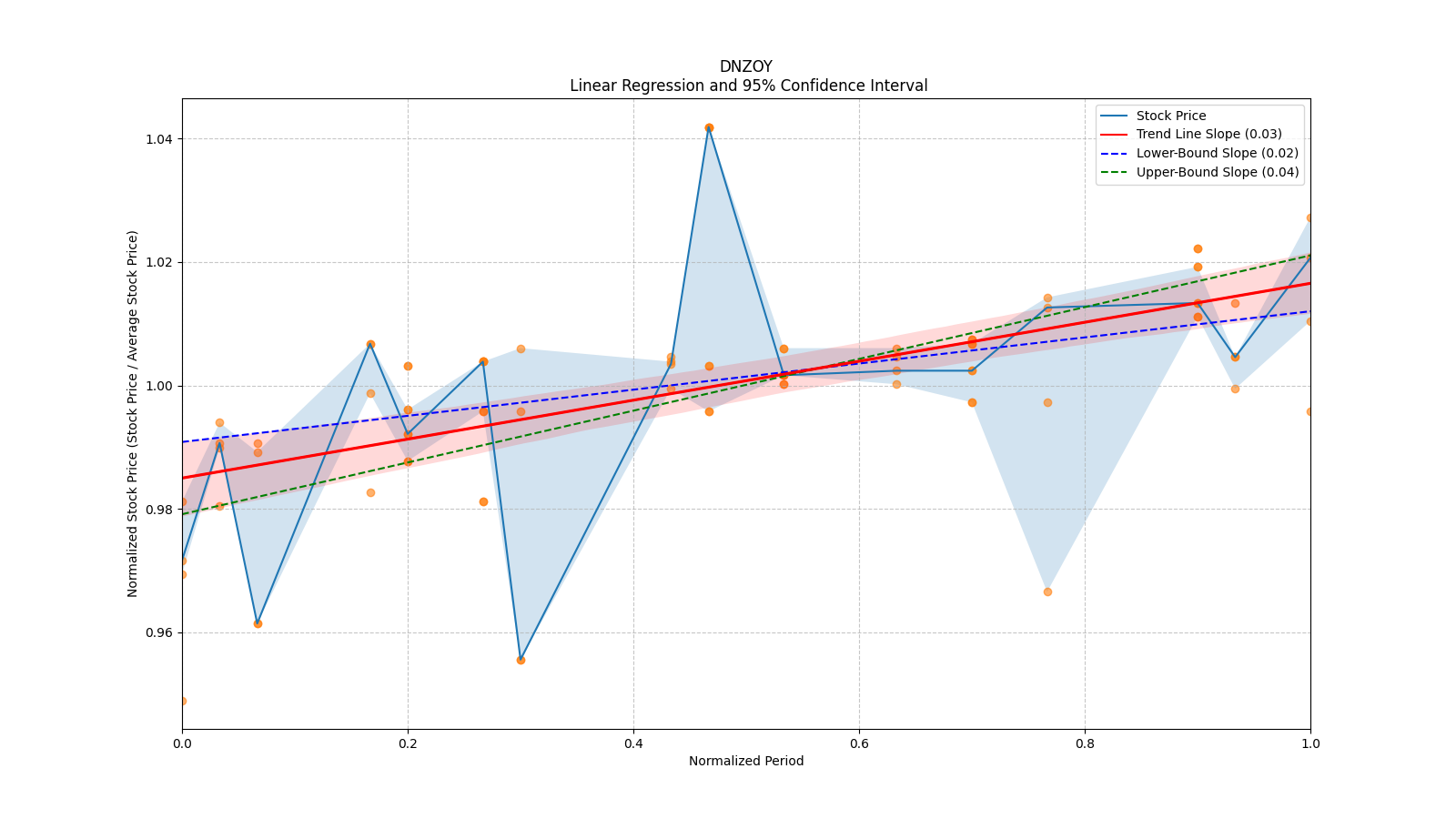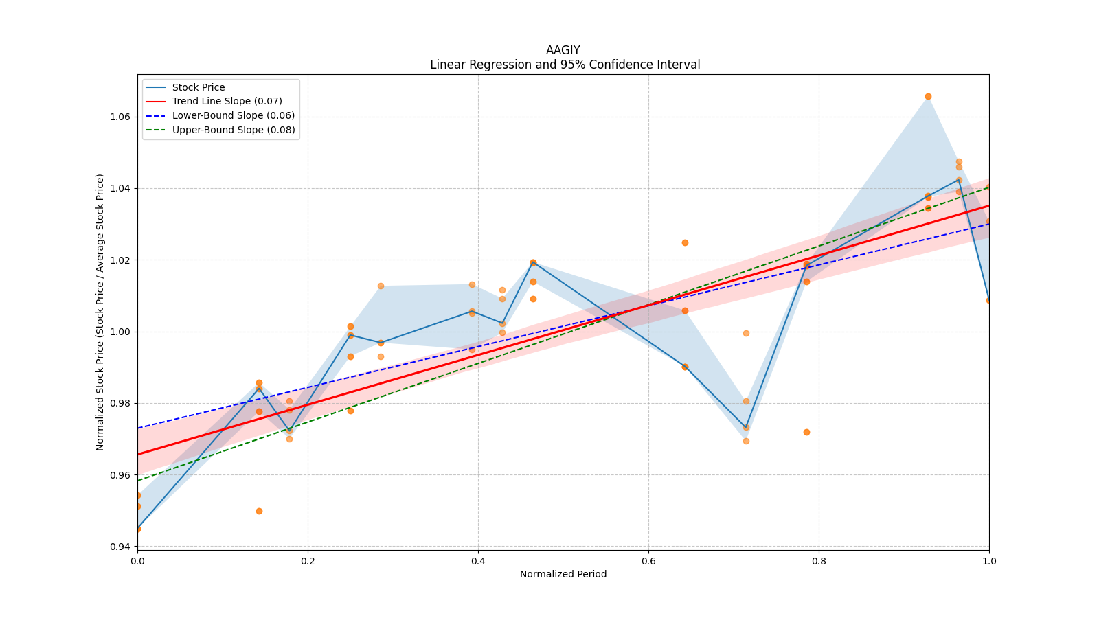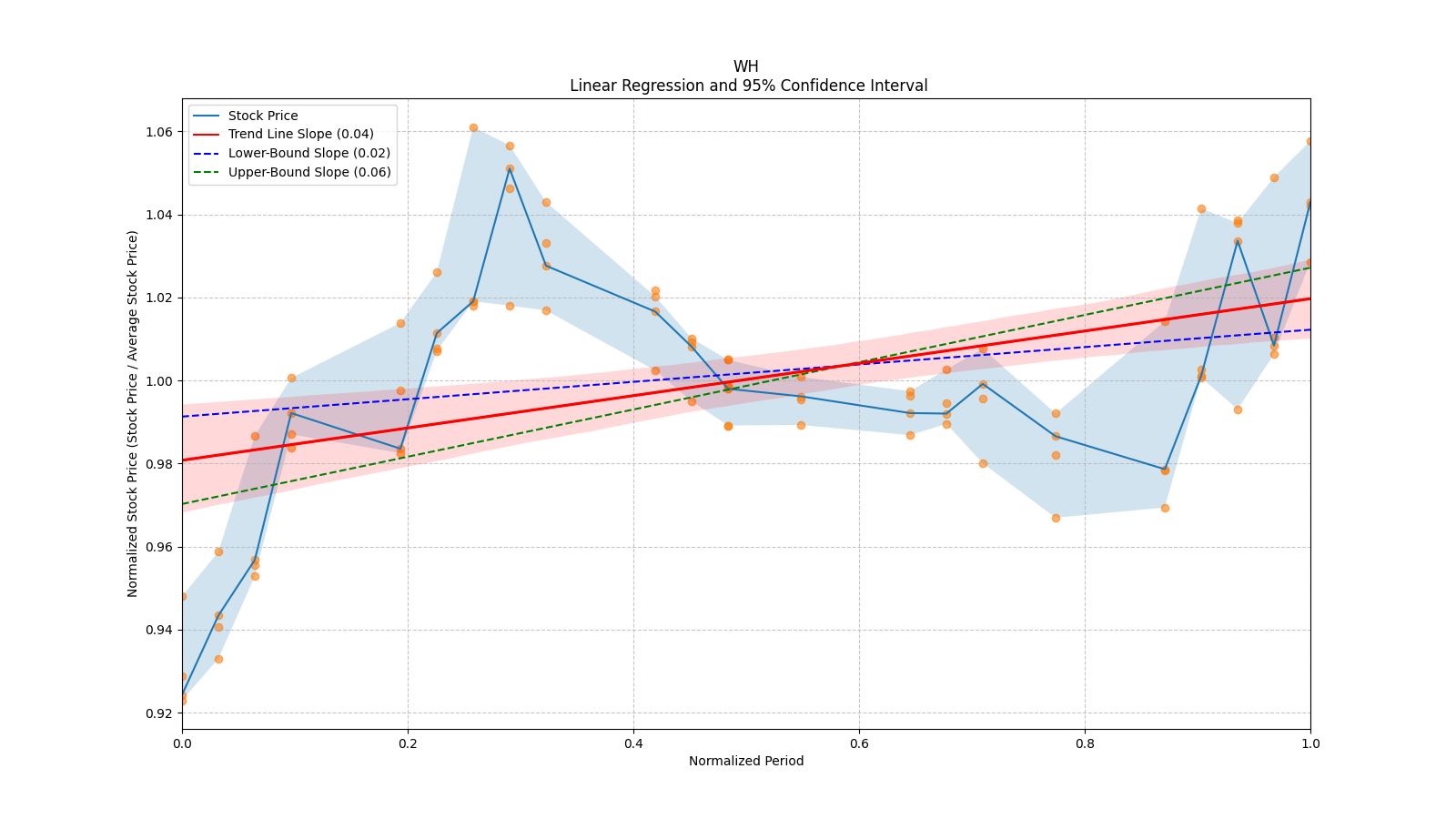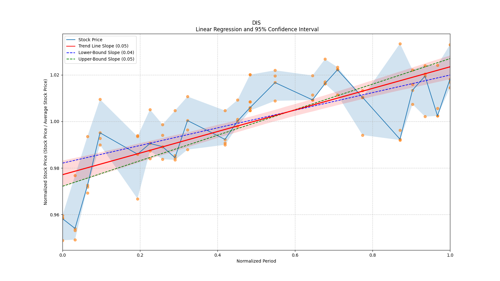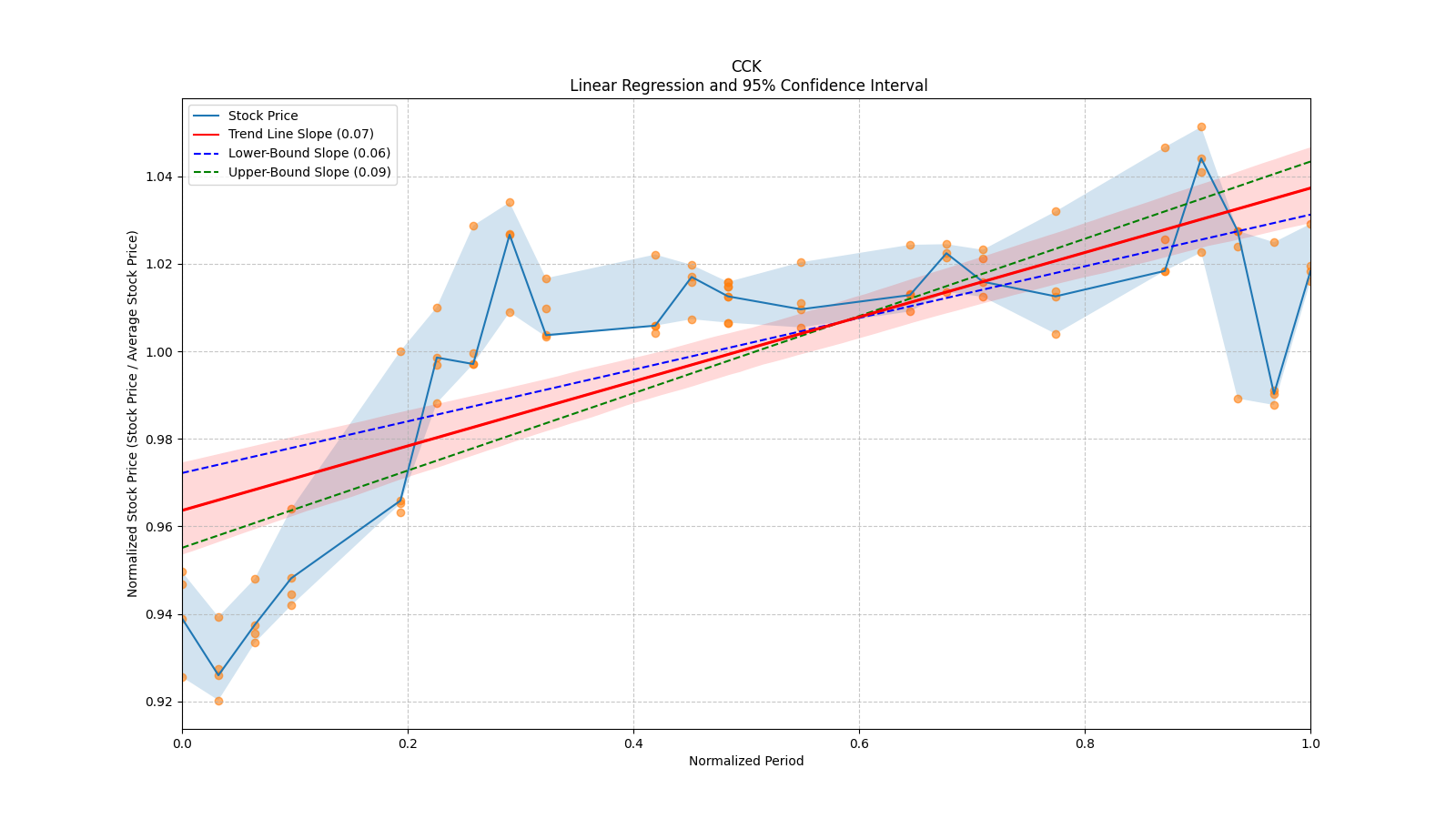 Stocks were filtered to have a high investor grade, analyzed using linear regression, and sorted by the lower-bound trendline slope. The lower-bound trendline slope has been normalized by the average stock price and calculated using a 95% confidence interval. This statistic provides a conservative estimate of stock price percentage growth, taking into account both the trends and volatility of the stock price over the past month. With these details, you can easily compare stocks by their historical performance.