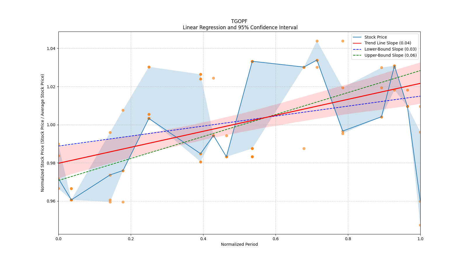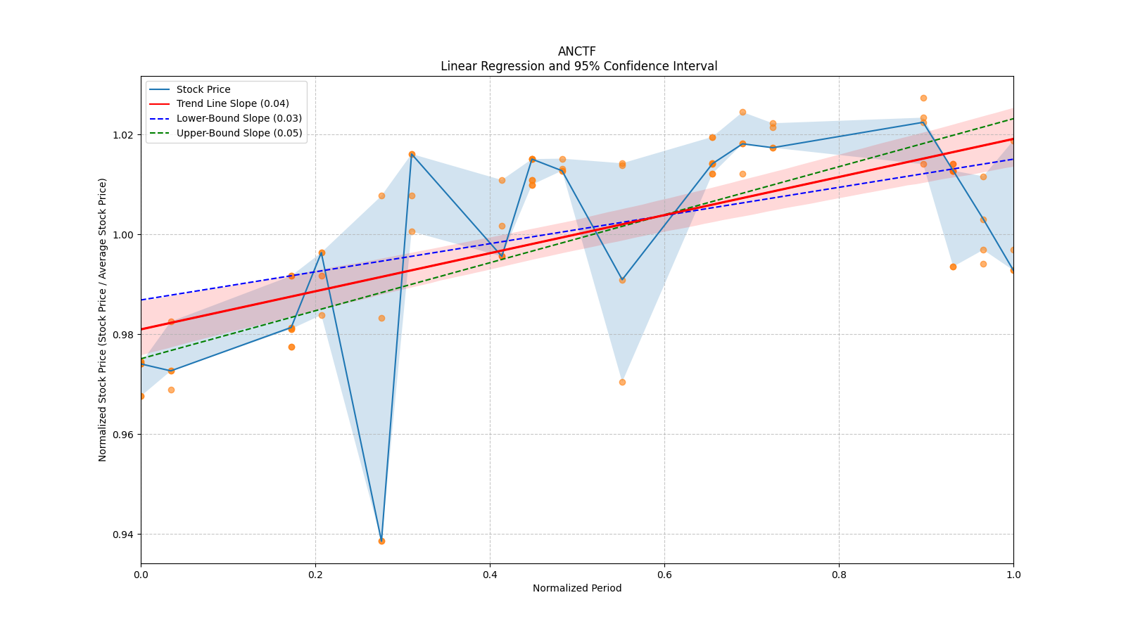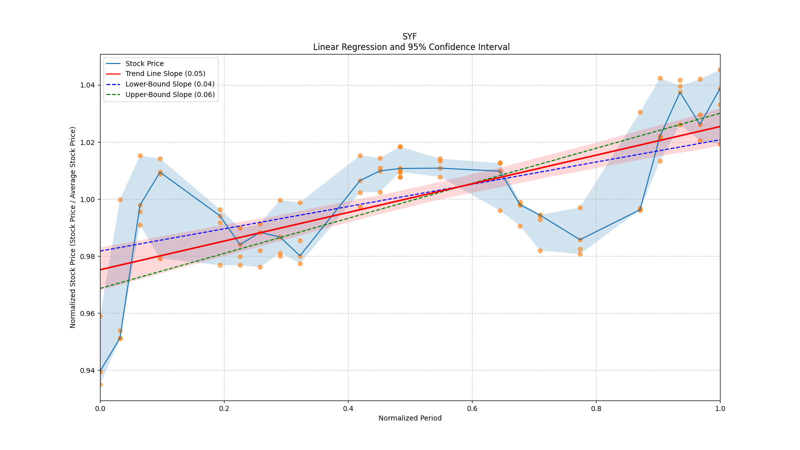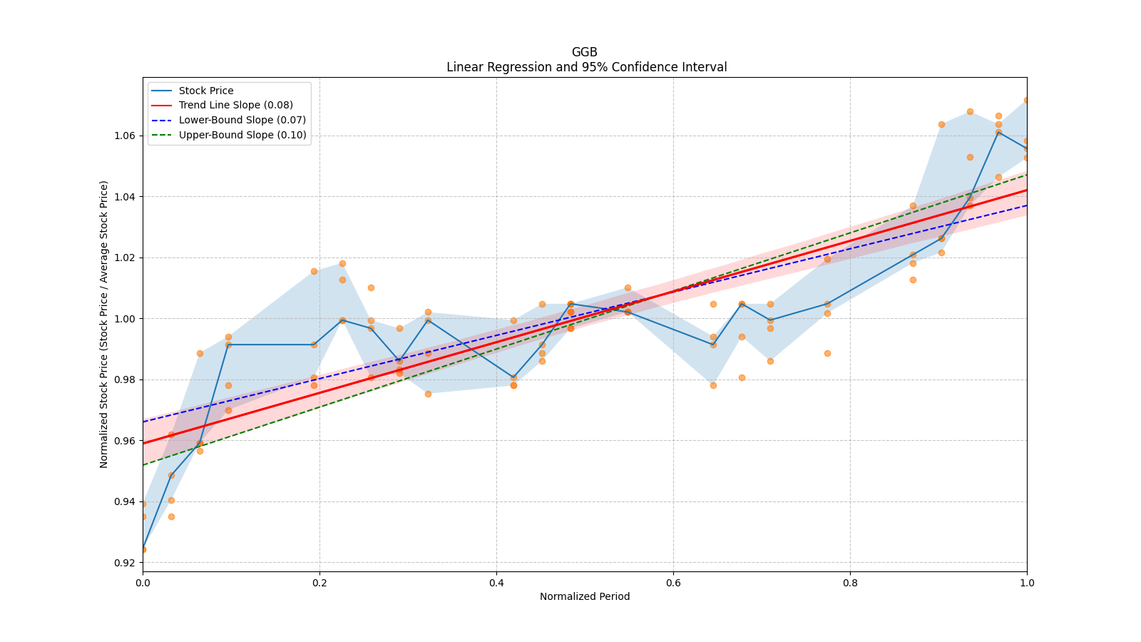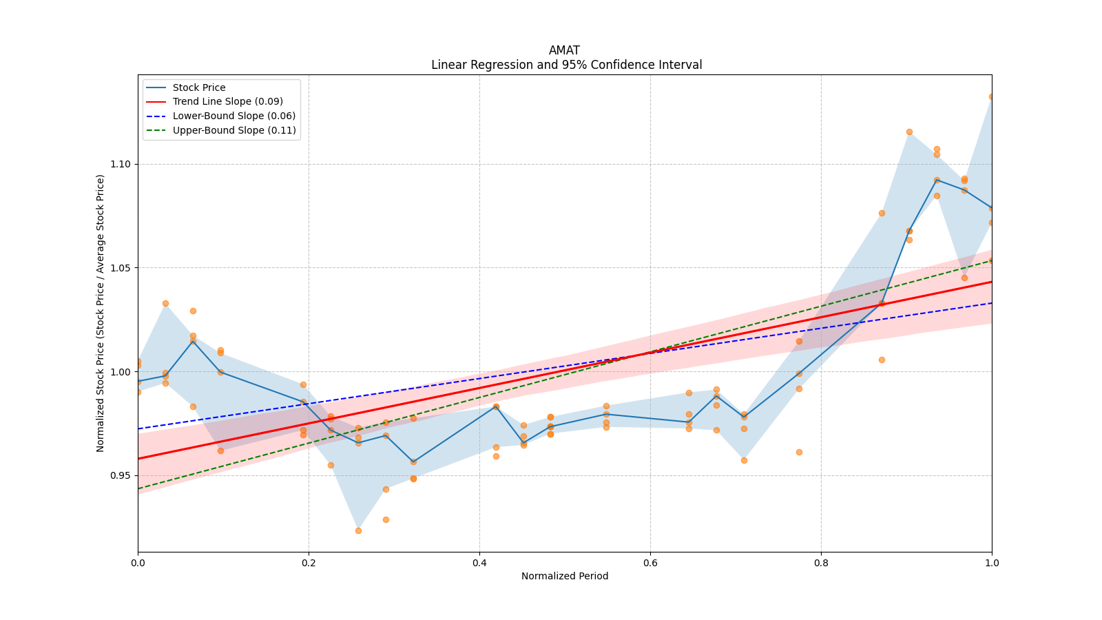Stocks were filtered to have a high investor grade, analyzed using linear regression, and sorted by the lower-bound trendline slope. The lower-bound trendline slope has been normalized by the average stock price and calculated using a 95% confidence interval. This statistic provides a conservative estimate of stock price percentage growth, taking into account both the trends and volatility of the stock price over the past month. With these details, you can easily compare stocks by their historical performance.