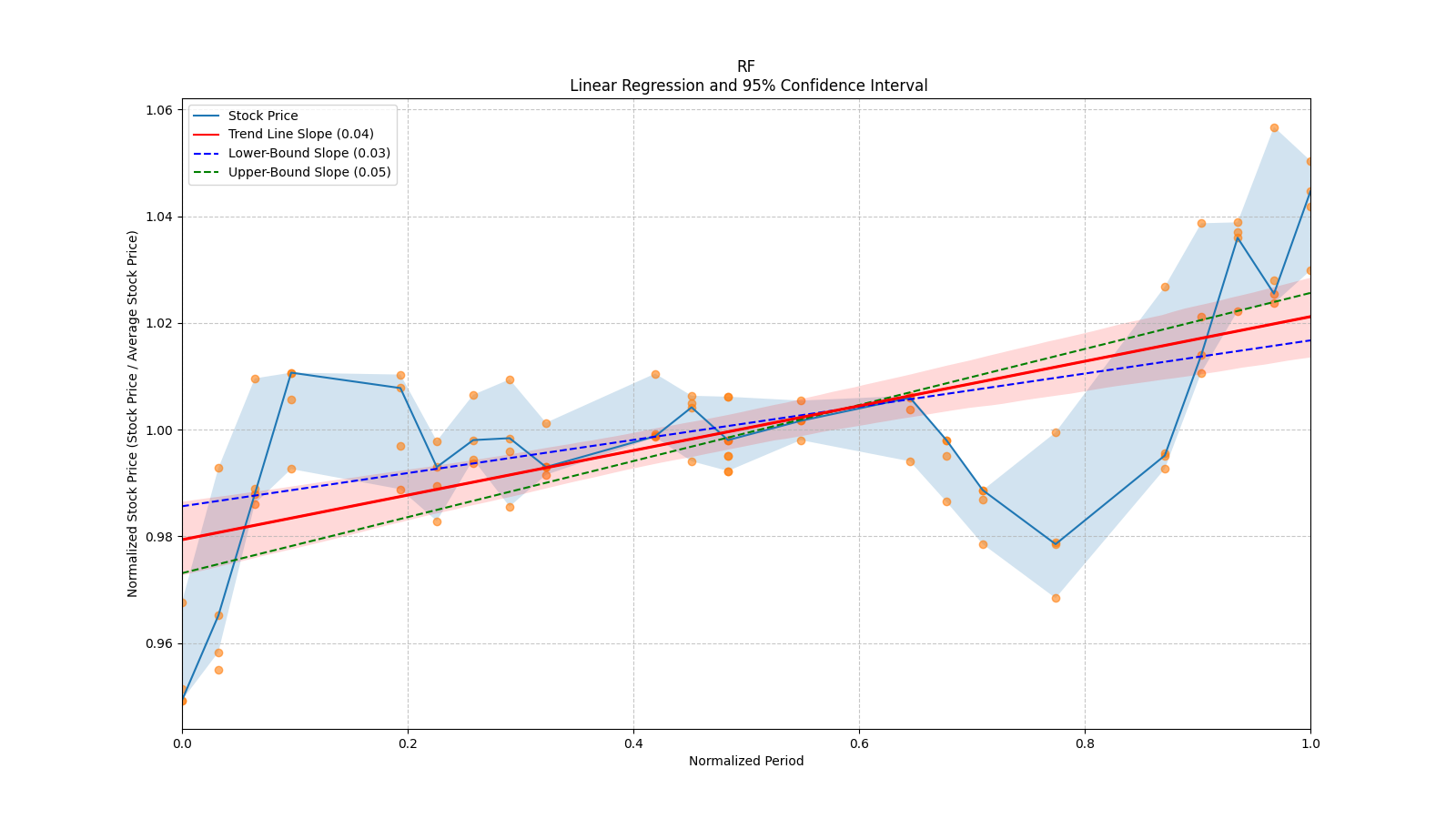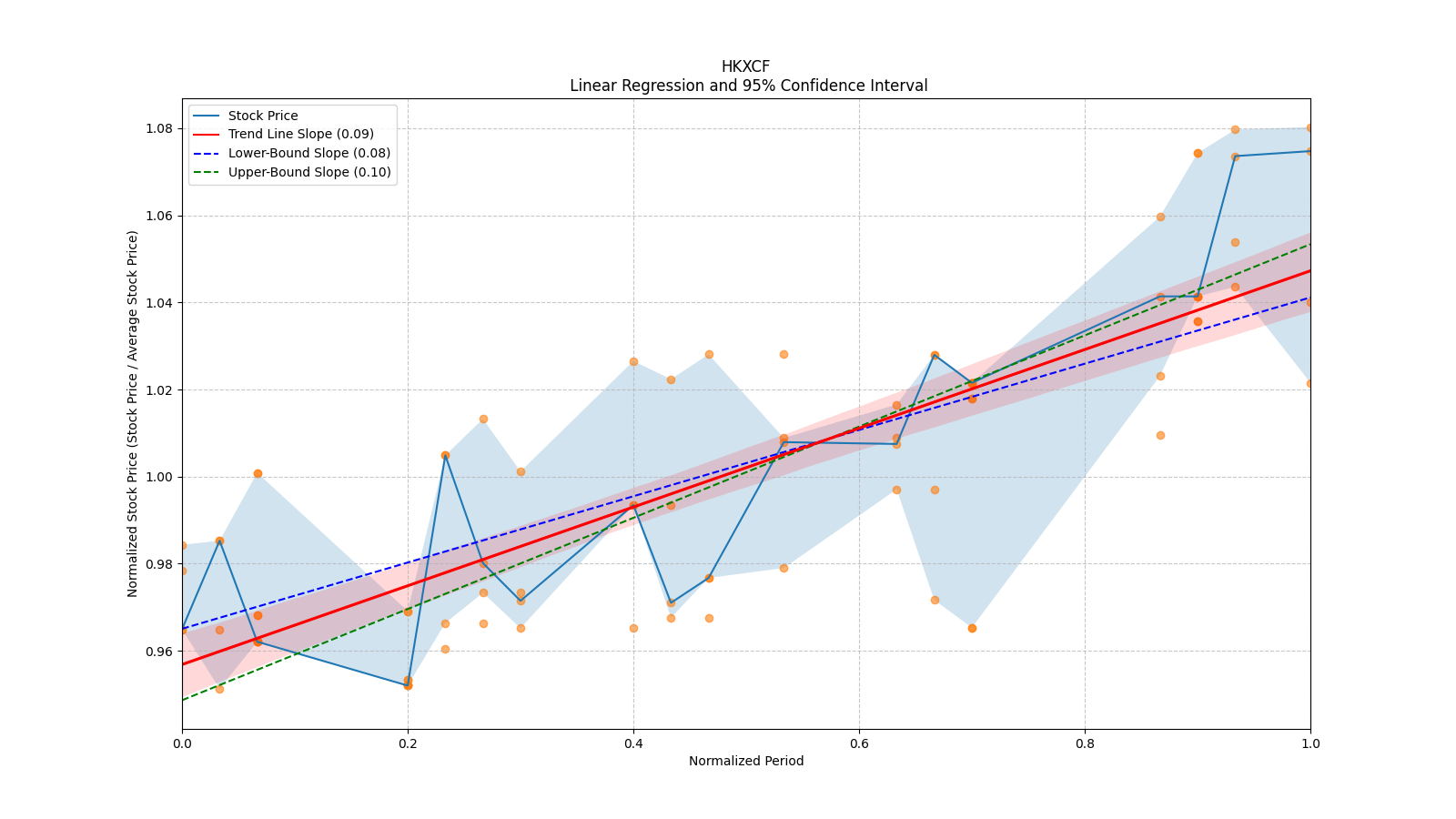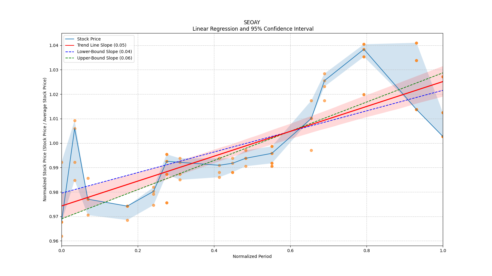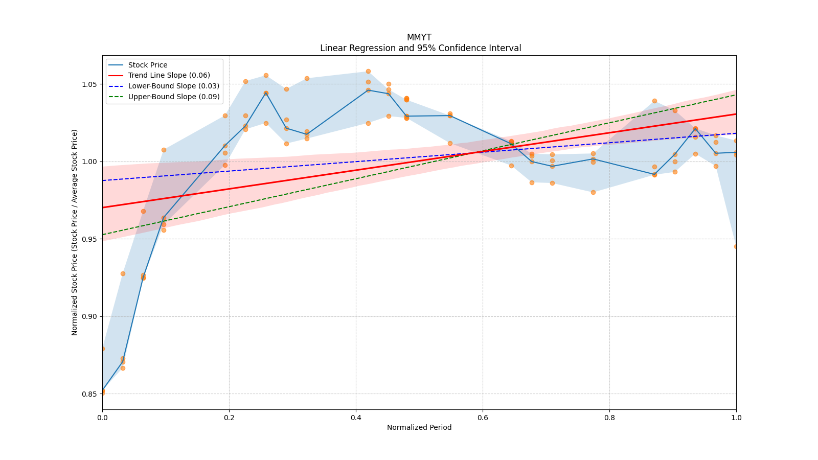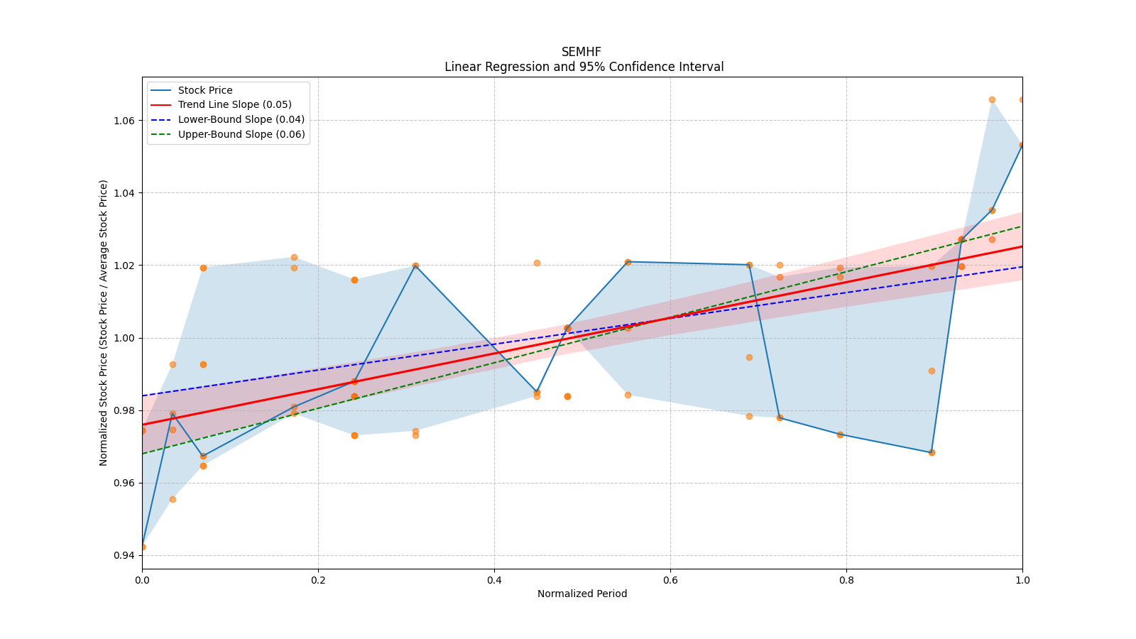 Stocks were filtered to have a high investor grade, analyzed using linear regression, and sorted by the lower-bound trendline slope. The lower-bound trendline slope has been normalized by the average stock price and calculated using a 95% confidence interval. This statistic provides a conservative estimate of stock price percentage growth, taking into account both the trends and volatility of the stock price over the past month. With these details, you can easily compare stocks by their historical performance.