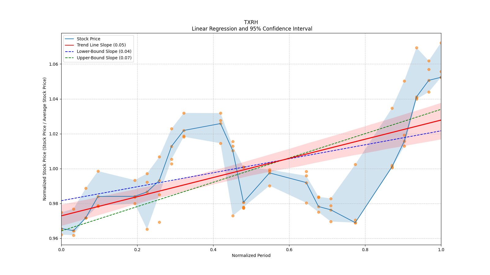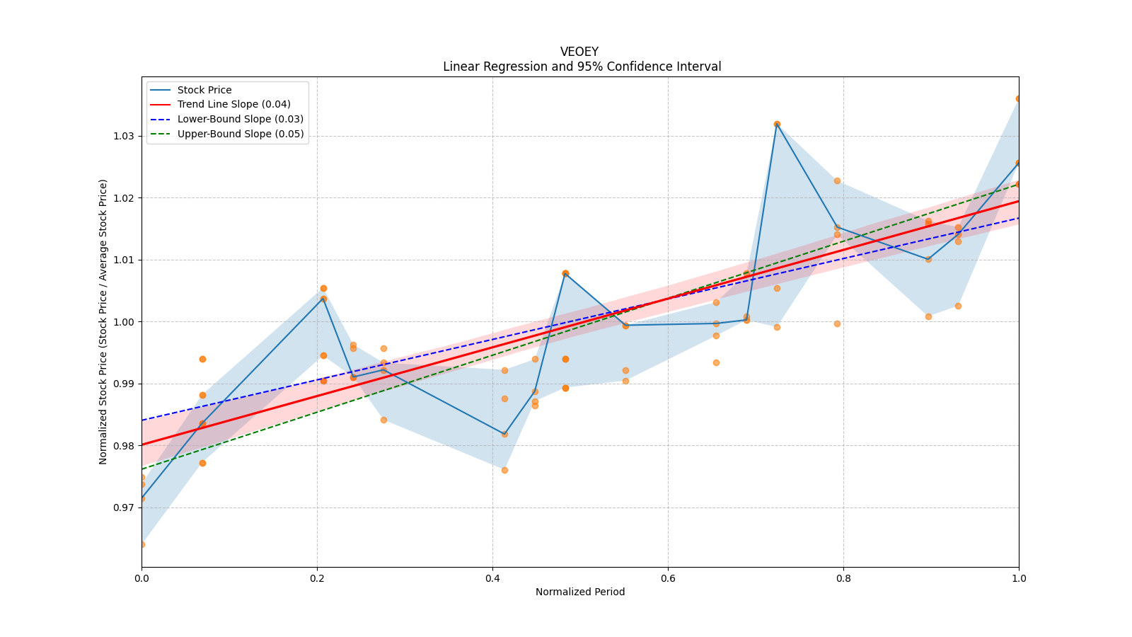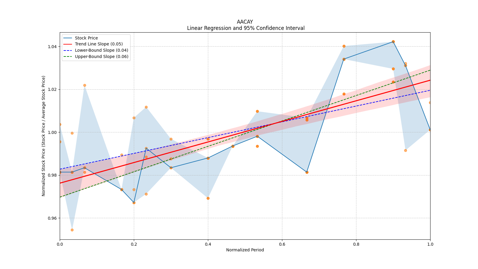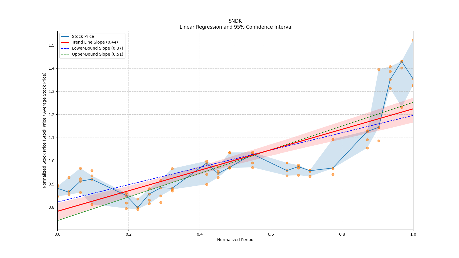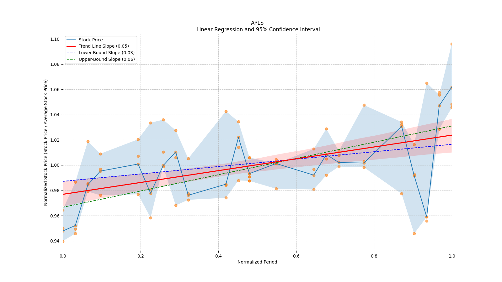 Stocks were filtered to have a high investor grade, analyzed using linear regression, and sorted by the lower-bound trendline slope. The lower-bound trendline slope has been normalized by the average stock price and calculated using a 95% confidence interval. This statistic provides a conservative estimate of stock price percentage growth, taking into account both the trends and volatility of the stock price over the past month. With these details, you can easily compare stocks by their historical performance.