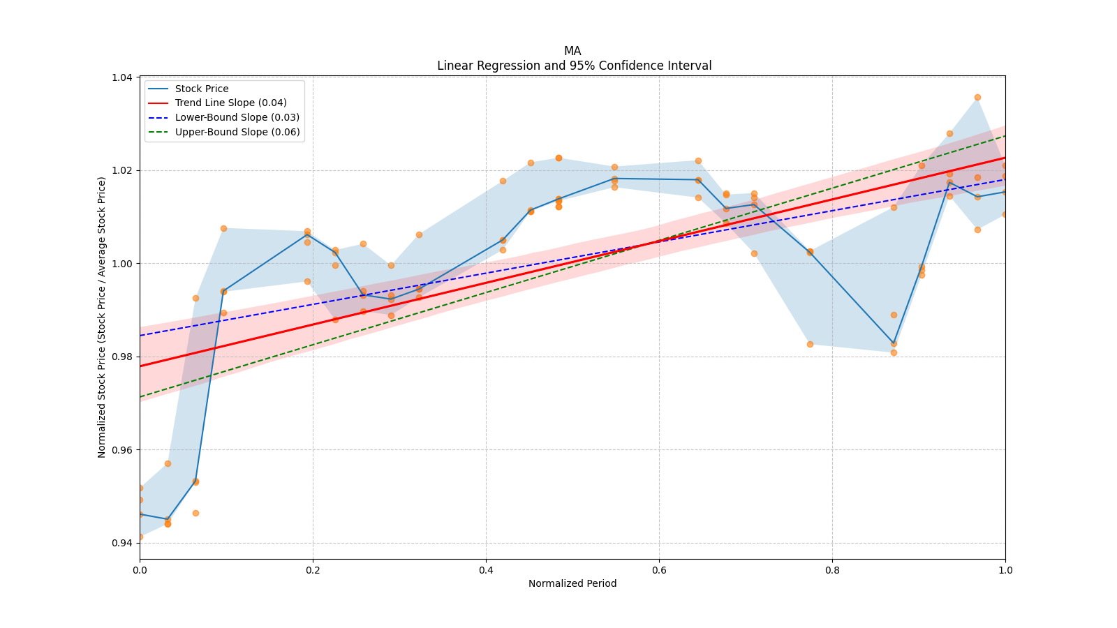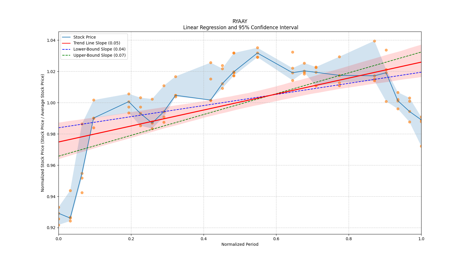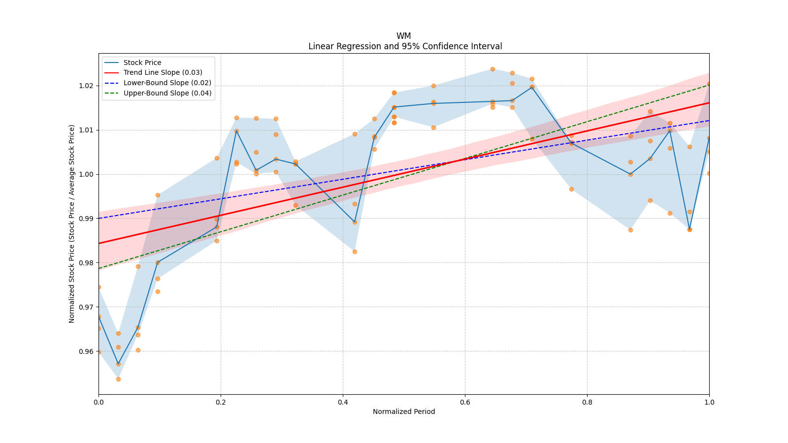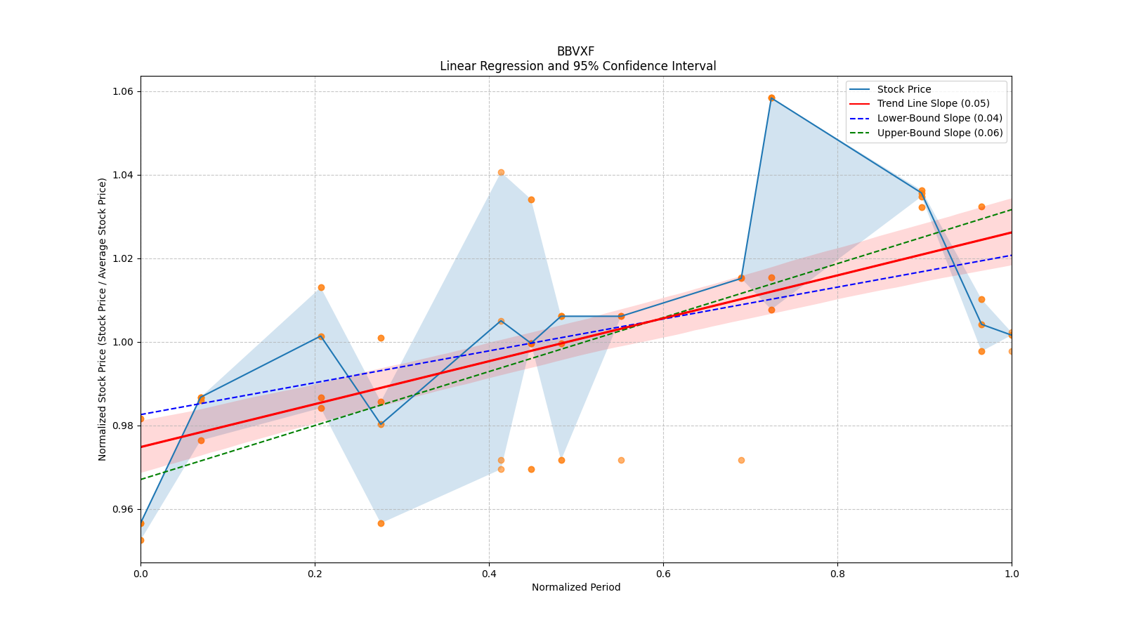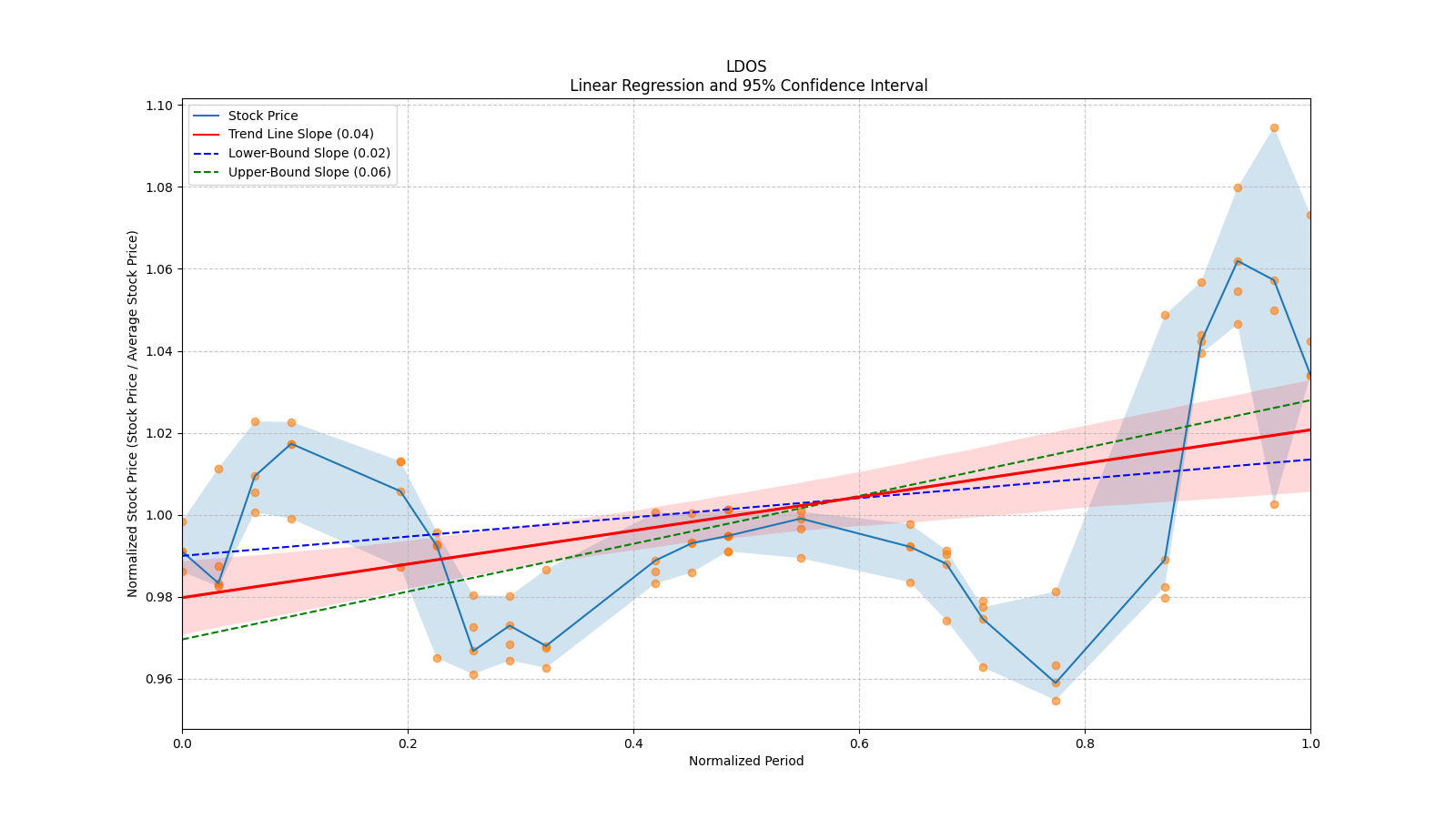 Stocks were filtered to have a high investor grade, analyzed using linear regression, and sorted by the lower-bound trendline slope. The lower-bound trendline slope has been normalized by the average stock price and calculated using a 95% confidence interval. This statistic provides a conservative estimate of stock price percentage growth, taking into account both the trends and volatility of the stock price over the past month. With these details, you can easily compare stocks by their historical performance.