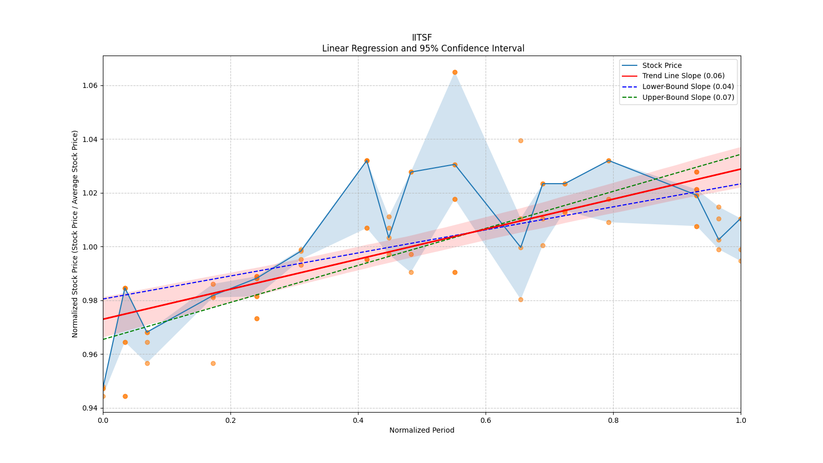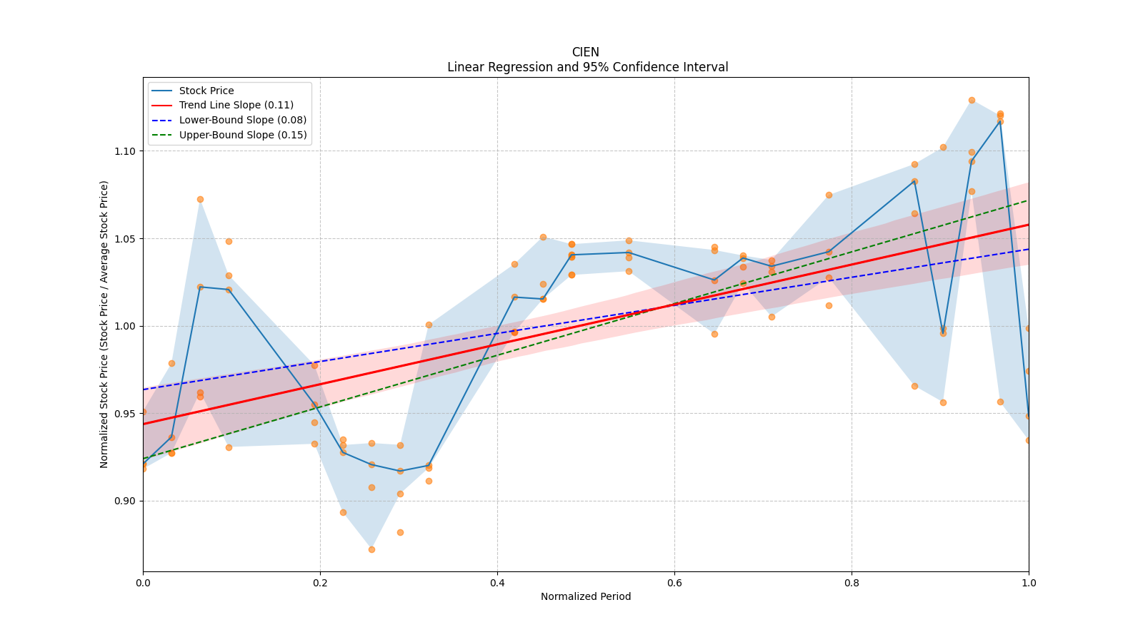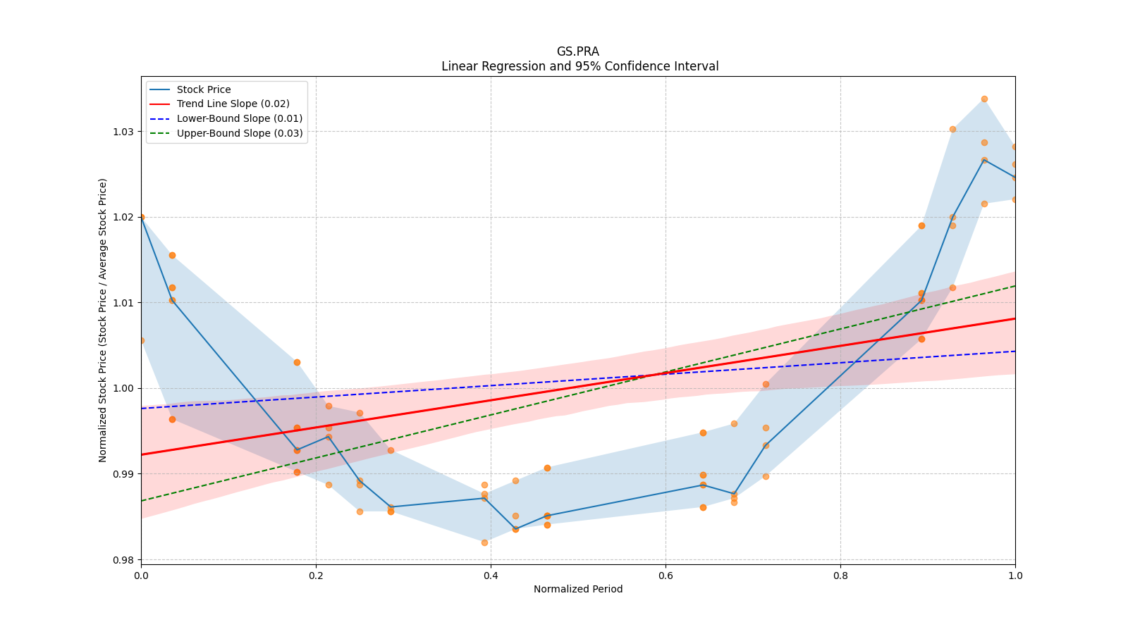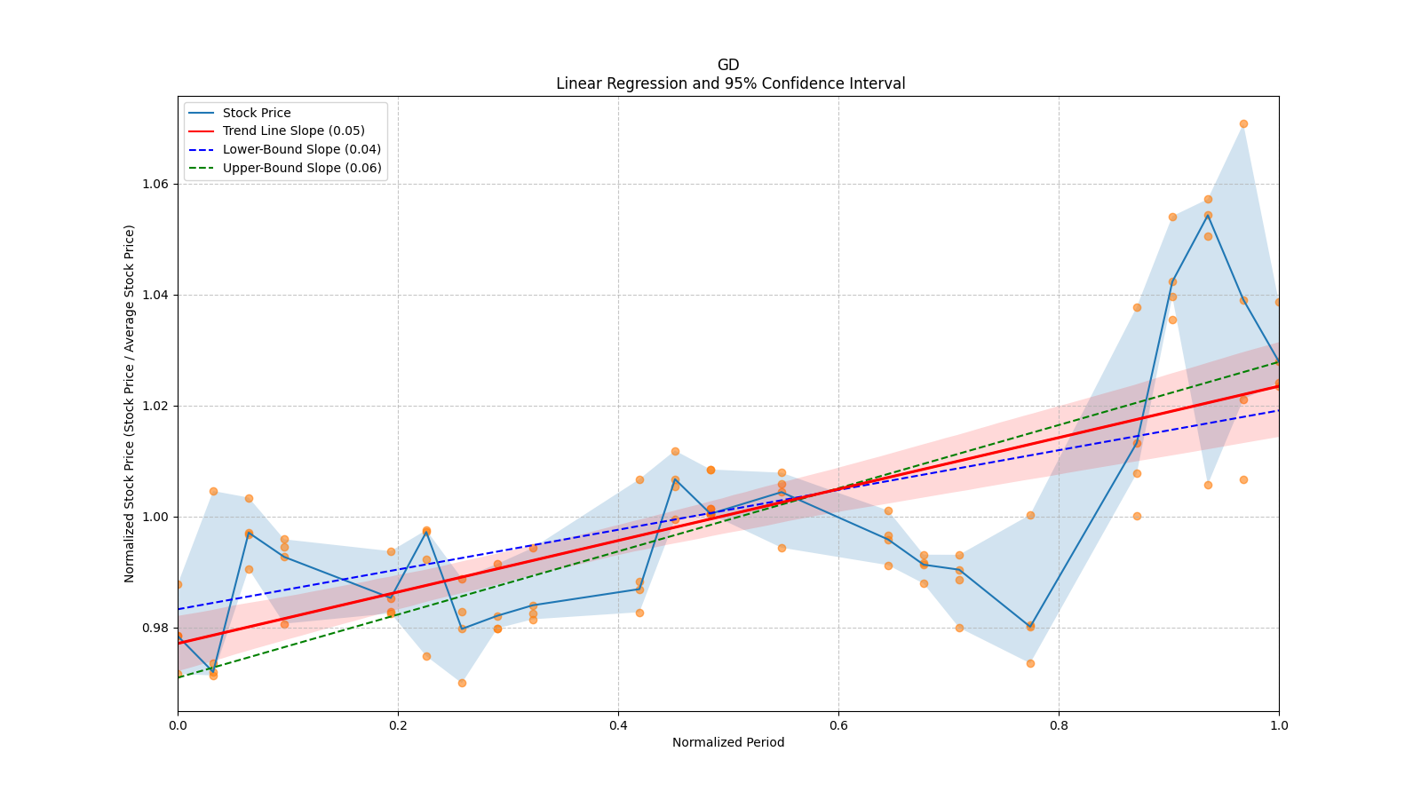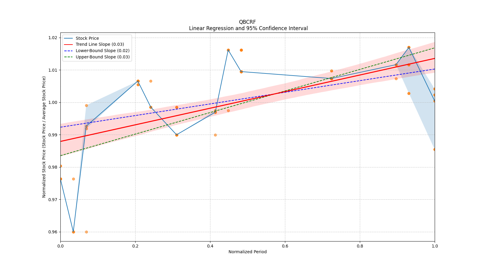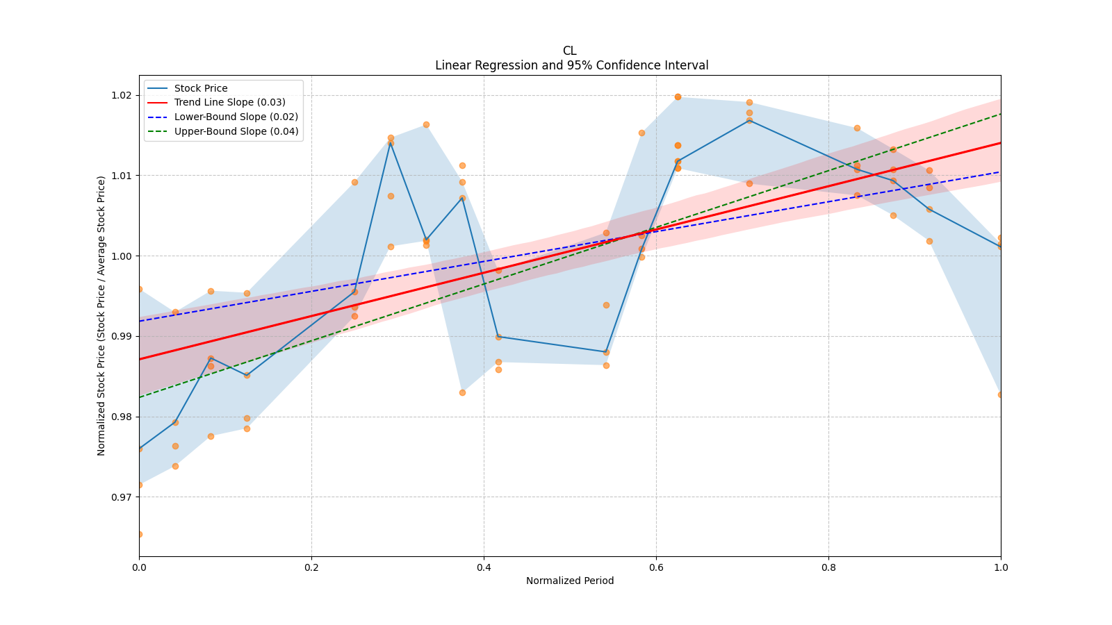 Stocks were filtered to have a high investor grade, analyzed using linear regression, and sorted by the lower-bound trendline slope. The lower-bound trendline slope has been normalized by the average stock price and calculated using a 95% confidence interval. This statistic provides a conservative estimate of stock price percentage growth, taking into account both the trends and volatility of the stock price over the past month. With these details, you can easily compare stocks by their historical performance.