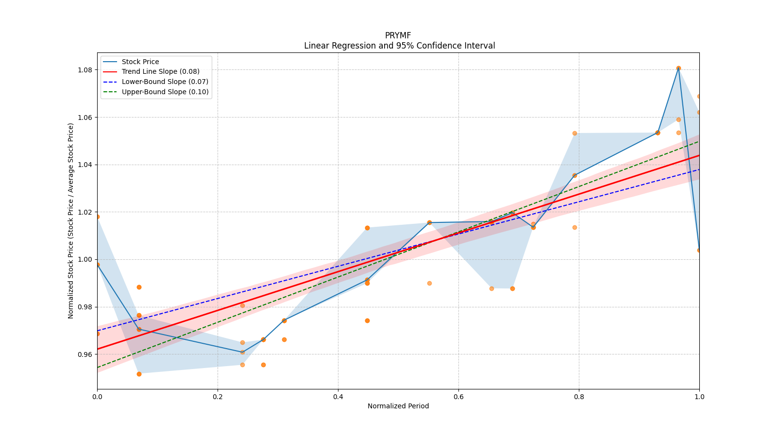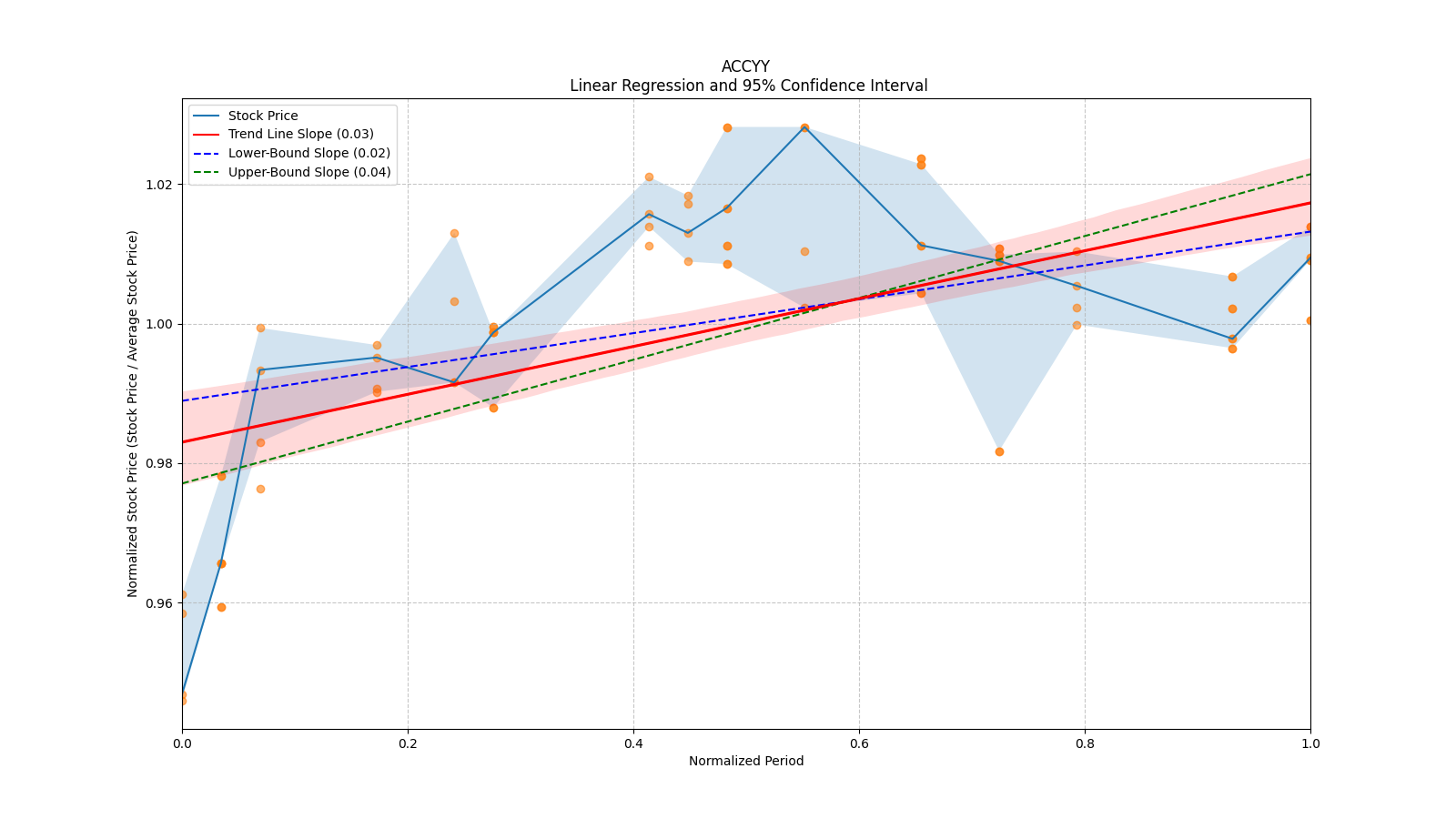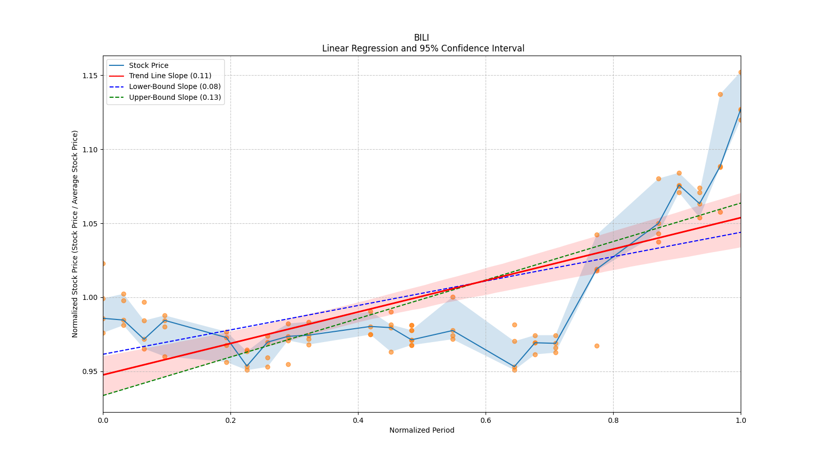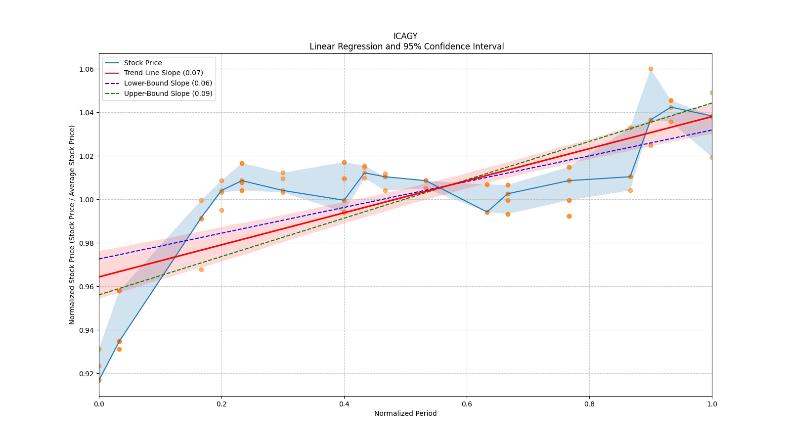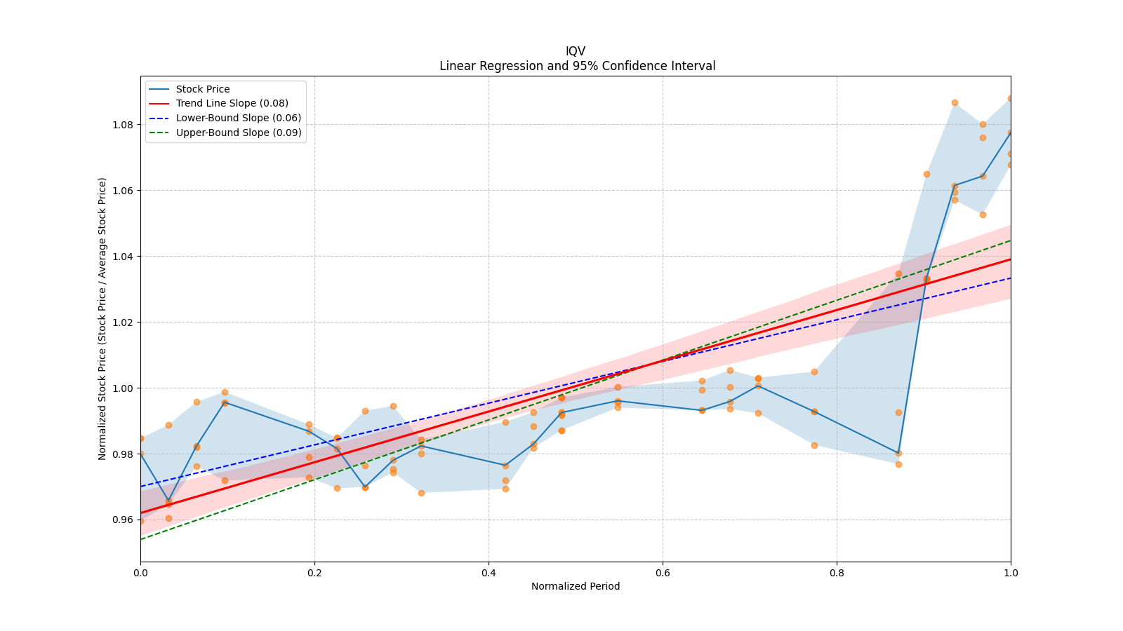 Stocks were filtered to have a high investor grade, analyzed using linear regression, and sorted by the lower-bound trendline slope. The lower-bound trendline slope has been normalized by the average stock price and calculated using a 95% confidence interval. This statistic provides a conservative estimate of stock price percentage growth, taking into account both the trends and volatility of the stock price over the past month. With these details, you can easily compare stocks by their historical performance.