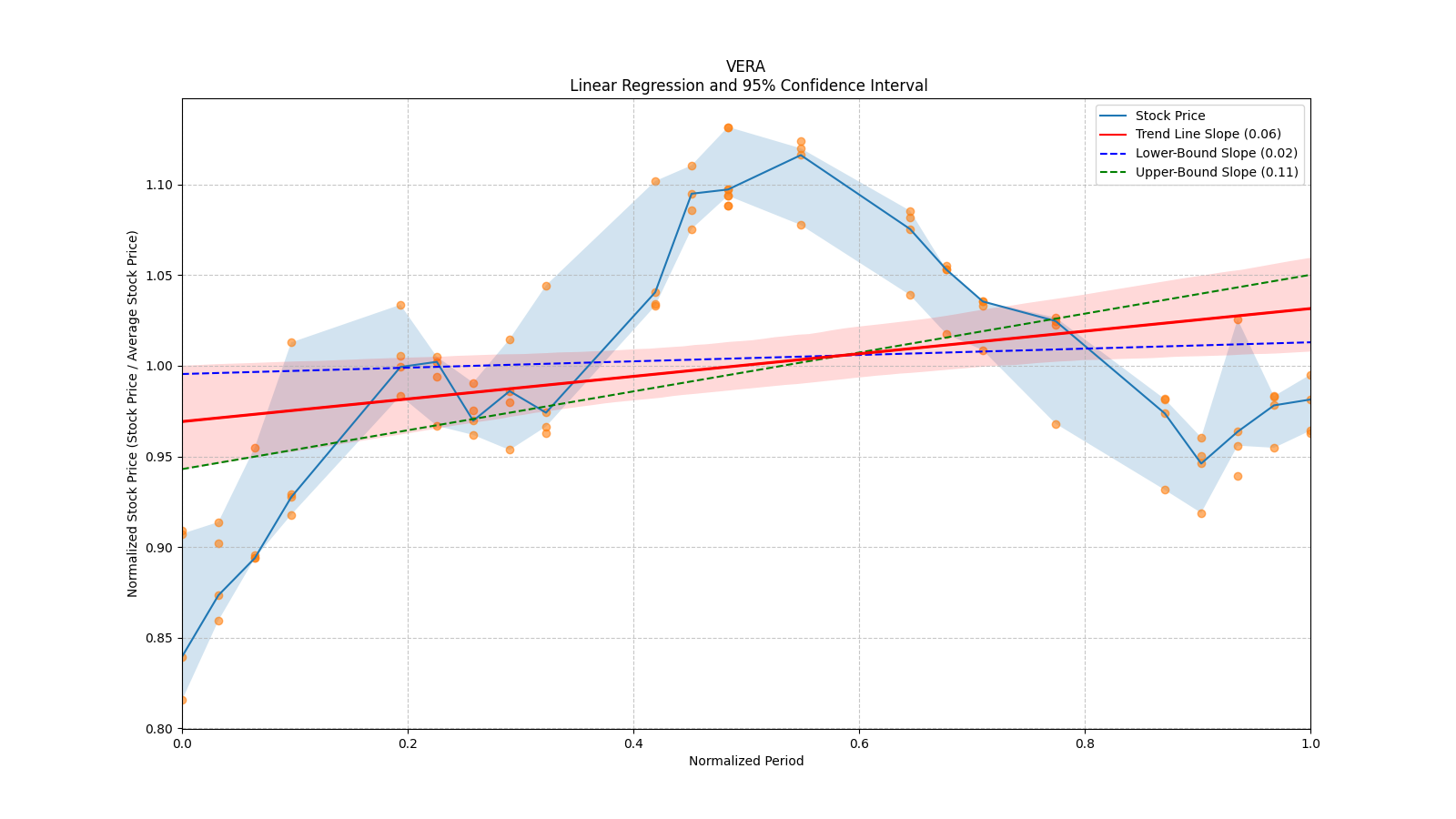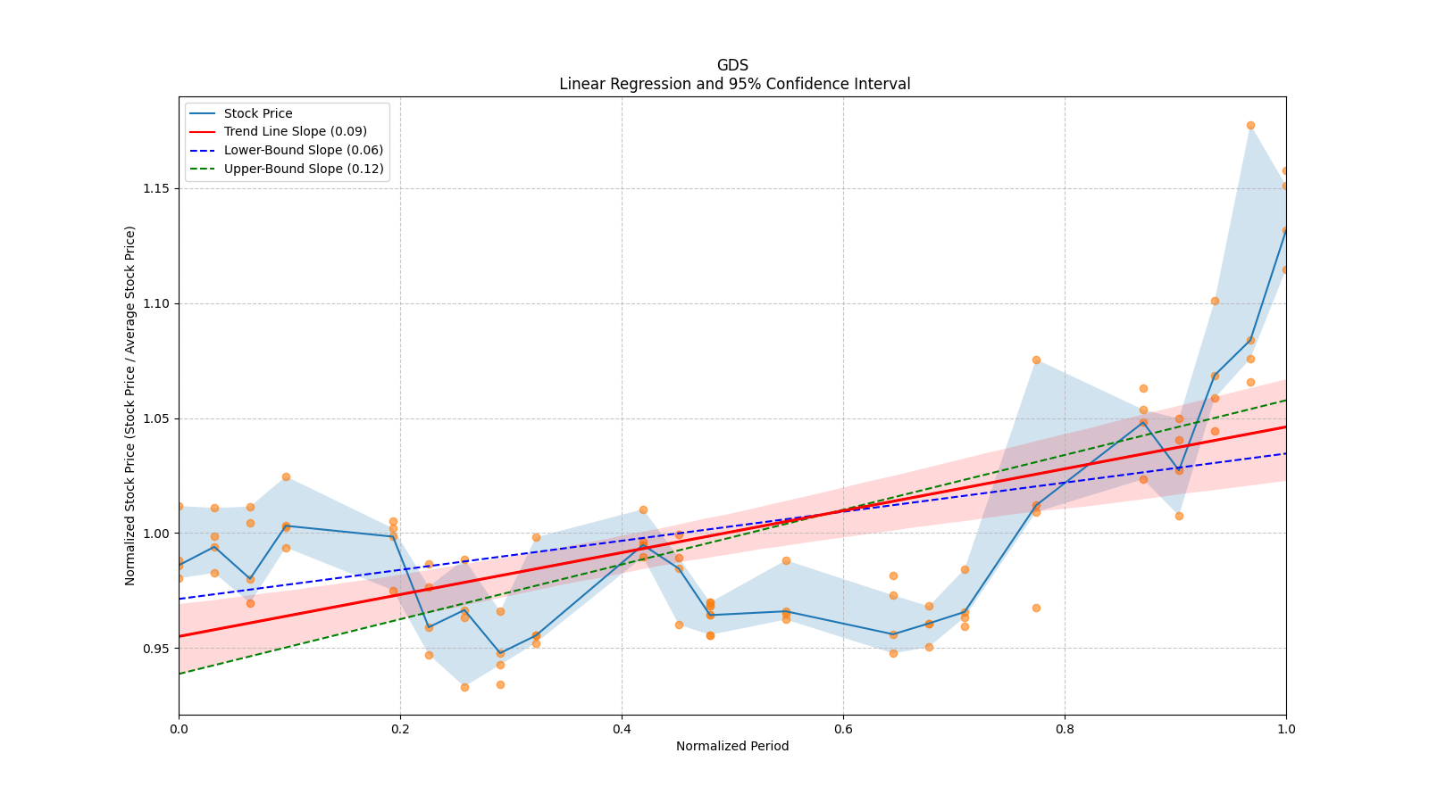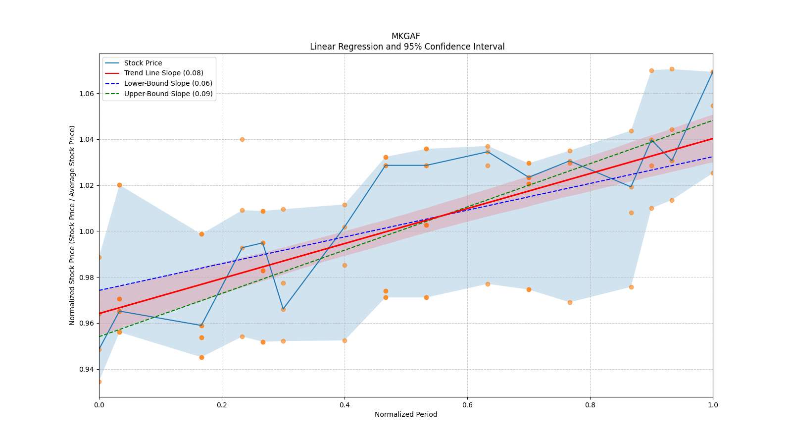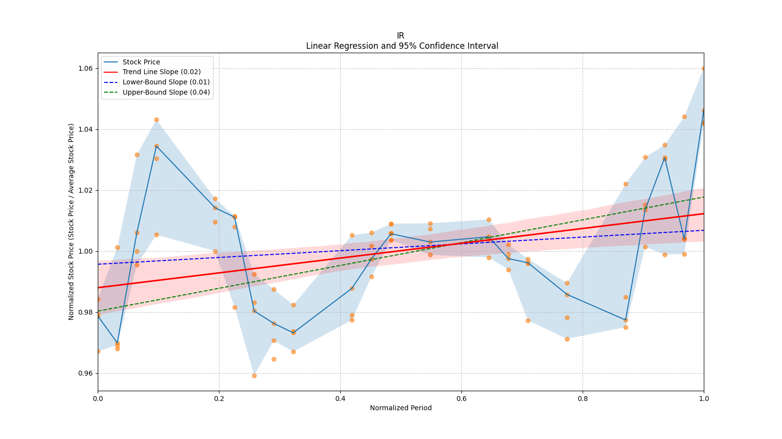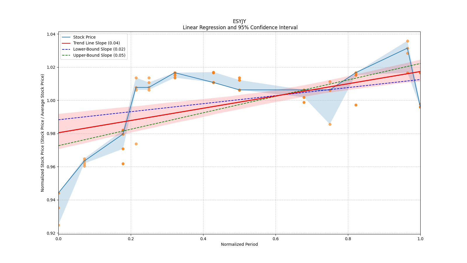 Stocks were filtered to have a high investor grade, analyzed using linear regression, and sorted by the lower-bound trendline slope. The lower-bound trendline slope has been normalized by the average stock price and calculated using a 95% confidence interval. This statistic provides a conservative estimate of stock price percentage growth, taking into account both the trends and volatility of the stock price over the past month. With these details, you can easily compare stocks by their historical performance.